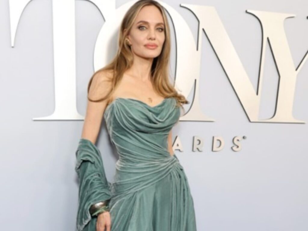 تألقت النجمة أنجيلينا جولي بأحدث إطلالة لها، حيث حضرت حفل جوائز توني بدورته الـ77 وهي ترتدي فستاناً مخملياً باللون البترولي من دار فيرساتشي Versace، تميز بثنيات منسدلة، وقد أكملت إطلالتها الساحرة من خلال شال مخملي مطابق وحذاء مماثل مصنوع من الساتان.