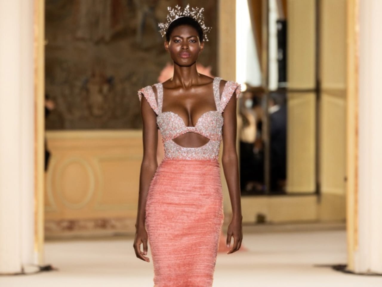 كما حضرت التصاميم الجريئة في إطلالات الخصر العاري، حيث زُرعت نباتات الأغصان والتطريزات على جهة واحدة من الفستان في طلّة أثيرية.