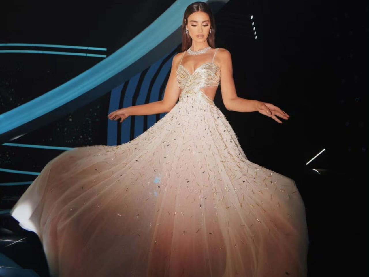 سطعت الإعلامية إيميه صياح في إطلالتها الأولى في حفل انتخاب ملكة جمال لبنان 2024، حيث ارتدت فستاناً طويلاً وواسعاً من مجموعة Stardust Voyage للأزياء الراقية لموسمي ربيع وصيف 2024، التي قدّمها طوني ورد في باريس في كانون الثاني/يناير الماضي، تميّز بتصميم Bustier مع حمالات Spaghetti Straps الناعمة والرفيعة في جزئه العلوي على شكل حرف X.