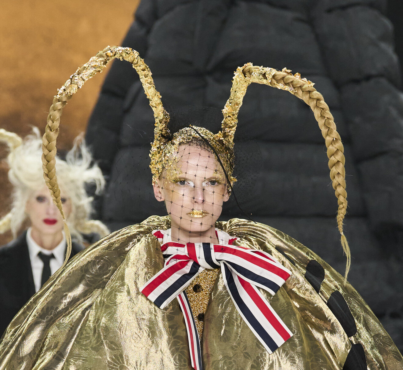 فكان البريق يسطع في كلّ زاويةٍ، إنطلاقاً من المعاطف الذهبيّة الميتاليكيّة اللّامعة في عرض Aknvas وSiriano، مروراً بالفساتين الفضّيّة الميتاليكيّة اللّامعة في مجموعة Alex S Yu من الأزياء الجاهزة لموسم خريف وشتاء 2024 – 2025، وصولاً إلى أزياء Anna Sui المتلألئة بحبيبات الترتر.