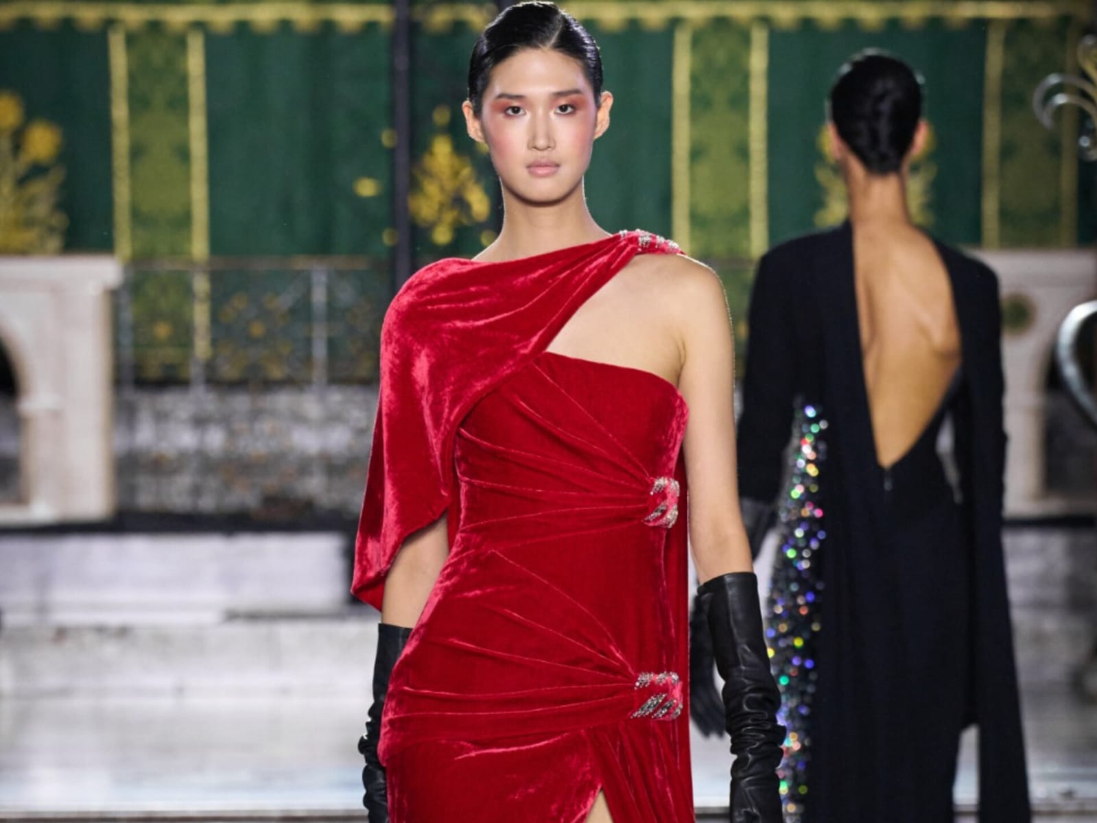 بألوانٍ قويّة، صمّم جورج شقرا الأزياء الراقية بقماش مخملي تميّز بتصاميم جريئة تجسّد قوّة المرأة الأنيقة خير تجسيد.