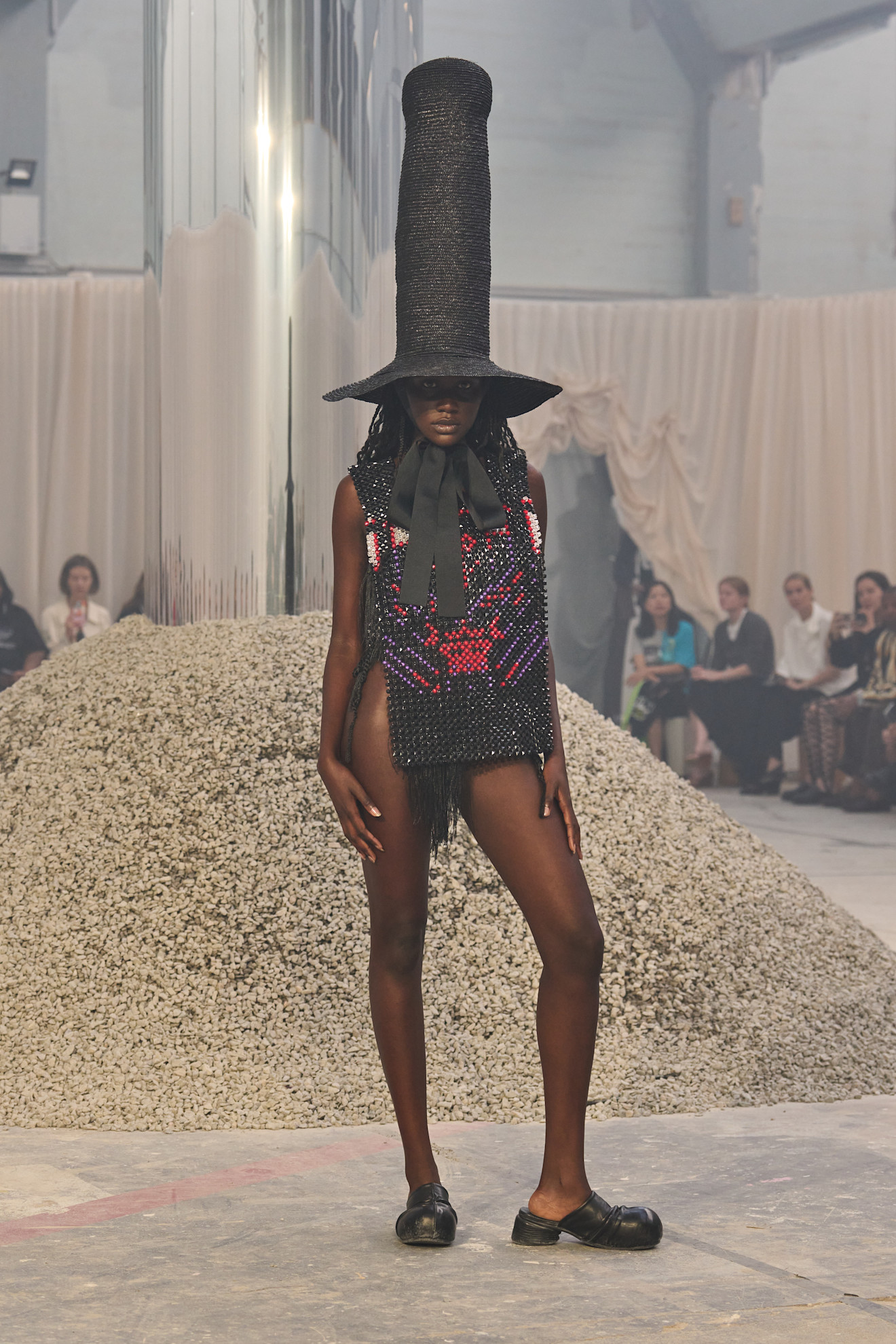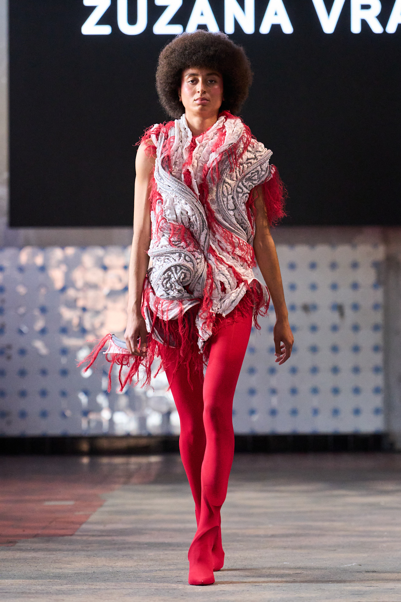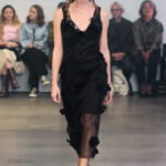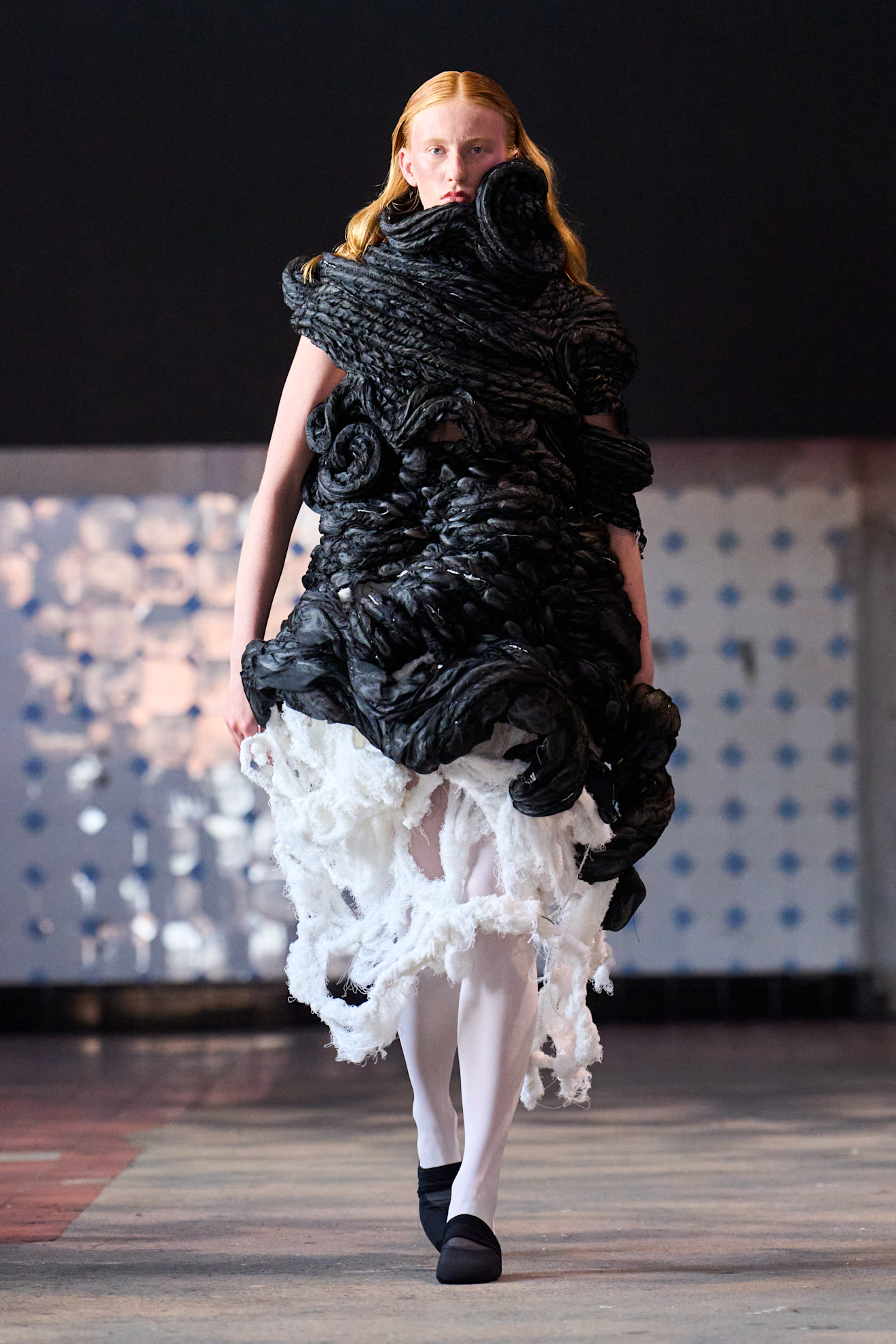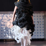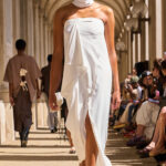 في المقابل، اعتمدت علامات مثل Henrik Viskov و MKDTمقاربة أكثر حدة، حيث ظهرت الفساتين الطويلة بتصاميم بنيوية أو بخطوط هندسية واضحة، ما أضفى عليها بُعدًا معماريًا يوازن بين الرقة والقوة.