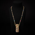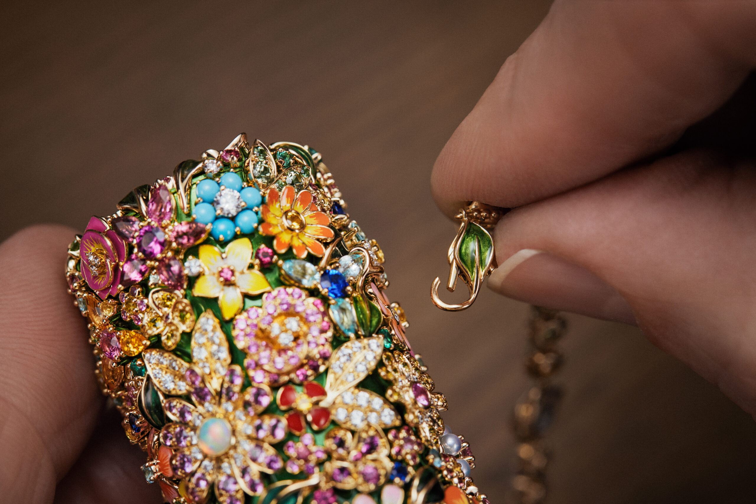 في عمل متكامل بين المجوهرات والميكانيكا الرفيعة، تتحول العلبة إلى عقد رائع بفضل سلسلة ذهبية مستوحاة من مجموعة Mimirose، مزيّنة بزهور ملوّنة، ويمكن ارتداؤها بسهولة وسلاسة، لترافقك لمسة الجمال هذه أينما ذهبتِ.