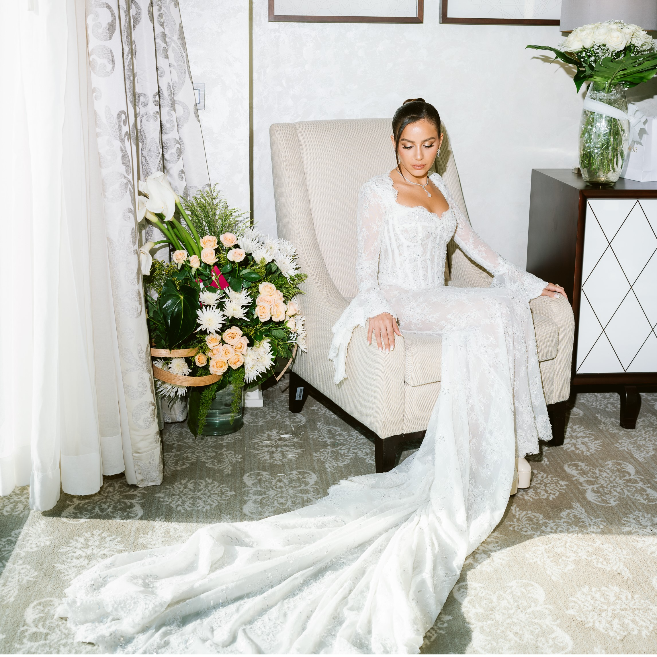 وأتى الفستان مشغولاً بالدانتيل الرقيق المطرّز ومزداناً بحبيات الكريستال البرّاقة في أجواء احتفالية لامعة نقلت اطلالة العروس إلى مستويات أعلى من الأناقة.