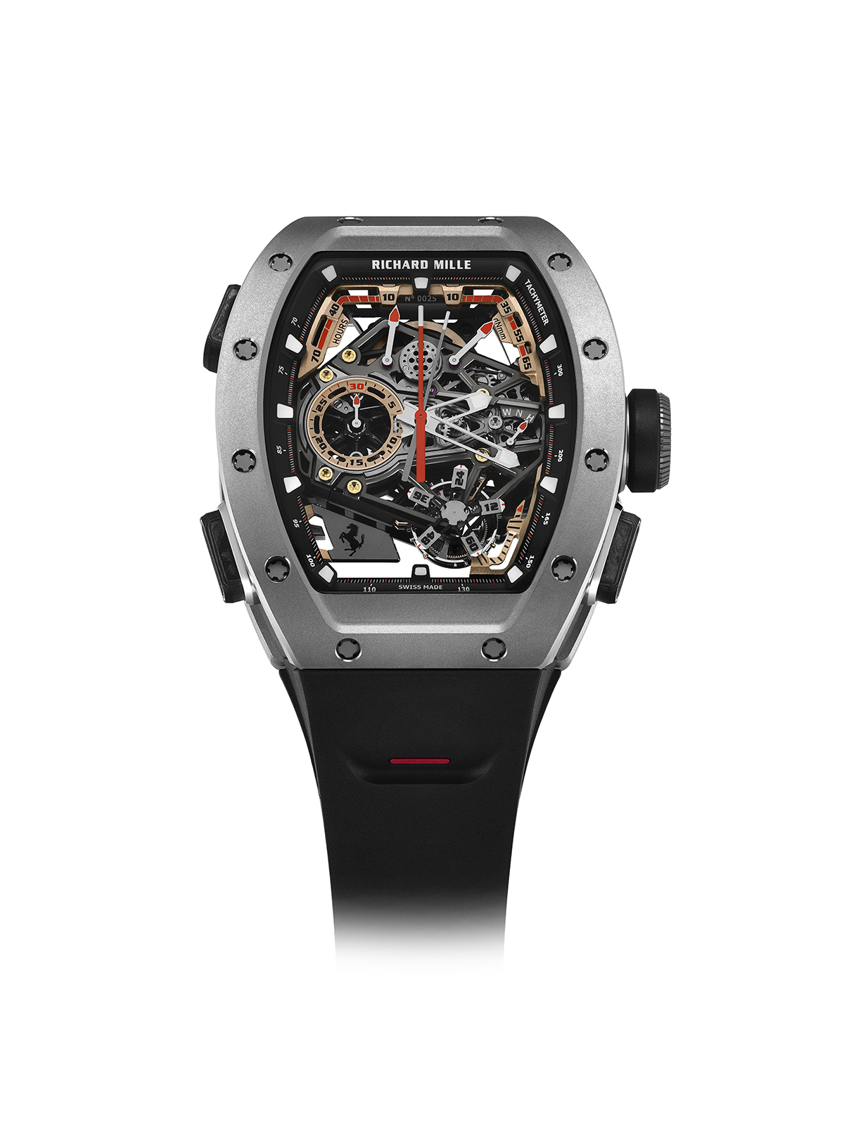 لأول مرة في تاريخ ريتشارد ميل، يظهر الرقم المرجعي الآن على آلية الحركة نفسها، محفورًا على ظهر صفيحة القاعدة مع نجوم على كلا الجانبين، ليعكس رمز VIN على كتلة محرك فيراري. وللمرة الأولى، يظهر شعار فيراري التاريخي F الكبير على ساعة ريتشارد ميل على الإطار الخلفي.