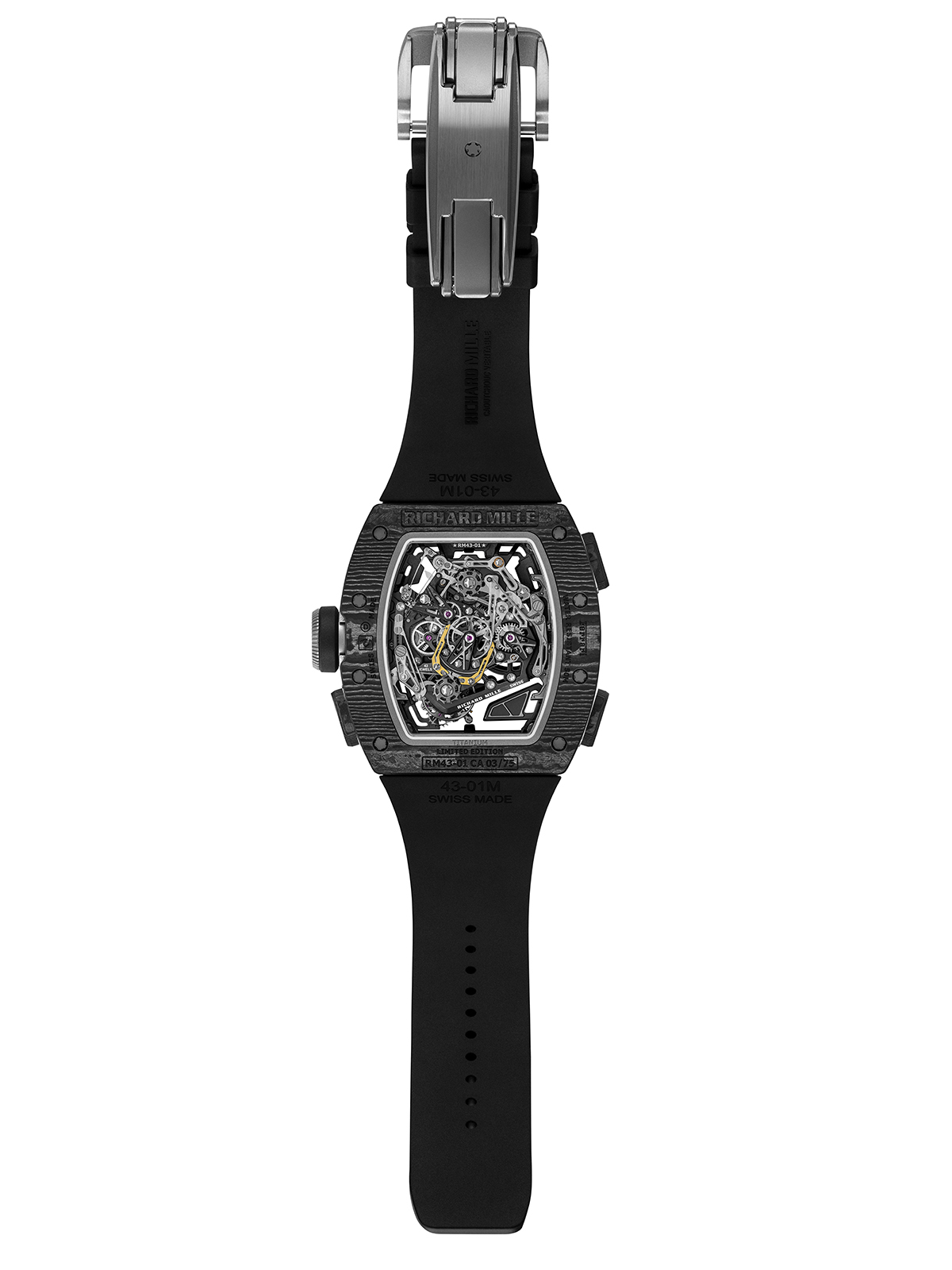 تُعدّ ساعة RM 43-01 Tourbillon Split-Seconds Chronograph Ferrari ، ثاني ساعة من ريتشارد ميل تحمل بصمة حصان فيراري الشهير خلال شراكتهما التي استمرت خمس سنوات، حيث عُرضت على صفيحة تيتانيوم مُعلّقة عند الساعة السابعة.