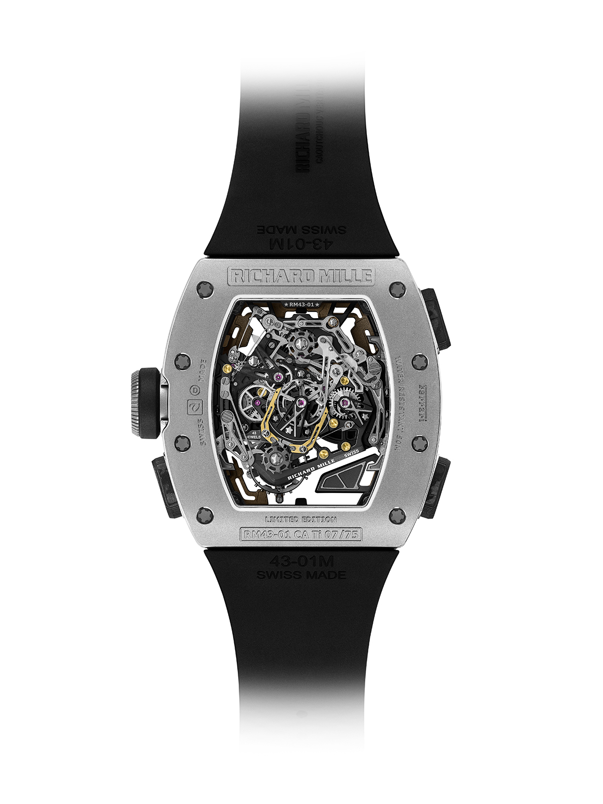 صُمّم عيار RM43-01 بقاعدة من التيتانيوم من الدرجة الخامسة فائقة الهيكلة، مقترنة بجسور مصنوعة من التيتانيوم من الدرجة الخامسة وكربون TPT®، ما يضمن صلابة ومقاومة مُحسّنة للاهتزاز والصدمات. يسمح هذا التصميم لمجموعة التروس بالعمل بسلاسة، وللتوربيون المُزاح بتحمل التسارع الشديد. وقد خضع لاختبارات صارمة في ريتشارد ميل لتحمل صدمات تتجاوز 5000 جي.