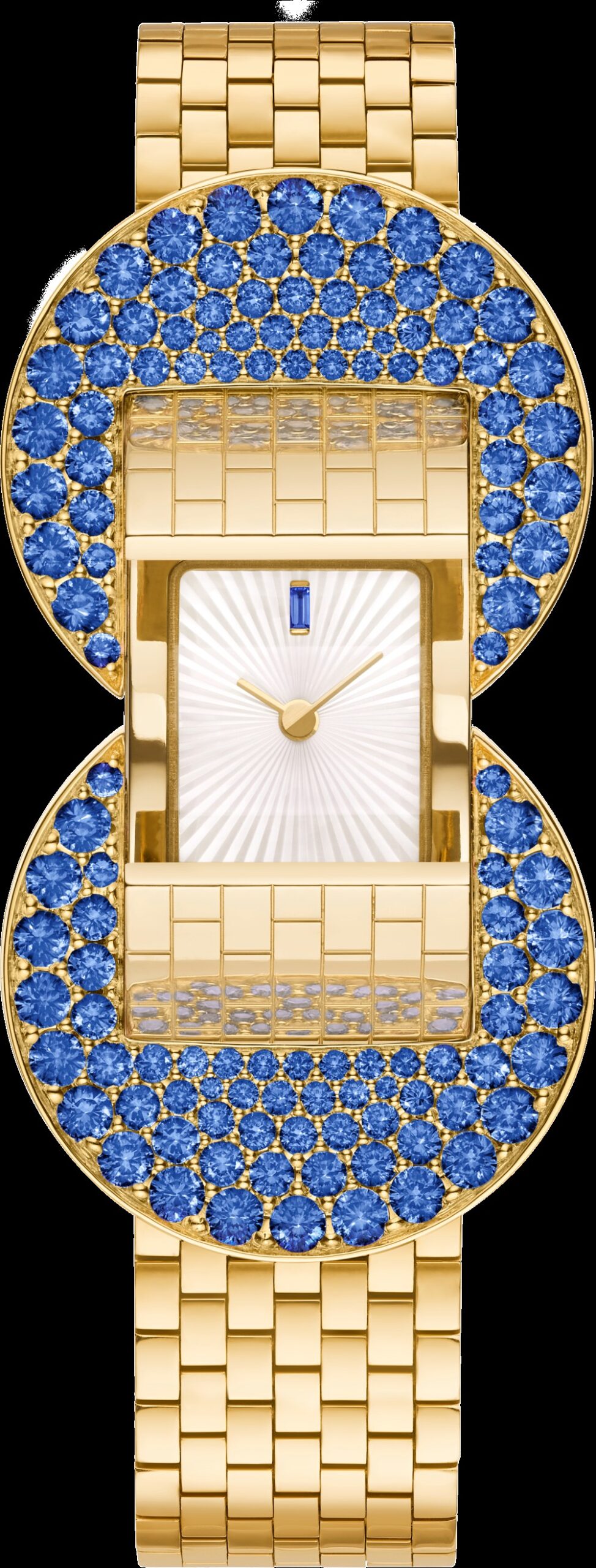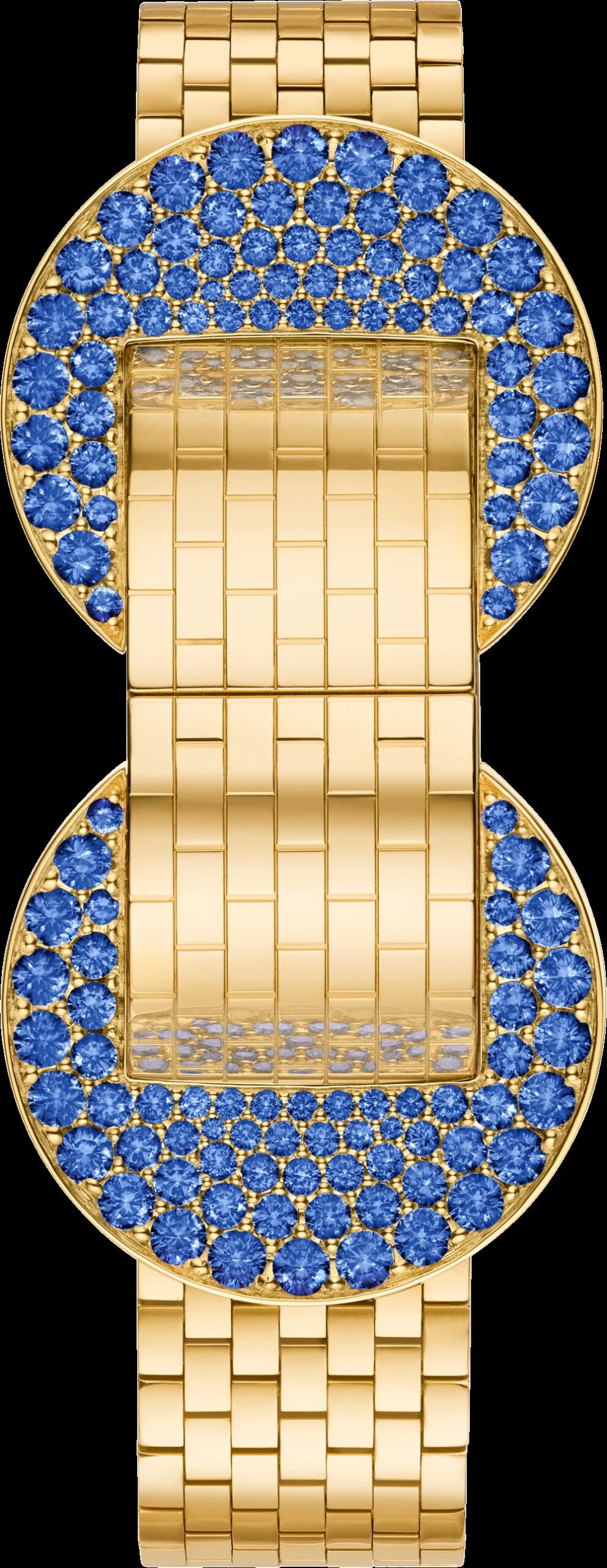 تتميّز الساعة بسوار مرن مؤلف من وصلات ذهبية مصقولة يدوياً، تنسج حول المعصم بانسيابية تشبه النسيج الفاخر. ويتناغم الذهب الأصفر مع زرقة السافير المكثّفة، حيث رُصّعت الأحجار على شكل زخارف هلالية تضفي بعدًا بصريًا آسرًا.
