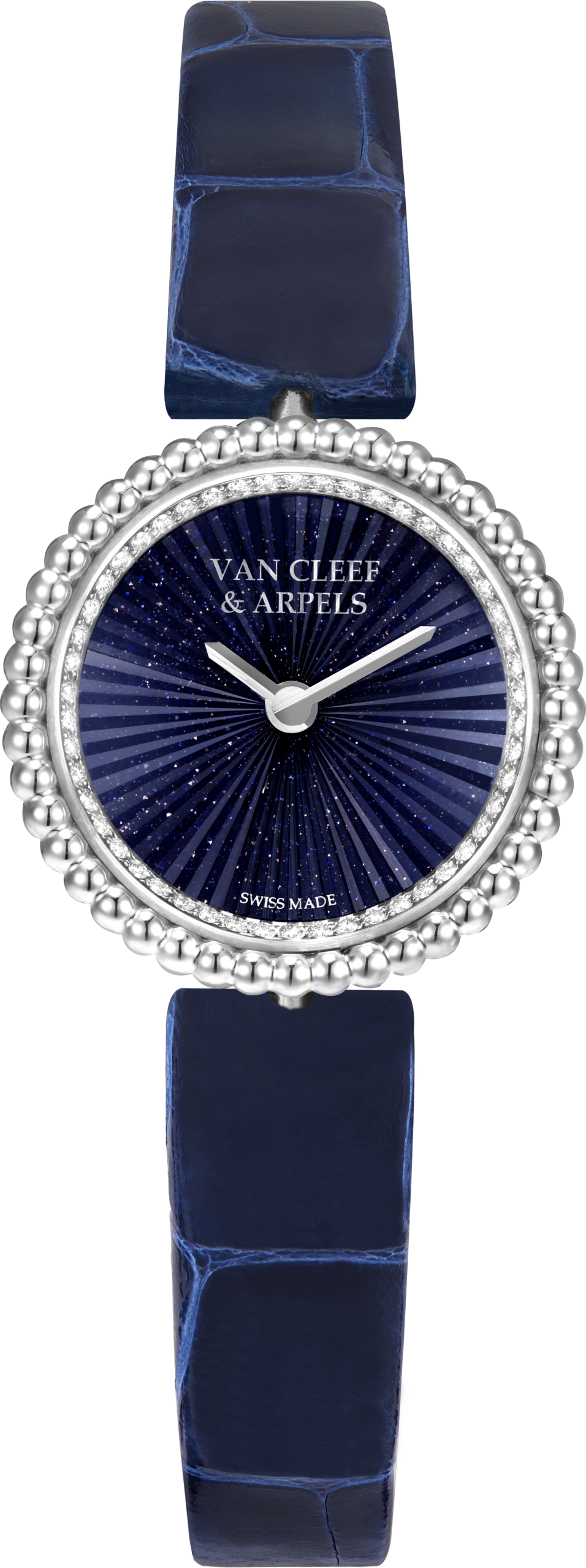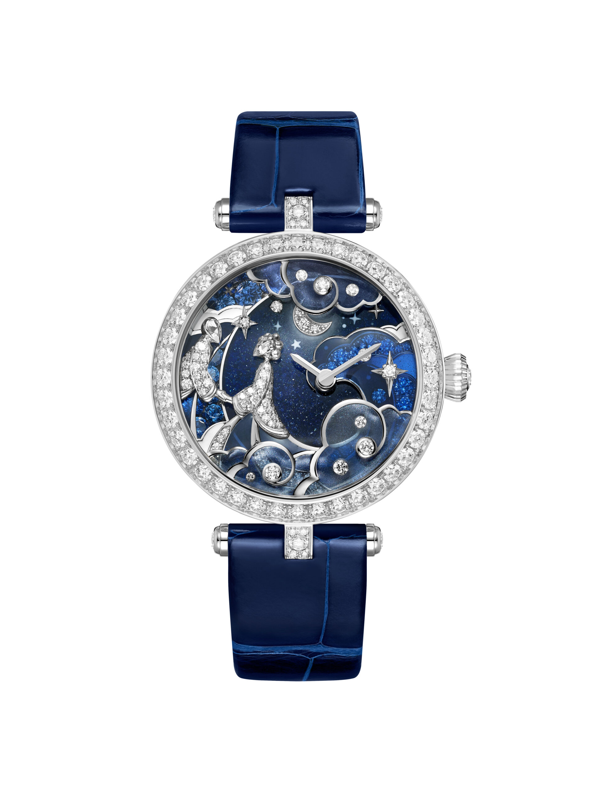 صُنعت الساعة من الذهب الأبيض، ويحيط بقرصها صفّان من الحبيبات المصقولة بعناية فائقة، بينما يكشف الوجه عن خلفية من زجاج الأفنتورين، الذي يعكس بريقًا أزرق عميقًا يحاكي اتساع الكون.