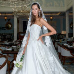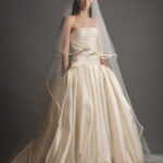 حتى الطرحة الطويلة — رمز الزفاف الأبدي — تعود بخطوط نقية بلا تطريز، بينما تتناغم مع أقراط لؤلؤية صغيرة أو إكسسوارات شعر بسيطة من الذهب الأبيض.