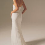 الفستان الأبيض يظهر بقصّات مستقيمة ونقاءٍ لونيّ مطلق، حيث يترك التصميم للأقمشة الفاخرة مهمة السحر: كريب دوشين، الحرير الإيطالي السميك، والمخمل المطفأ.