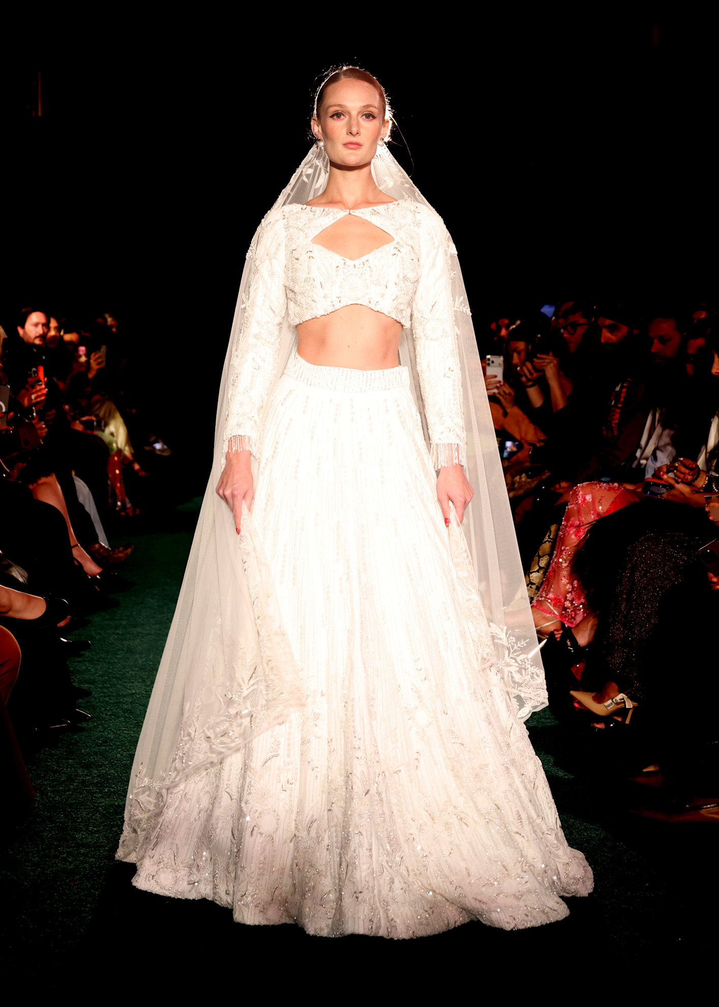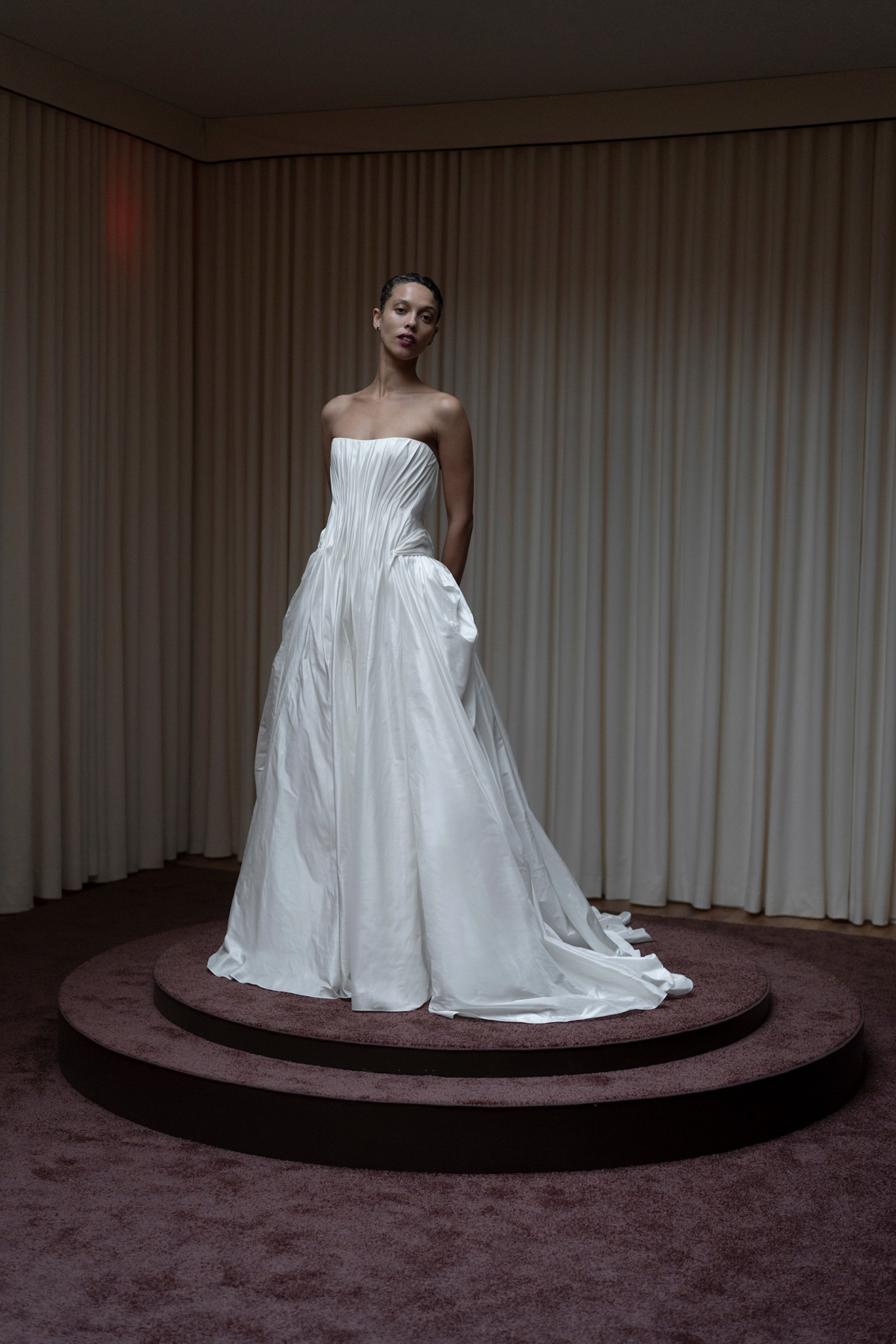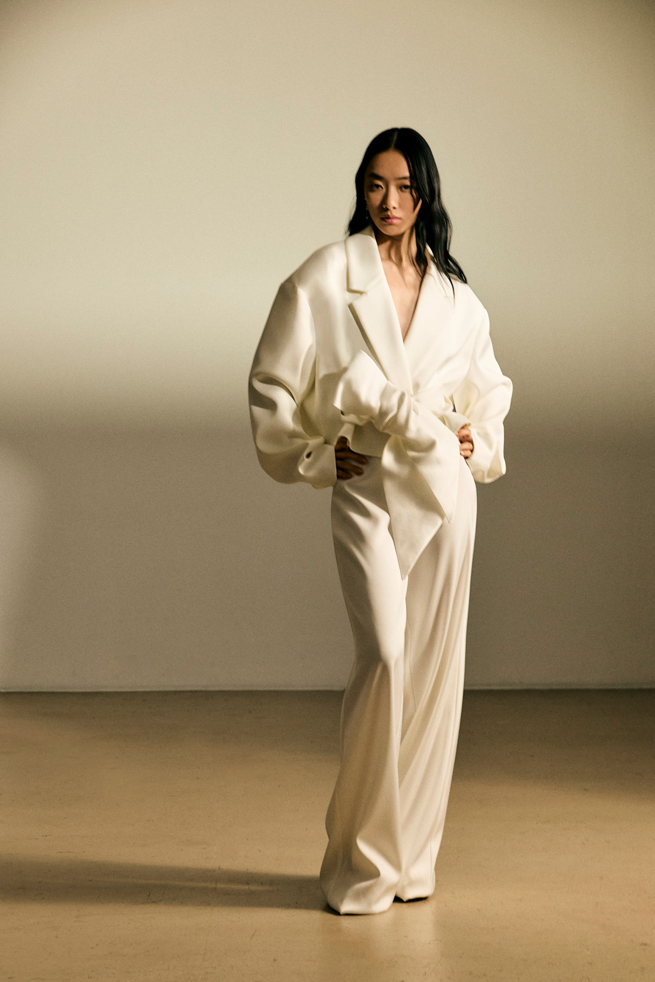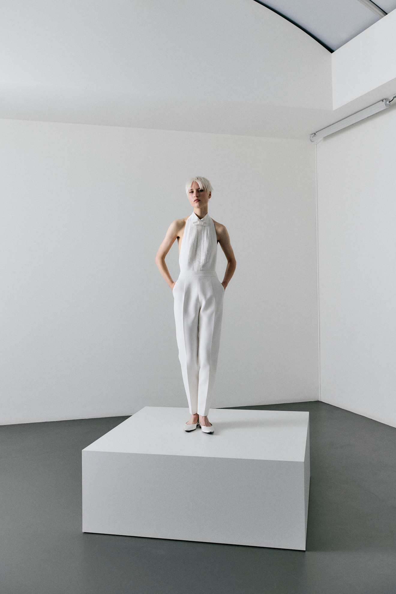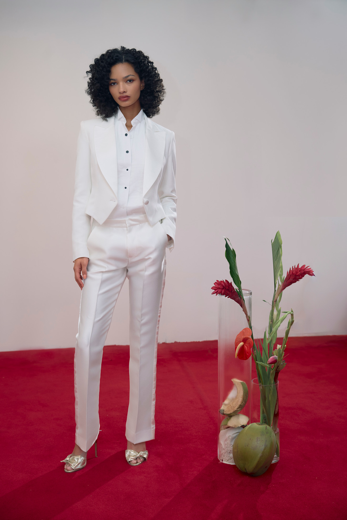 الفستان الأبيض يظهر بقصّات مستقيمة ونقاءٍ لونيّ مطلق، حيث يترك التصميم للأقمشة الفاخرة مهمة السحر: كريب دوشين، الحرير الإيطالي السميك، والمخمل المطفأ.