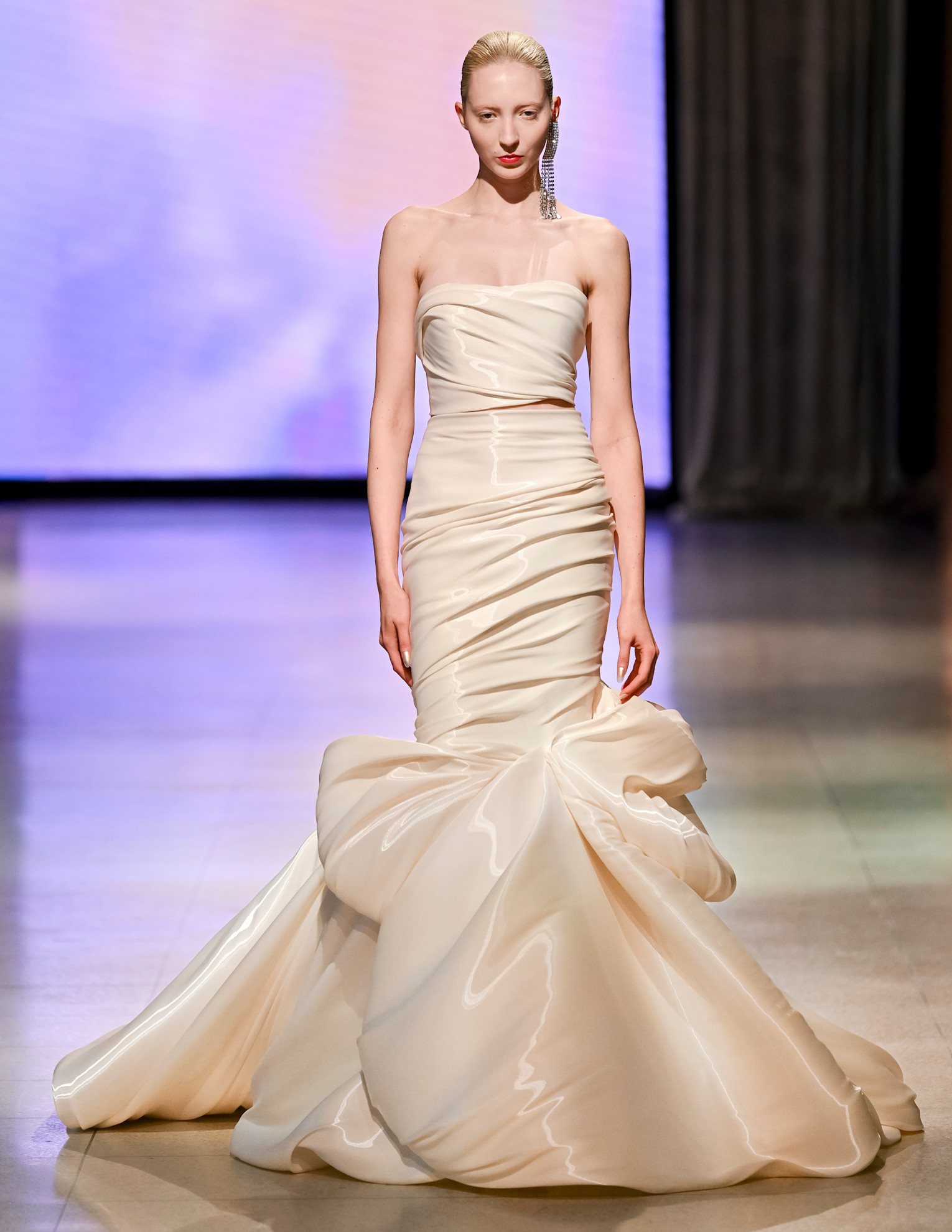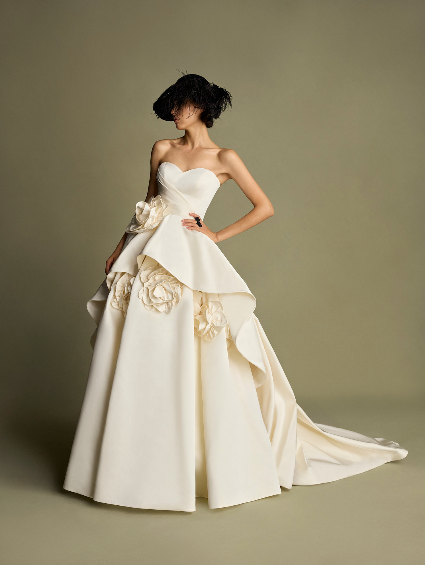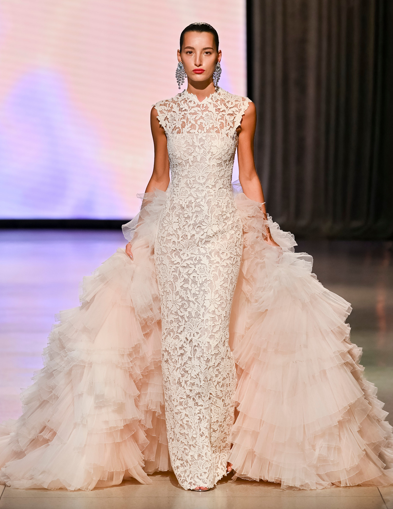 نرى فساتين بأكمام تمتد حتى أطراف الأصابع، أو تنانير تنفتح كبتلات زهرة ضخمة مع كل حركة، دون أن تفقد رشاقتها. تستمد هذه التصاميم قوتها من التناقض الجميل بين الهشاشة والعظمة، بين ما يبدو خفيفًا كنسمة، وما يُبنى بعناية كمنحوتة فنية.