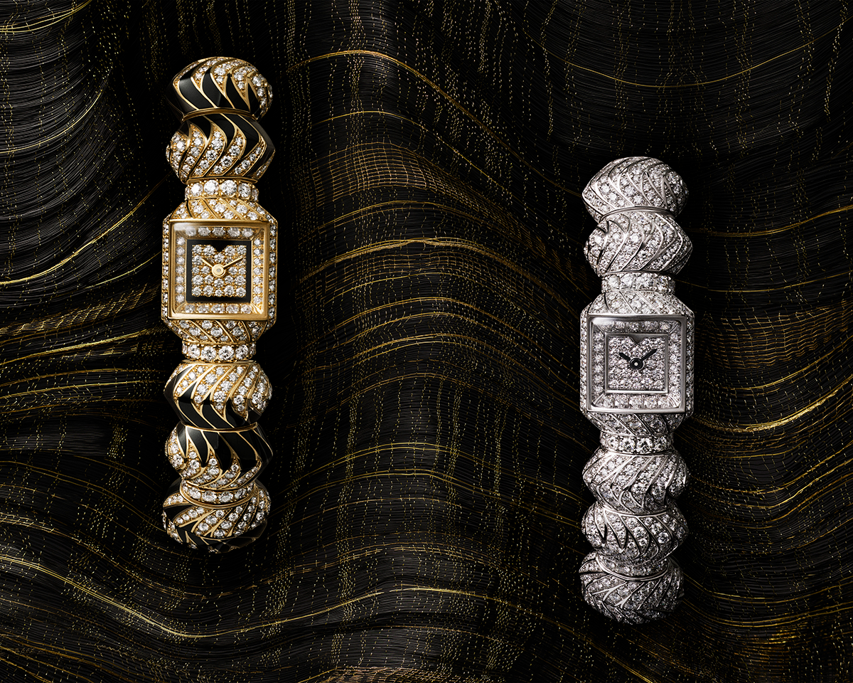 أما النسخة الأكثر فخامة، فتأتي مغطاة بالكامل بالألماس، حيث تتلاشى الحدود بين الخطوط والأشكال تحت تأثير انعكاسات الضوء، لتضاعف الإحساس بالغموض وتحوّل الساعة إلى تجربة بصرية متغيّرة مع كل حركة.