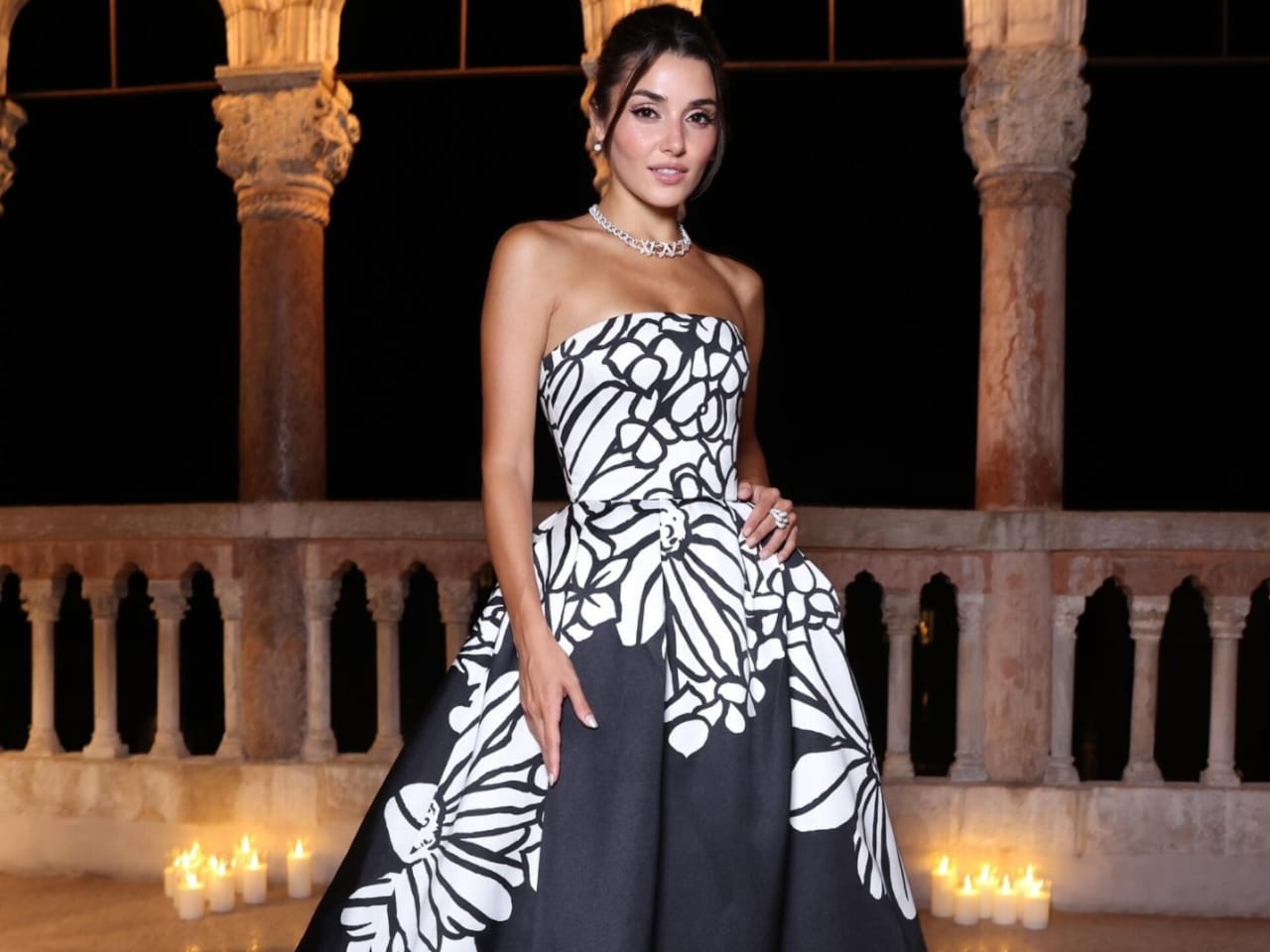 تألّقت هاندا أرتشيل في مهرجان البندقية السينمائي بفستان أسود طويل رائع حمل توقيع إيلي صعب، جاء مطبّعاً ببتلات الزهور البيضاء التي غطّت منطقتي الصدر والخصر وإمتدت على جانبي الفستان، ما أضفى رونقاً مميزاً على إطلالتها. كما جاء الفستان بتصميم قصة الصدر الكات وبدون أكمام لتكتمل إطلالتها الراقية.