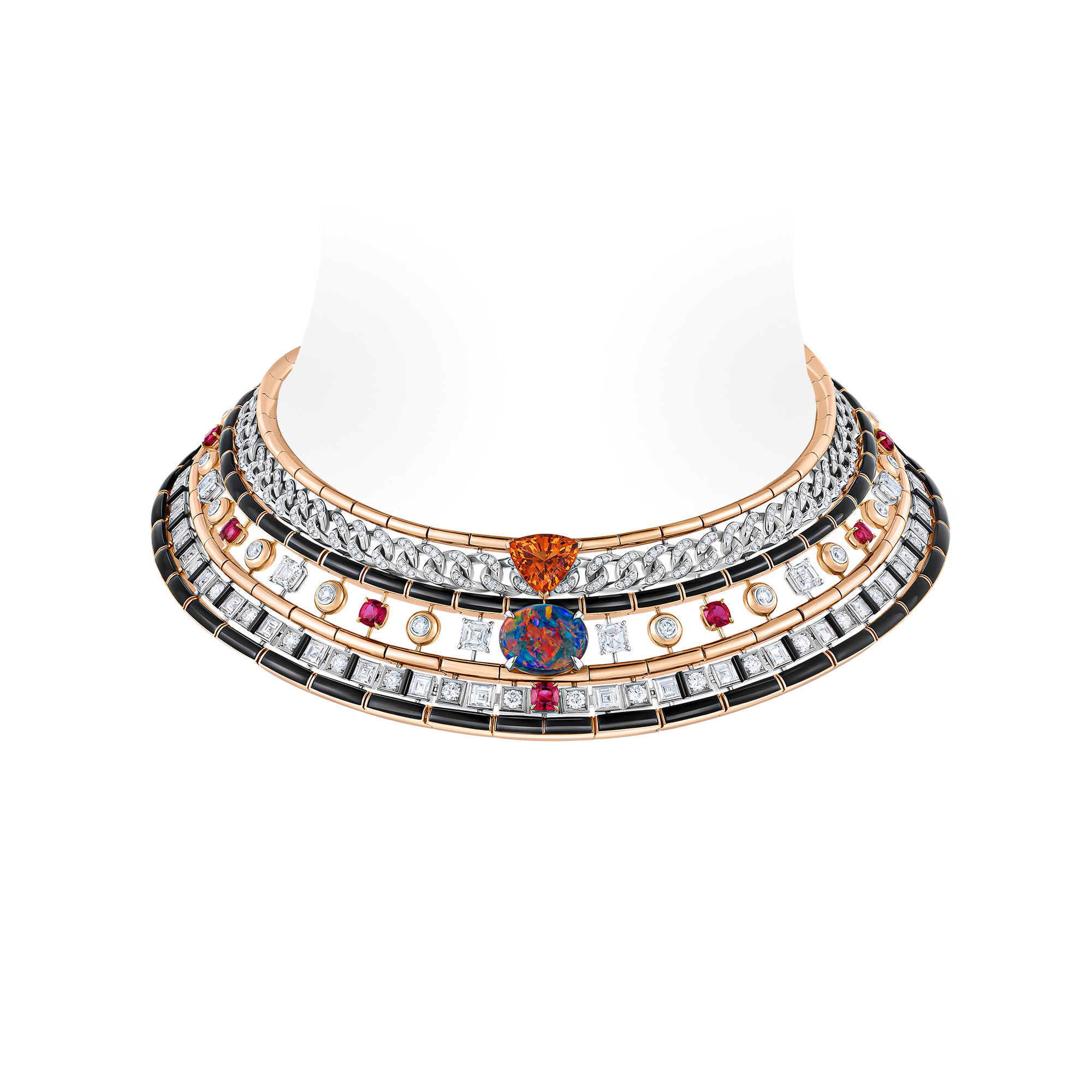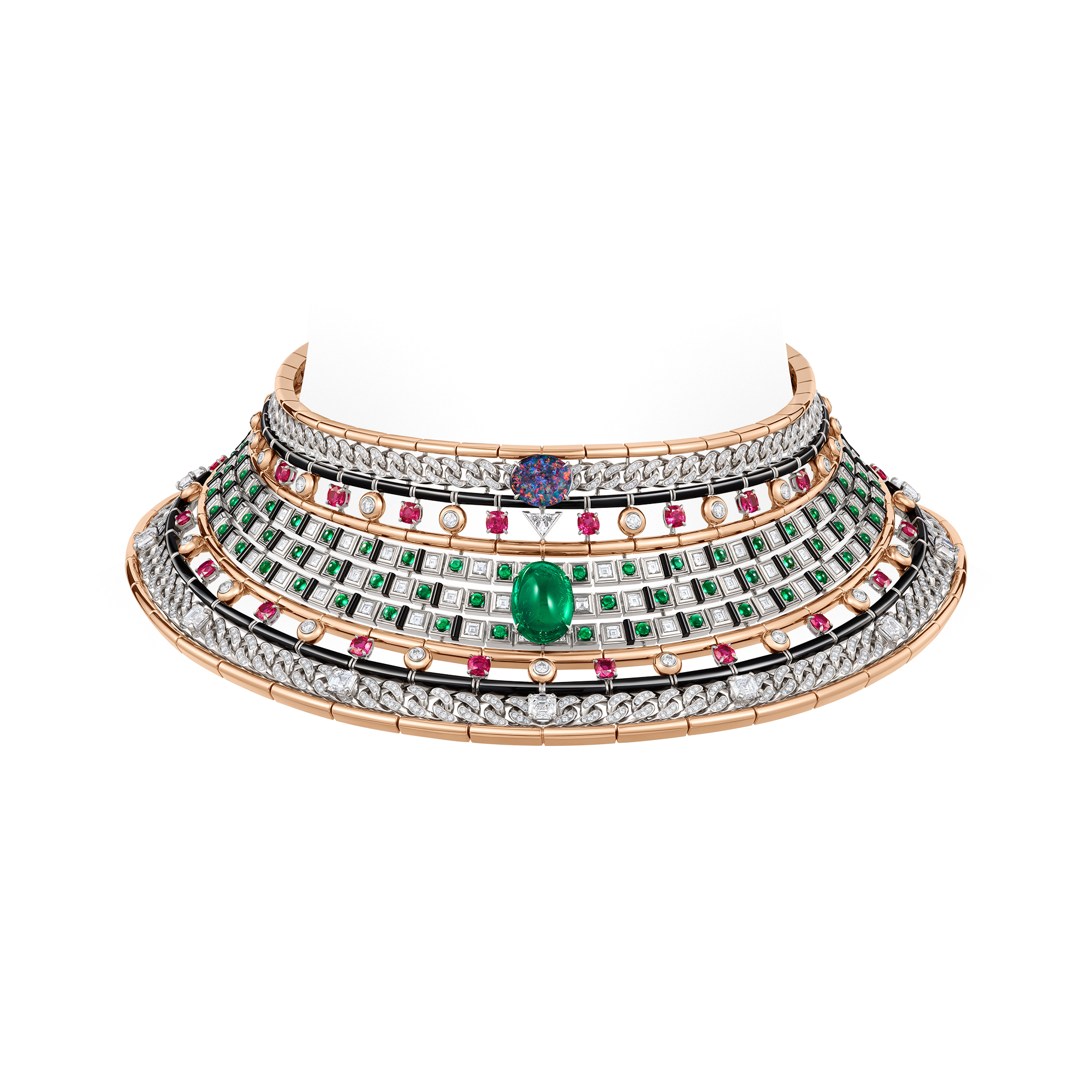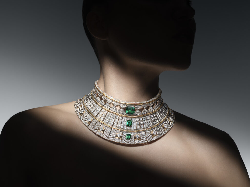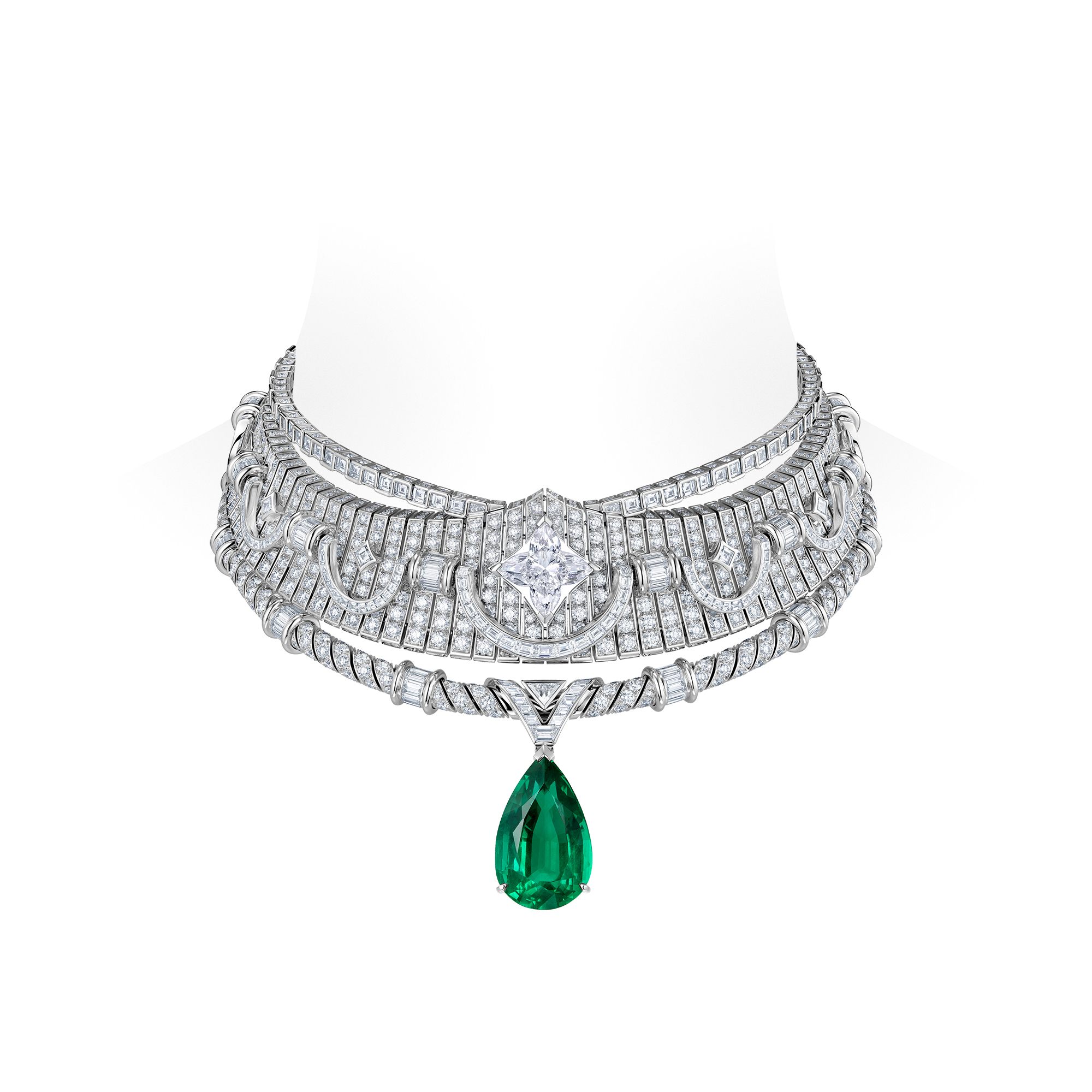تنطلق الرحلة من عالم الإتقان، حيث يقدَّم كل تصميم كتحفة فنية تحمل رموز الدار المميزة، مثل قلادة Savoir المرصّعة بأوبال أسود أسترالي بقطع مثلث يزن 30.56 قيراطًا، أو تصميم Apogée الذي يتوج حجر زمرد برازيلي استثنائي بوزن 30.75 قيراطًا، قلادة إلى جانب ماسة D Flawless بتقطيع نجمة لويس فويتون. كل قطعة هنا تحكي قصة خبرة فنية استثنائية، تمتد من الدقة المعمارية في Monumental إلى التفاصيل الحامية في Protection وKeeper.