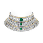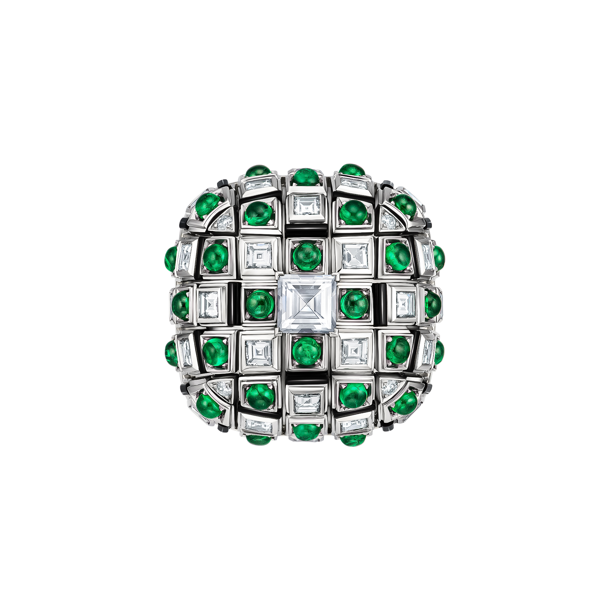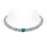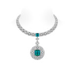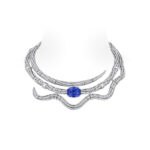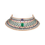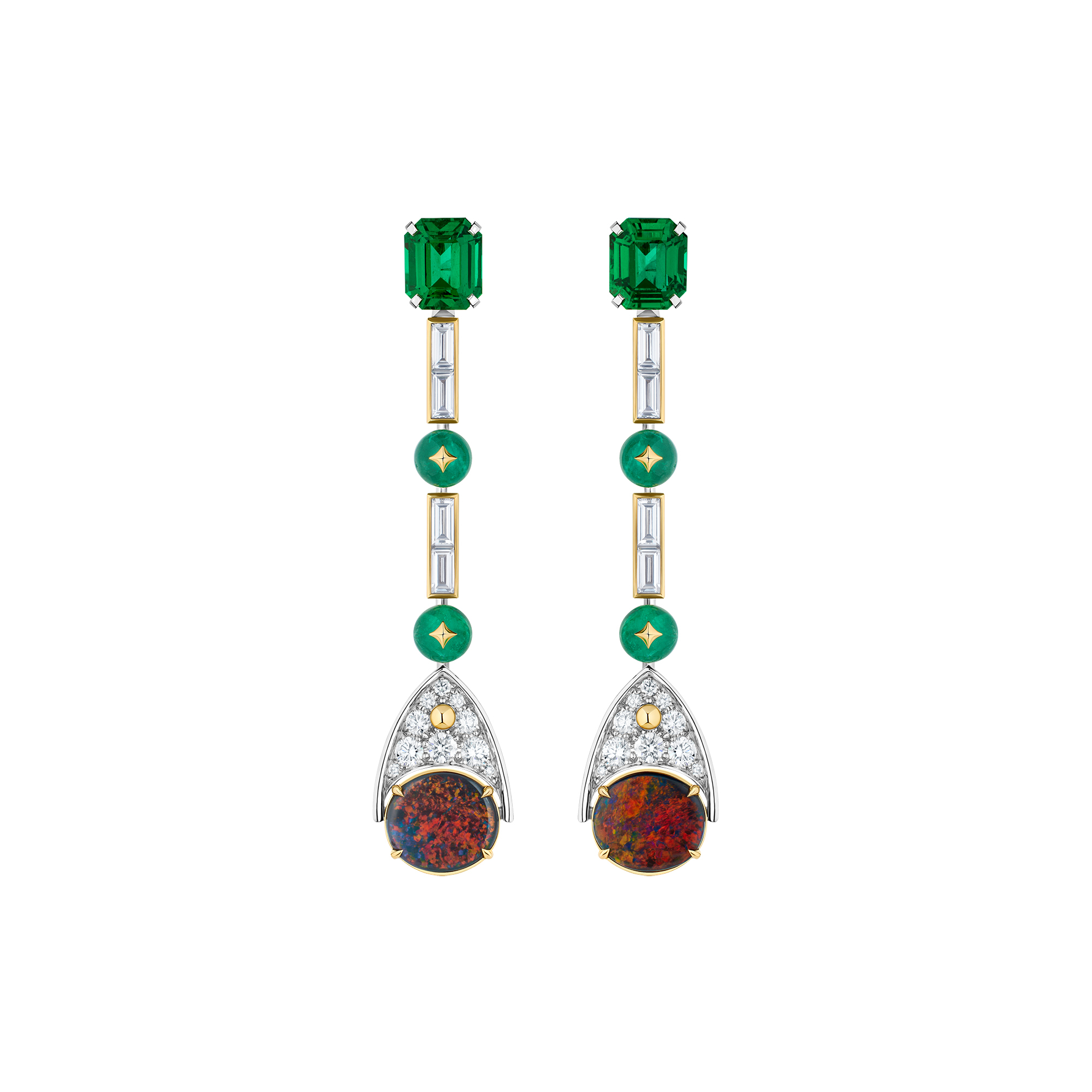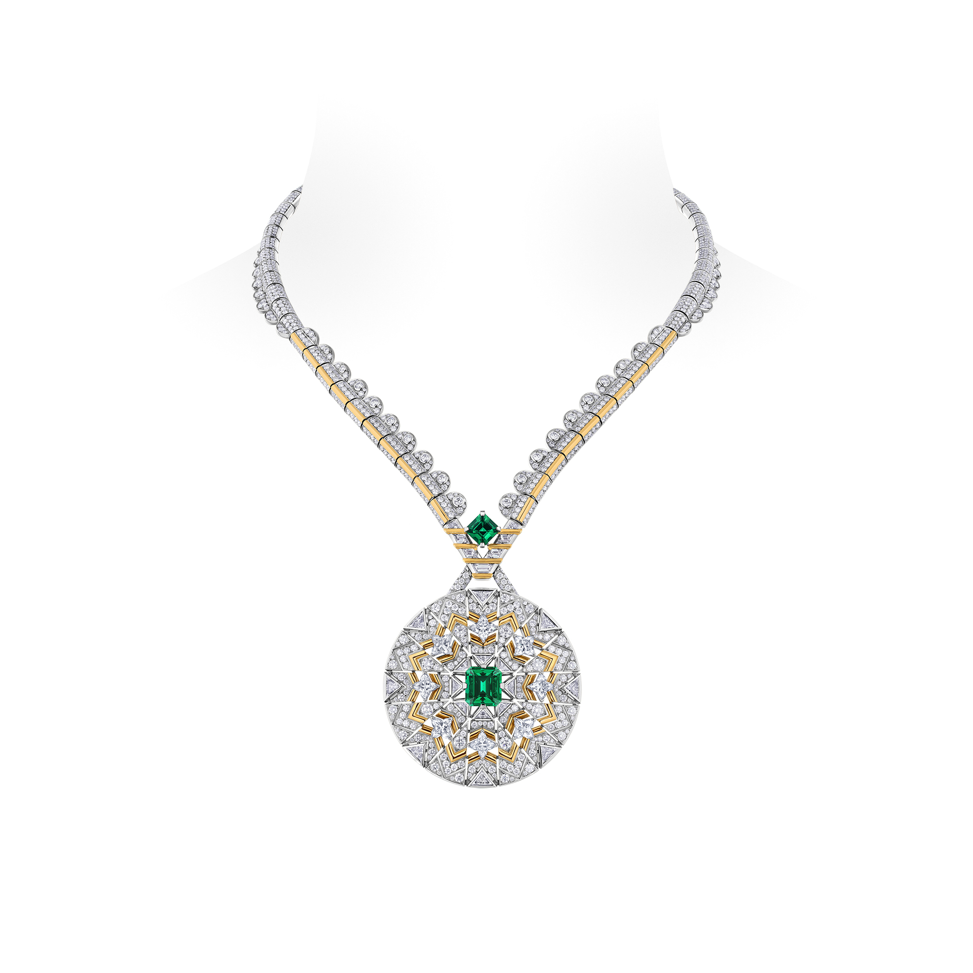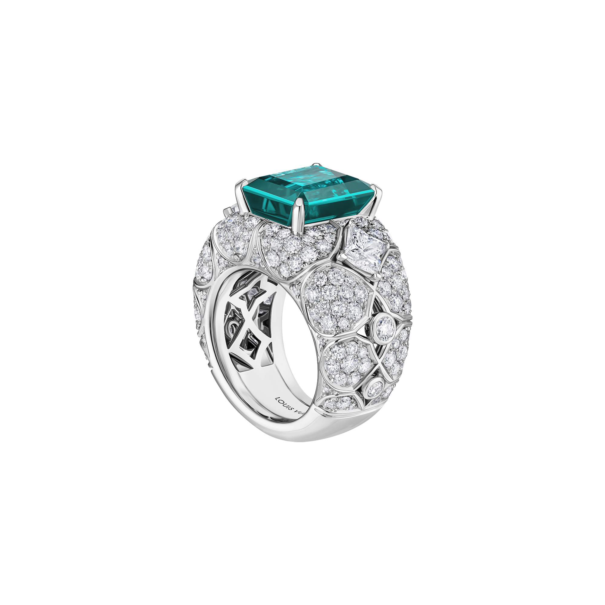 تنطلق الرحلة من عالم الإتقان، حيث يقدَّم كل تصميم كتحفة فنية تحمل رموز الدار المميزة، مثل قلادة Savoir المرصّعة بأوبال أسود أسترالي بقطع مثلث يزن 30.56 قيراطًا، أو تصميم Apogée الذي يتوج حجر زمرد برازيلي استثنائي بوزن 30.75 قيراطًا، قلادة إلى جانب ماسة D Flawless بتقطيع نجمة لويس فويتون. كل قطعة هنا تحكي قصة خبرة فنية استثنائية، تمتد من الدقة المعمارية في Monumental إلى التفاصيل الحامية في Protection وKeeper.