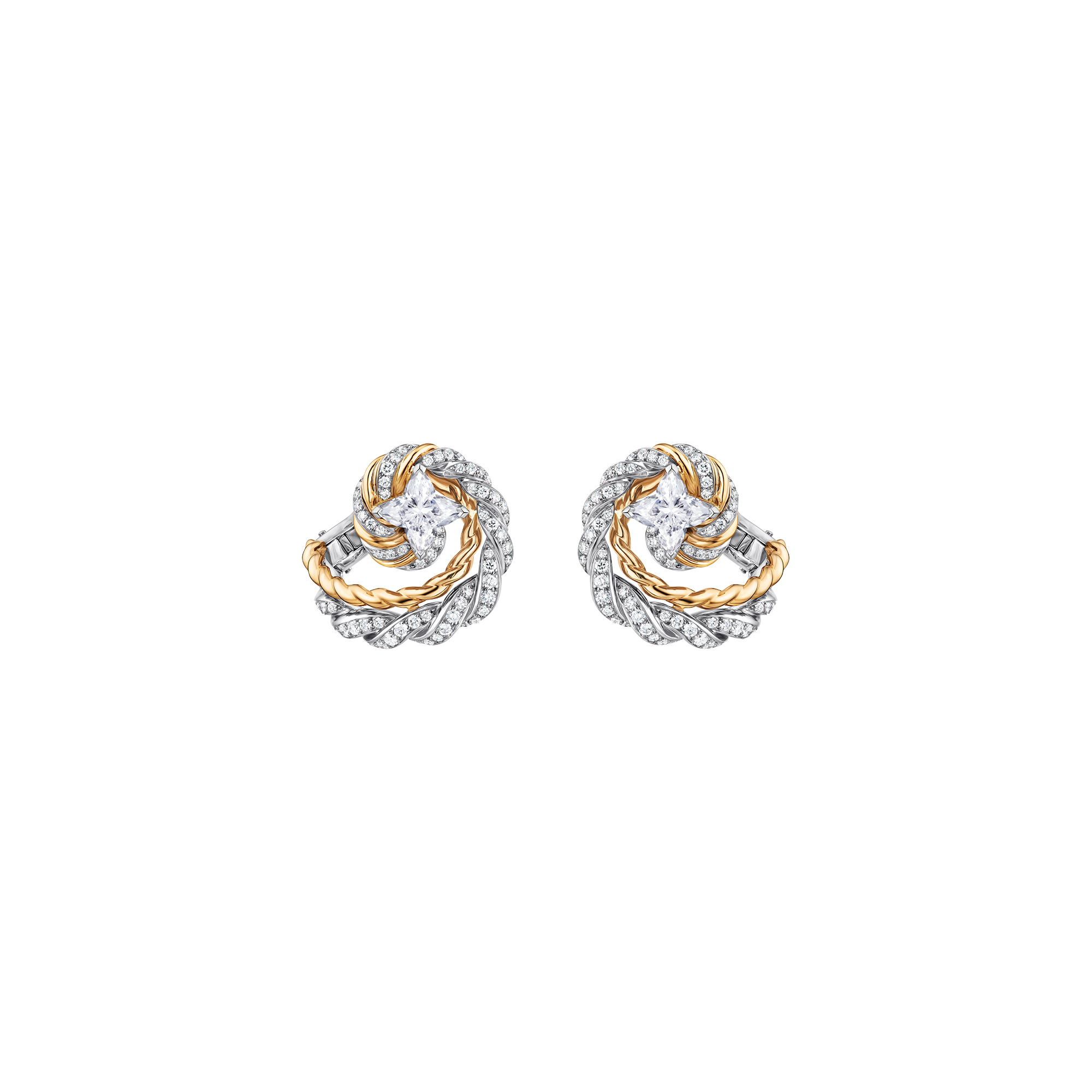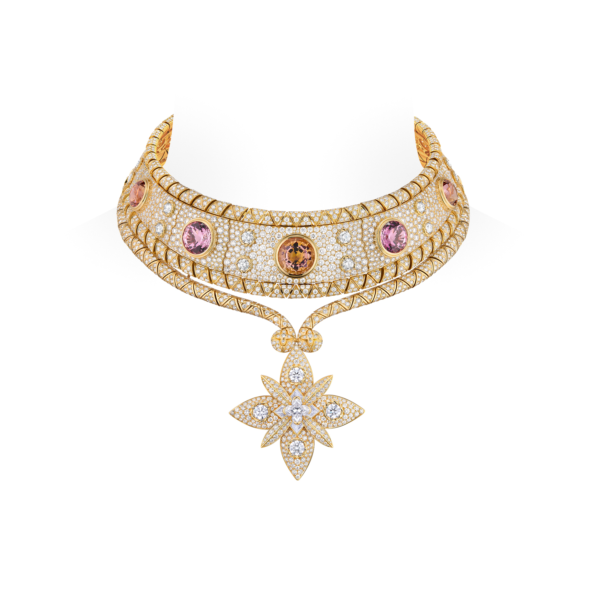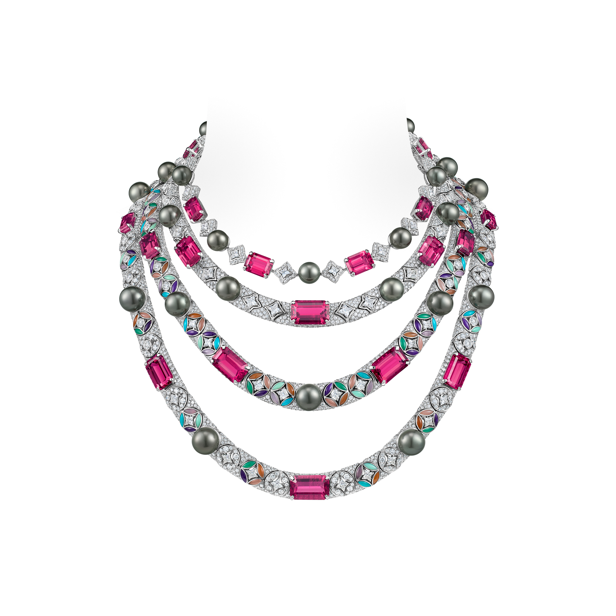 عقد قابل للتحويل، يُتيح ثلاثة خيارات للارتداء، مصنوع من الذهب الأصفر والأبيض، مرصع بأحجار تورمالين وردية، ويتدلى منه قلادة زهرة مونوغرام LV .