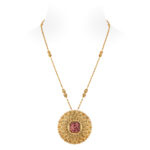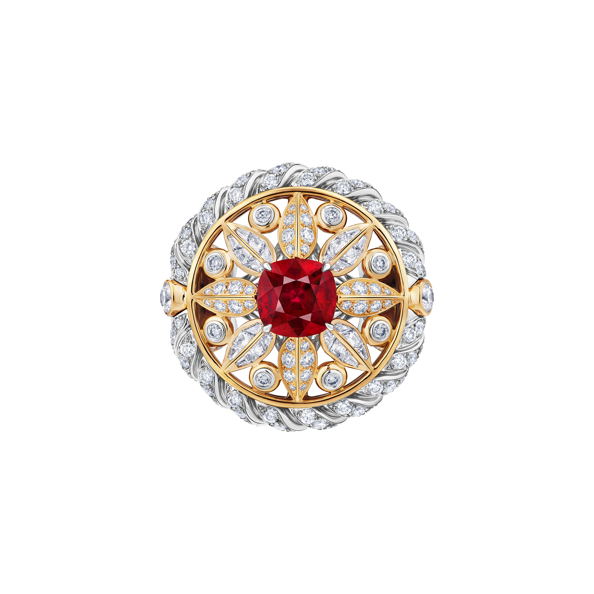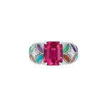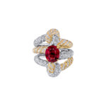 يُرصّع أحد العقود بثلاثية رائعة من الياقوت العتيق المقطوع على شكل وسادة، بألوانه الحمراء الزاهية ووضوحه بفضل قطعه الرائع. تُذكّرنا حلقات الألماس والتفاصيل الدقيقة الشبيهة بالمسامير بحقائب لويس فويتون، مُضفيةً لمسةً رائعةً من الأناقة والجرأة.