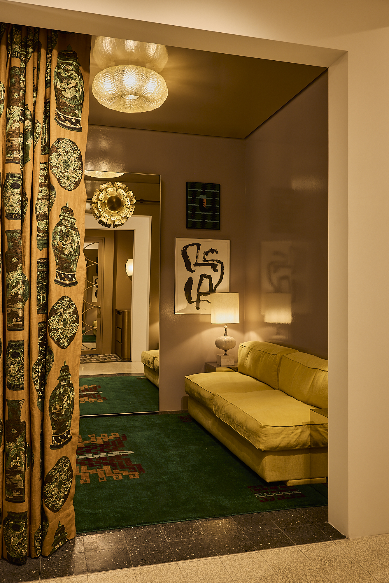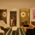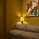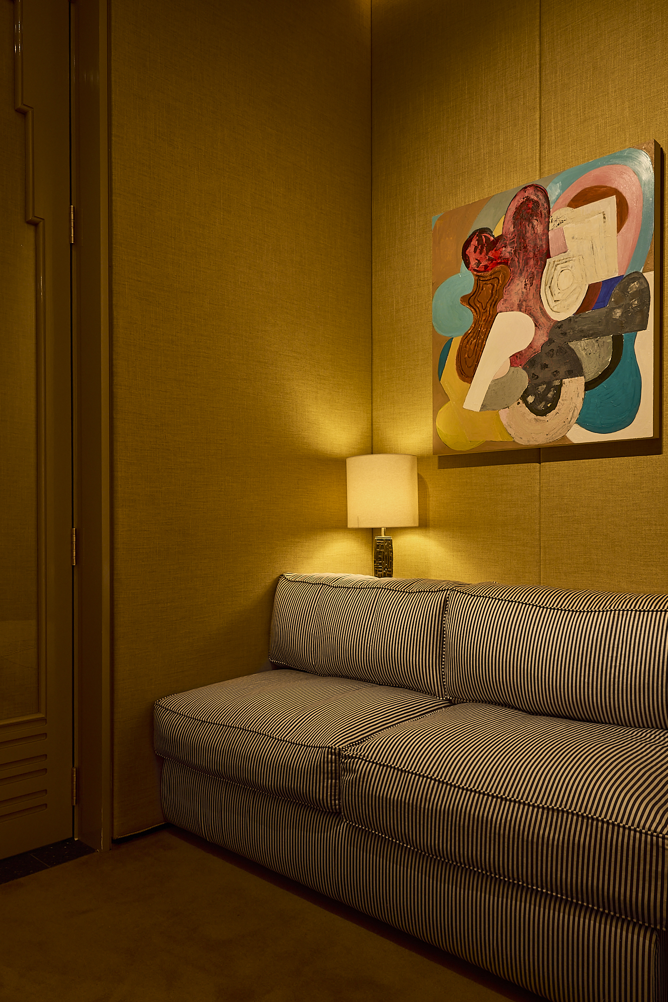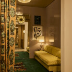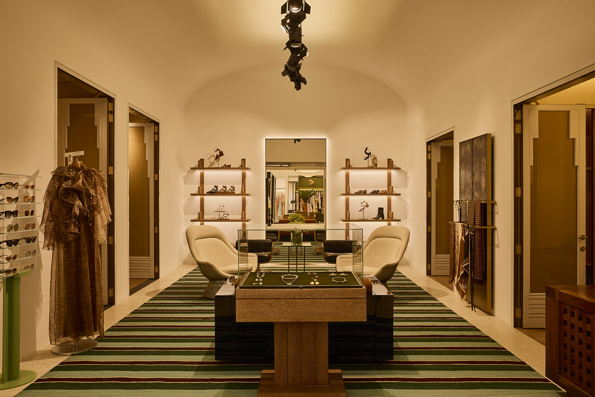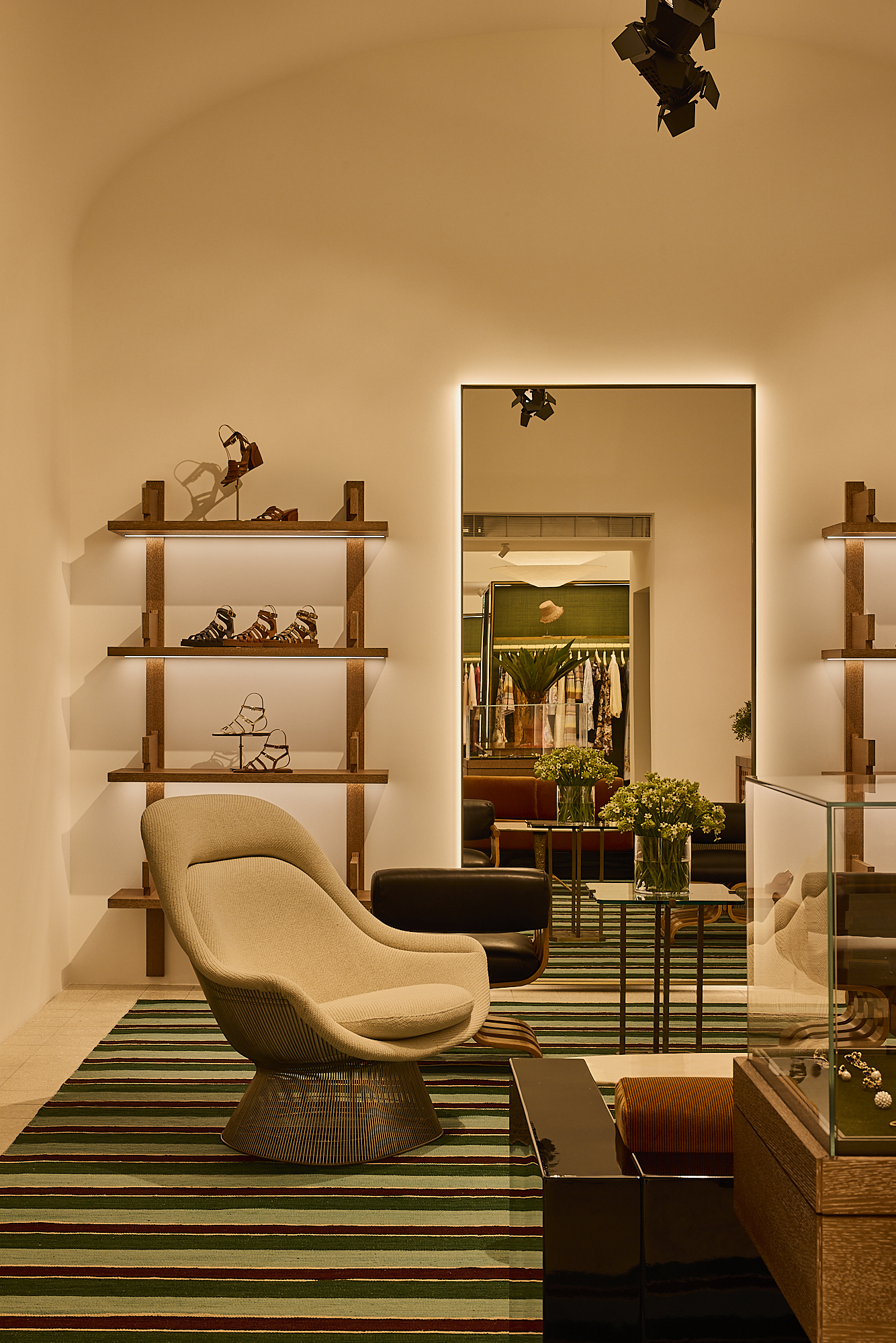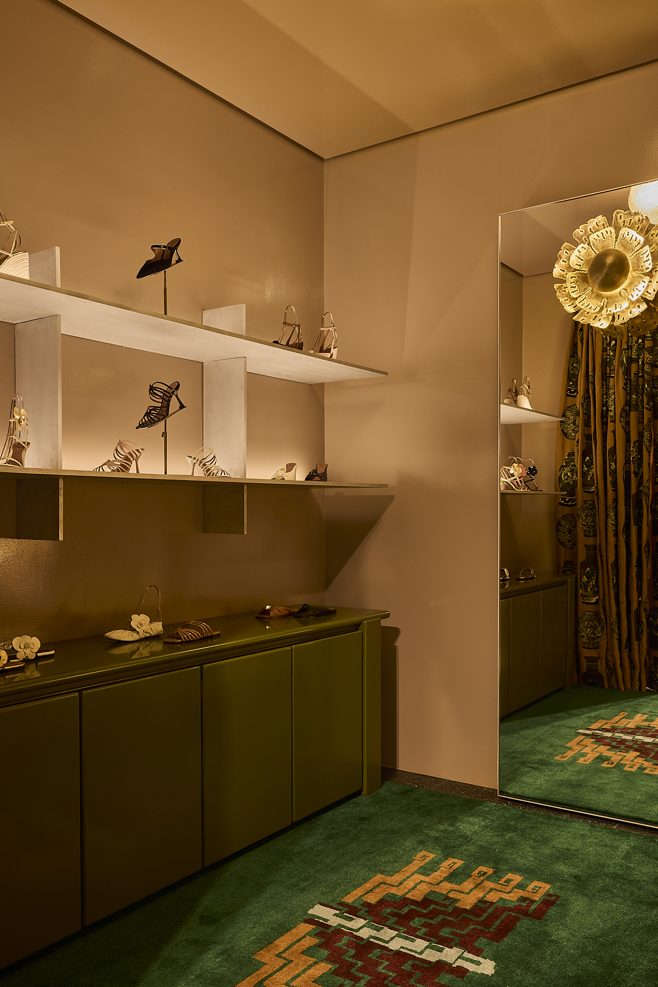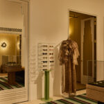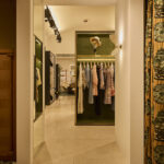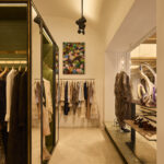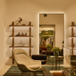 كما يبرز ركن الاستراحة بسجادة مخططة بالأخضر والأزرق تقود نحو أريكة سبعينية معاد تنجيدها، تواجه رفوف أحذية خشبية تمتد من الأرض حتى السقف. ولإضفاء مزيد من الخصوصية، صُمّمت غرف قياس رحبة مبطّنة بالأقمشة مع مقاعد وطاولات جانبية. أما الإكسسوارات الناعمة والأحزمة، فتُعرض بأناقة على شاشة شرقية عتيقة من منتصف القرن العشرين.