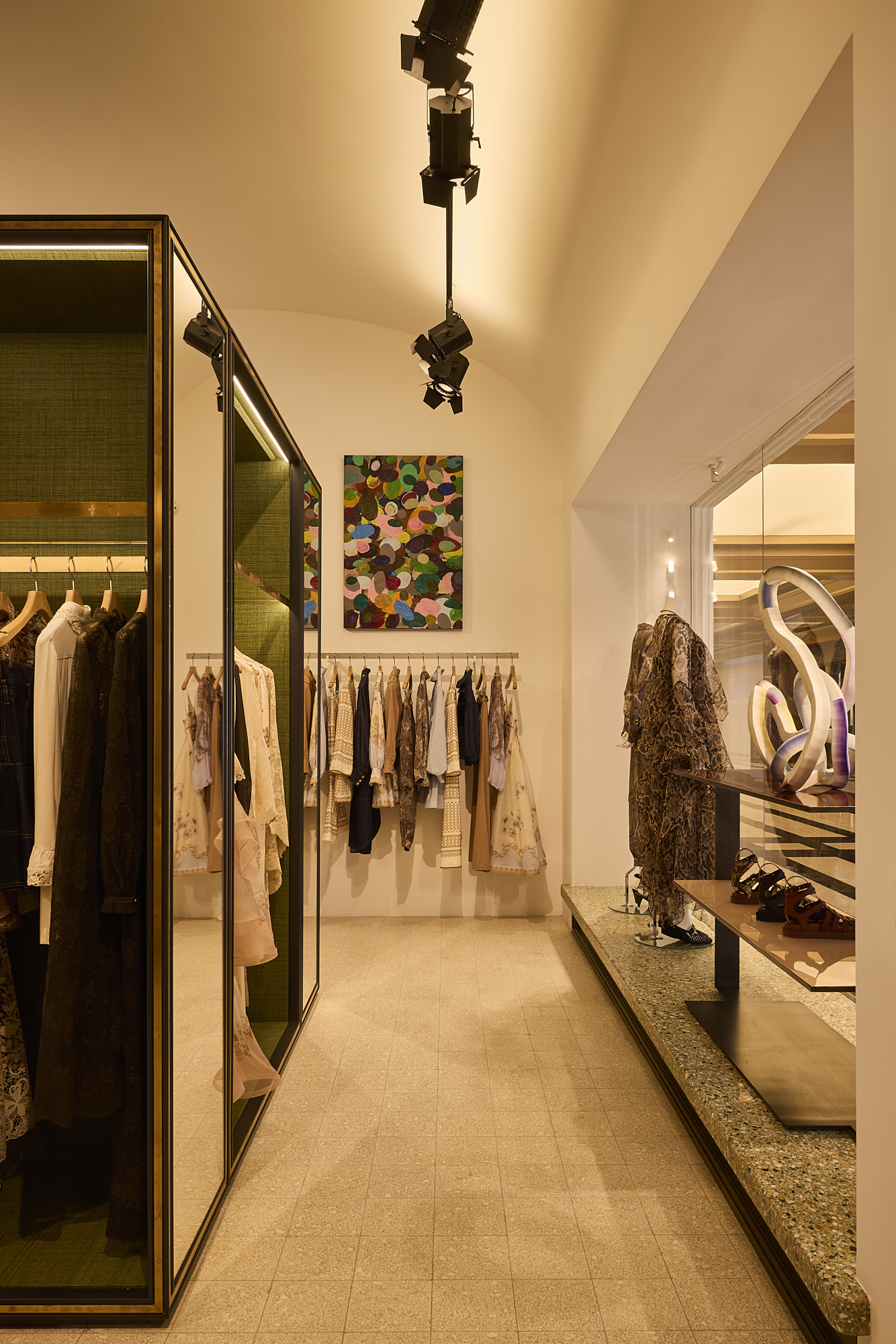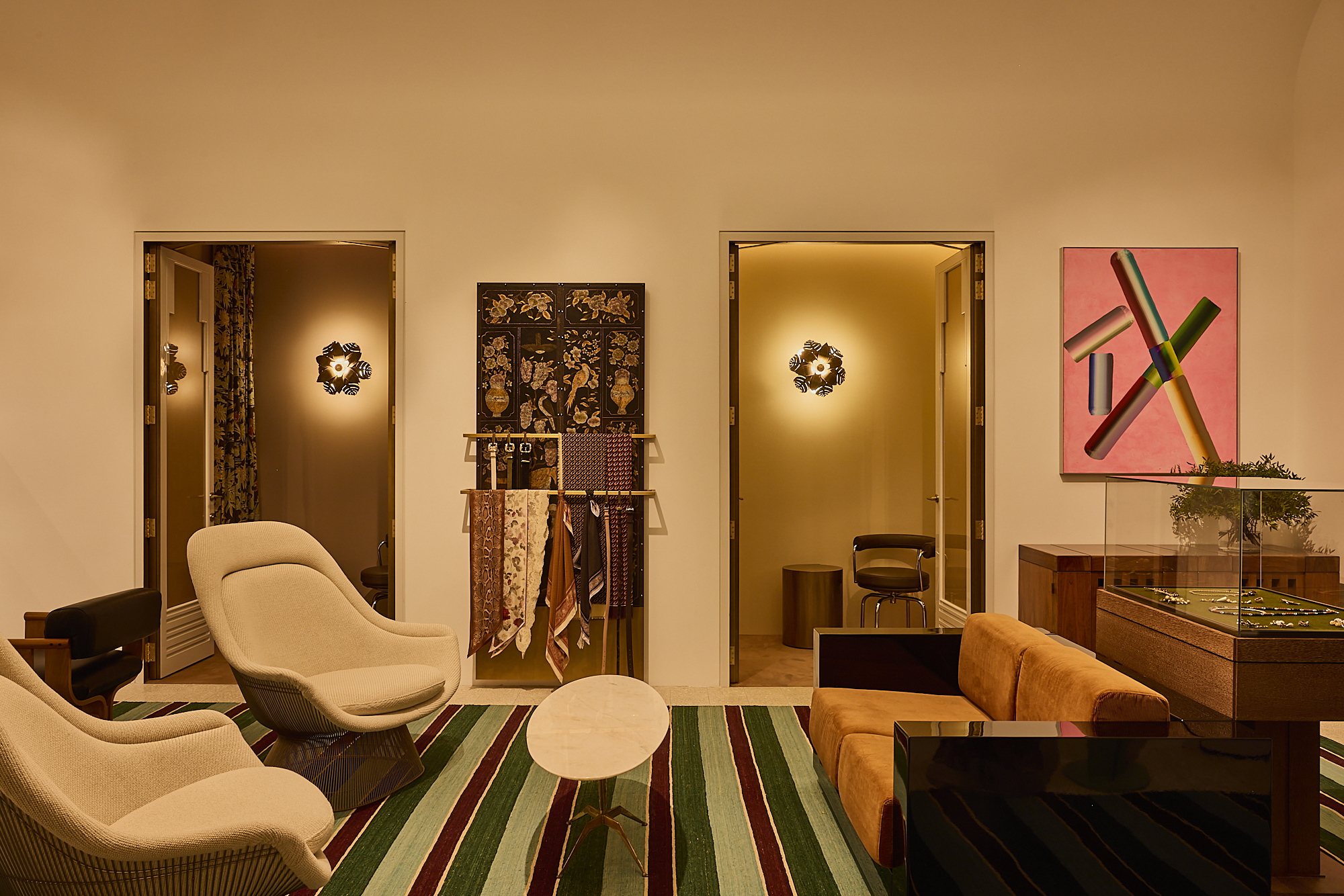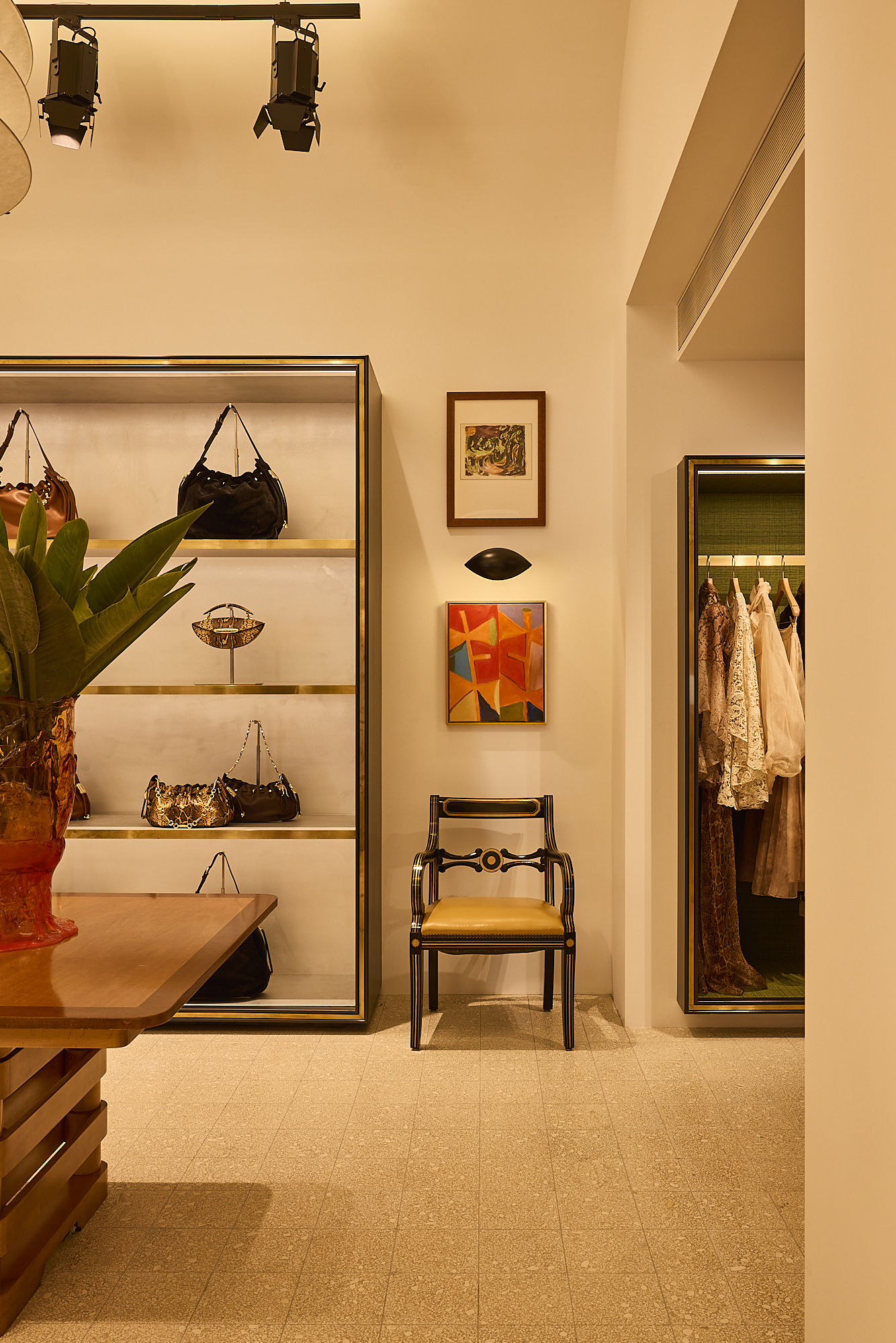 في الداخل، تتكشف المساحات تحت أسقف مقبّبة عالية تمنح إحساسًا بالفخامة. يبدأ الزائر رحلته من قاعة أنيقة تتمحور حول كونسول عتيق من تصميم ألان ديلون، وتعرض الملابس والإكسسوارات في خزائن أنيقة. أما القاعة الثانية، فتضم تجويفات مصممة خصيصًا لعرض أبرز تصاميم المجموعة، تتخللها أعمال فنية لكل من أندريه ماسون والفنان الأسترالي Jordy Van Den Nieuwendijk، ما يضفي لمسة إبداعية خاصة على المكان.