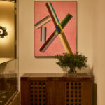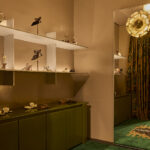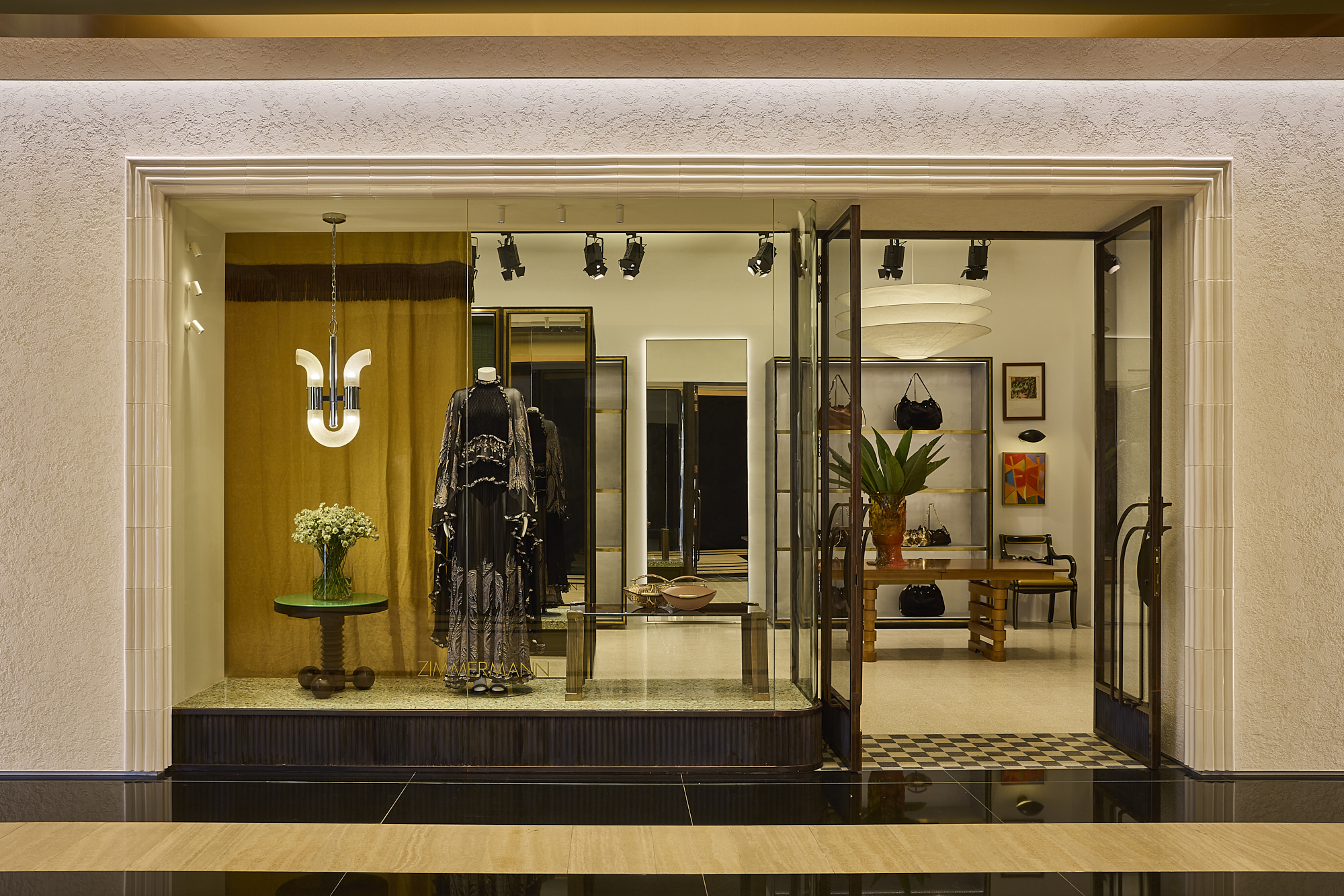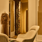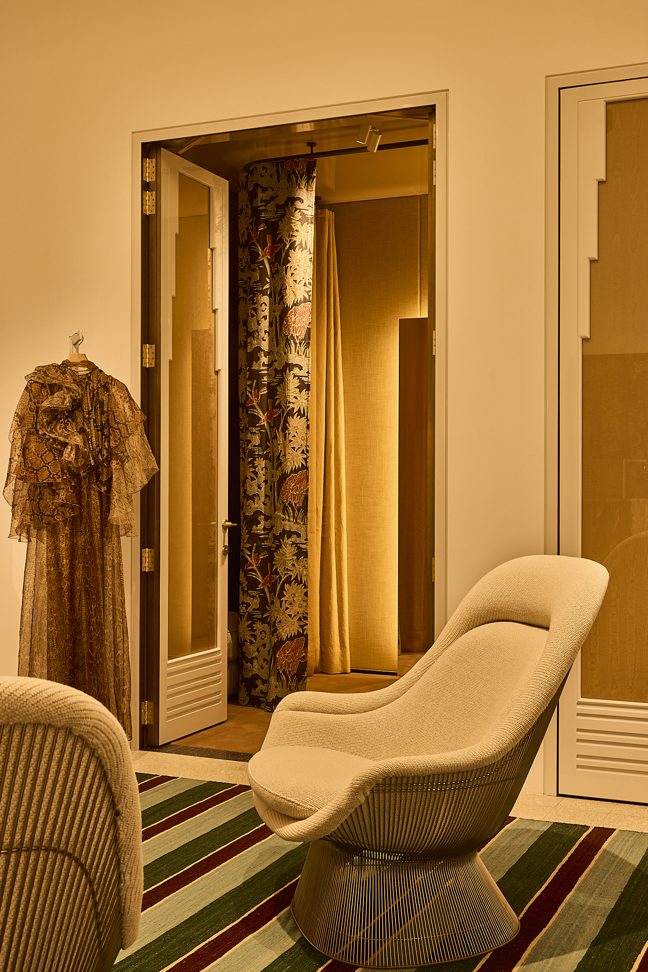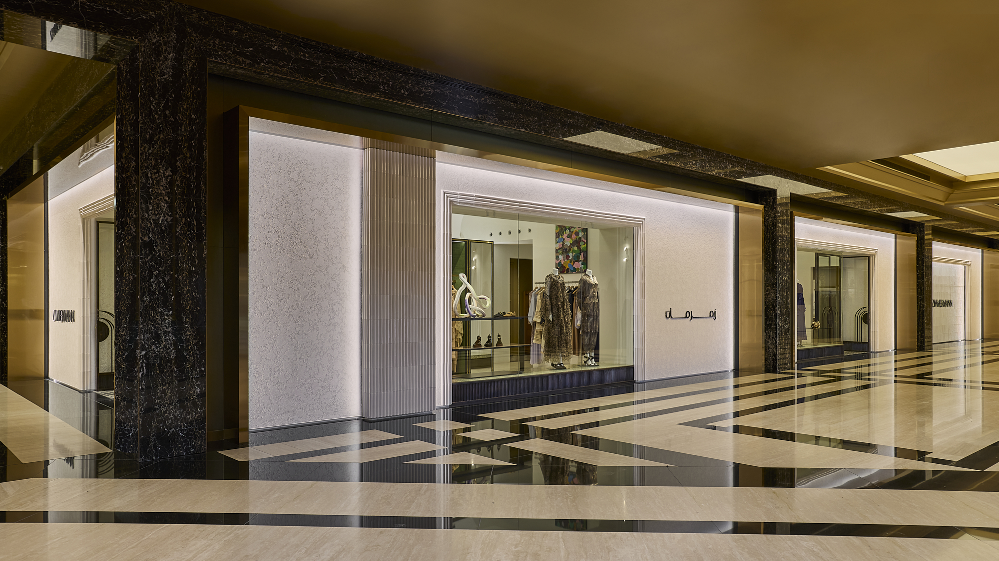 في الداخل، تتكشف المساحات تحت أسقف مقبّبة عالية تمنح إحساسًا بالفخامة. يبدأ الزائر رحلته من قاعة أنيقة تتمحور حول كونسول عتيق من تصميم ألان ديلون، وتعرض الملابس والإكسسوارات في خزائن أنيقة. أما القاعة الثانية، فتضم تجويفات مصممة خصيصًا لعرض أبرز تصاميم المجموعة، تتخللها أعمال فنية لكل من أندريه ماسون والفنان الأسترالي Jordy Van Den Nieuwendijk، ما يضفي لمسة إبداعية خاصة على المكان.