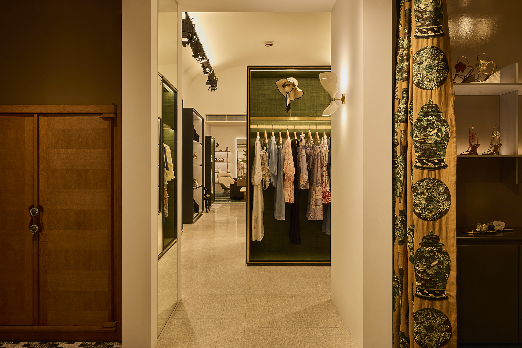 البوتيك الجديد يحمل توقيع Studio McQualter، الشريك الإبداعي طويل الأمد للدار. صُمّم ليقدّم تجربة سلسة للزوار، حيث يمتزج الطابع الفني بالوظيفة العملية. واجهة المتجر تبرز من خلال البلاط الخزفي المموج والإطارات النحاسية المعتّقة للأبواب والنوافذ، في تعبير بصري يجسد لغة العلامة الخاصة.