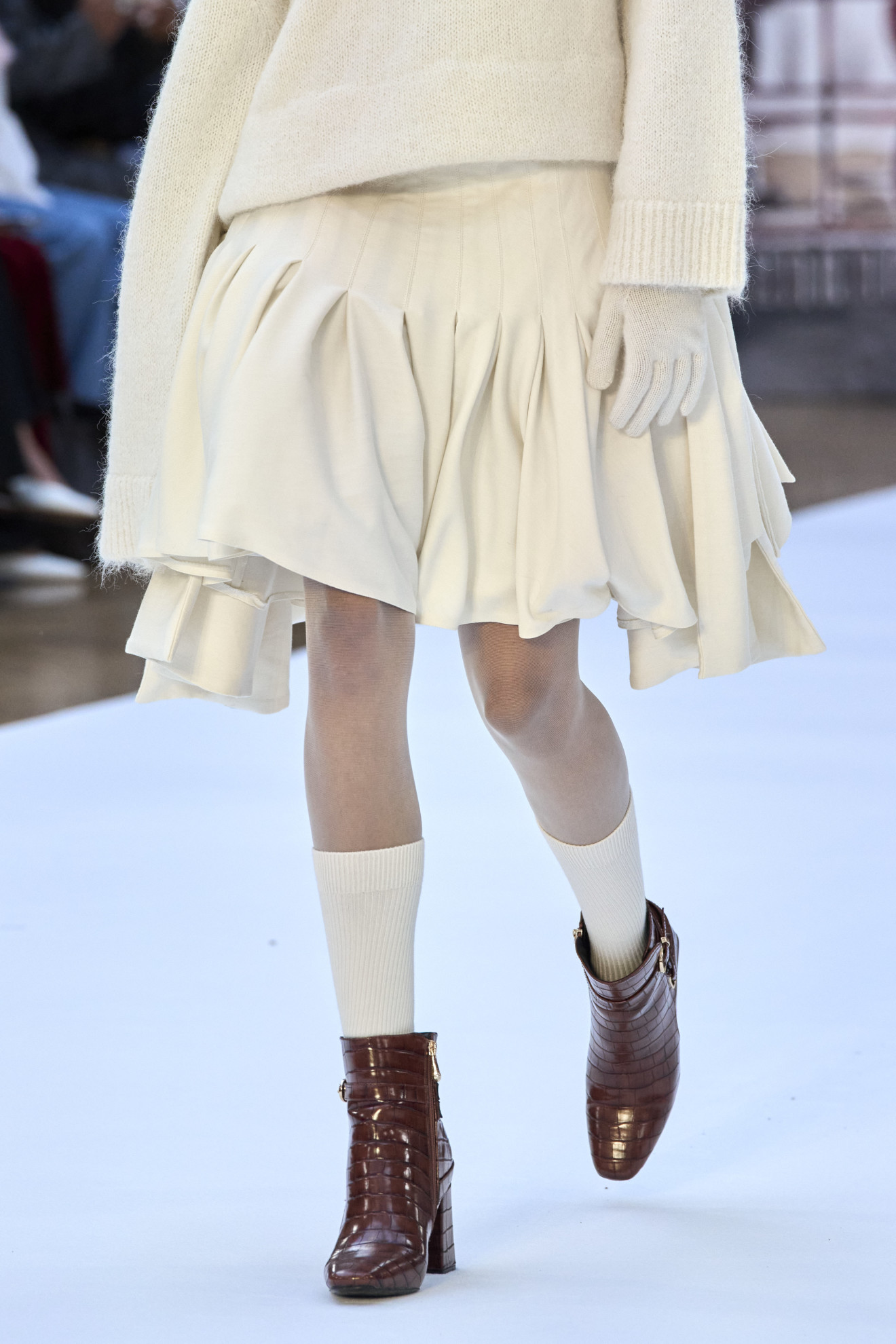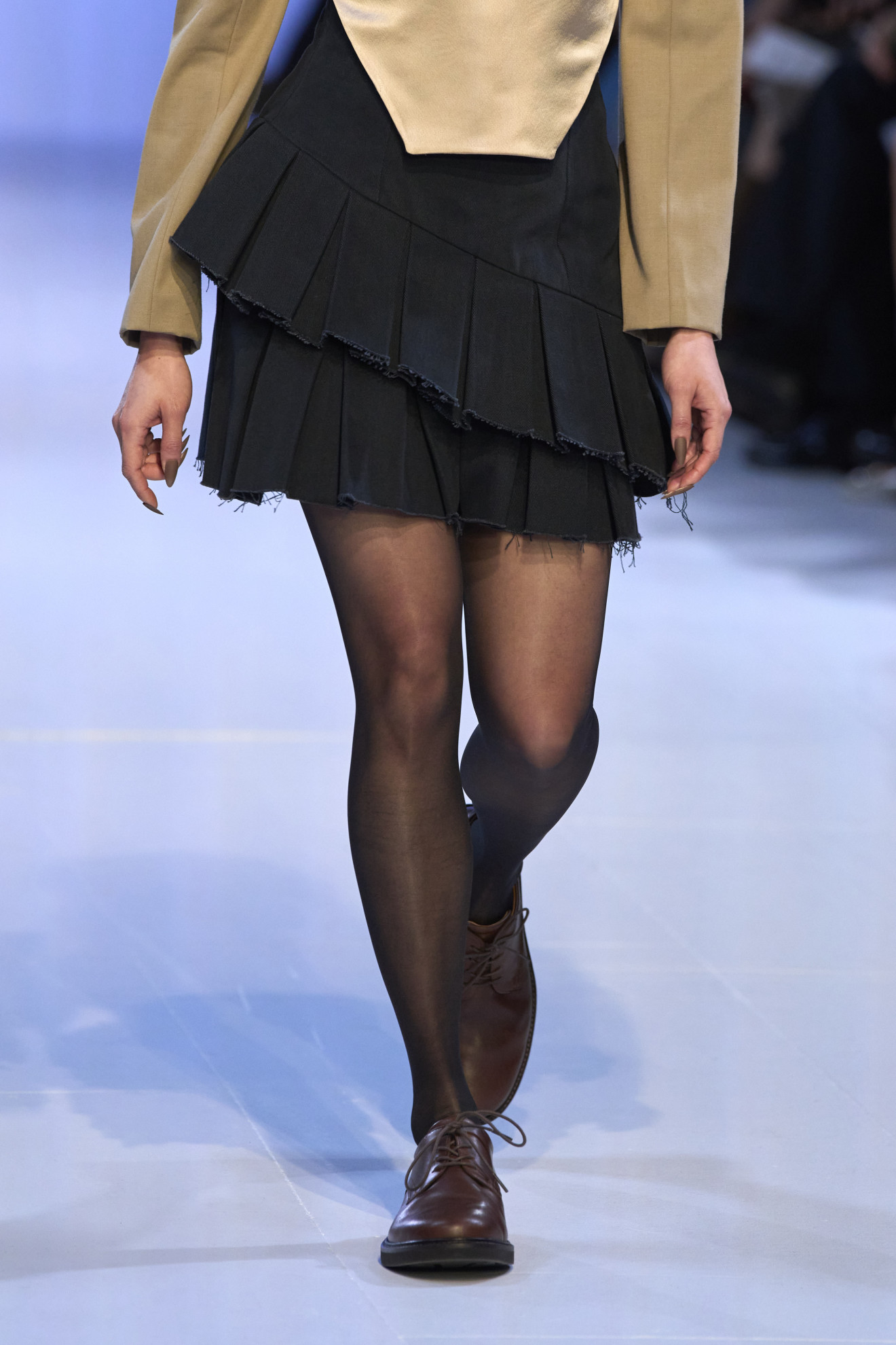 أمّا على منصّة Burberry فكانت التنّورة القصيرة بتكسيراتٍ إضافة كلاسيكيّة وعصريّة على المجموعة، في الوقت الذي لفتتنا فيه التنّورة بتكسيرات وتموّجات في الوقت عينه ضمن عرض مجموعة Sinéad O’Dwyer لموسم خريف وشتاء 2024 – 2025.