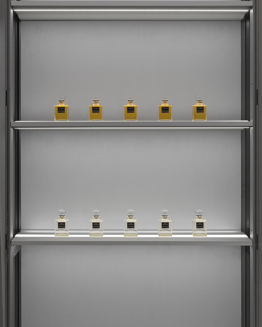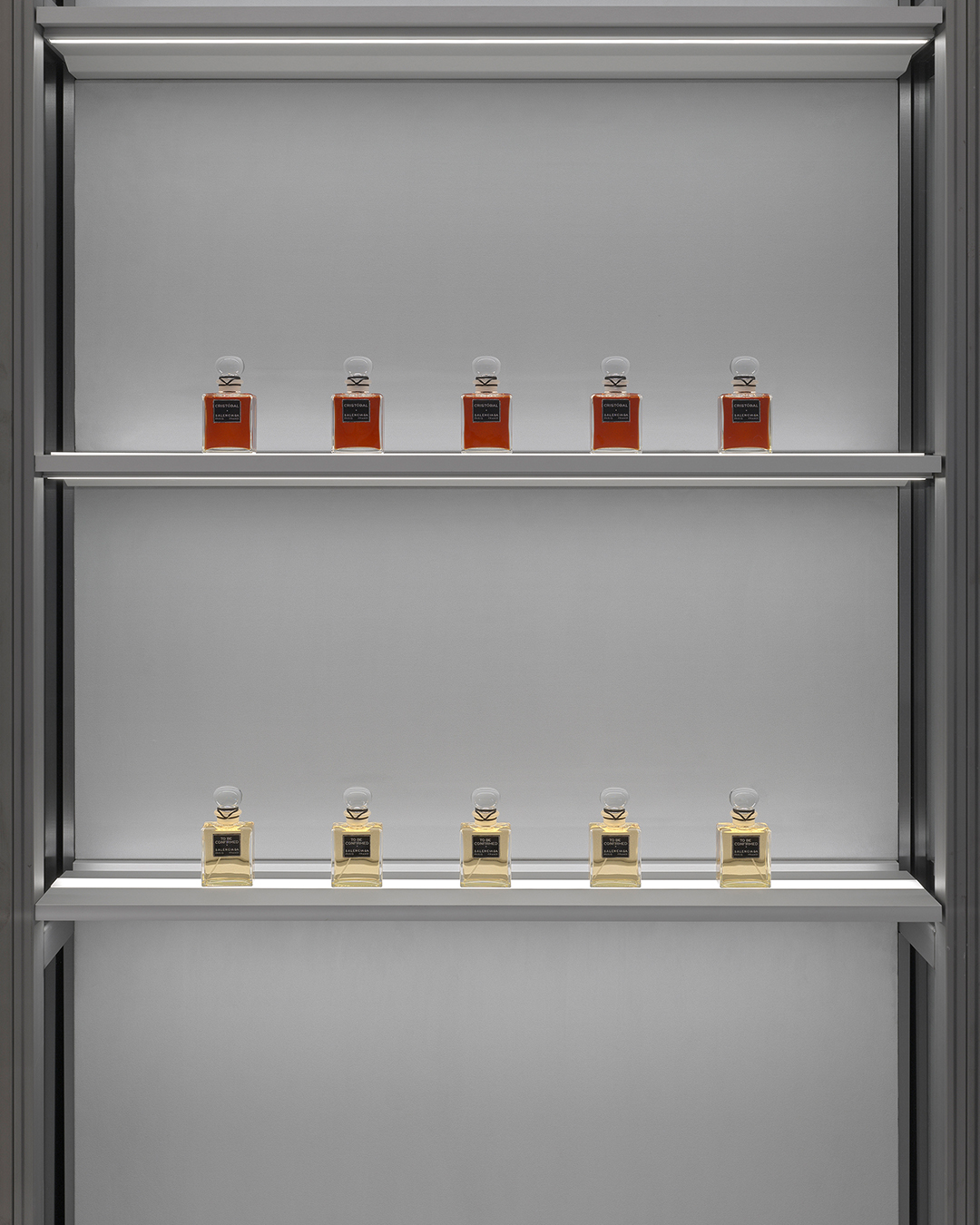 تُعرض هذه العطور في 10 زجاجات بتدرجات لونية، موضوعة على قواعد عاكسة مستوحاة من طراز القرن الثامن عشر والتاسع عشر Surtout De Table، ما يضيف لمسة من الأناقة الكلاسيكية إلى العرض الحديث.