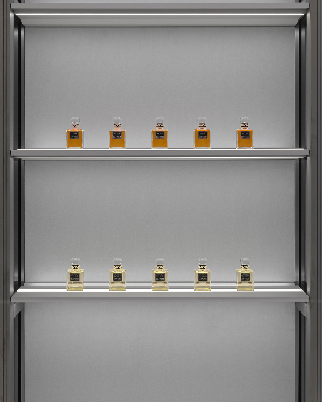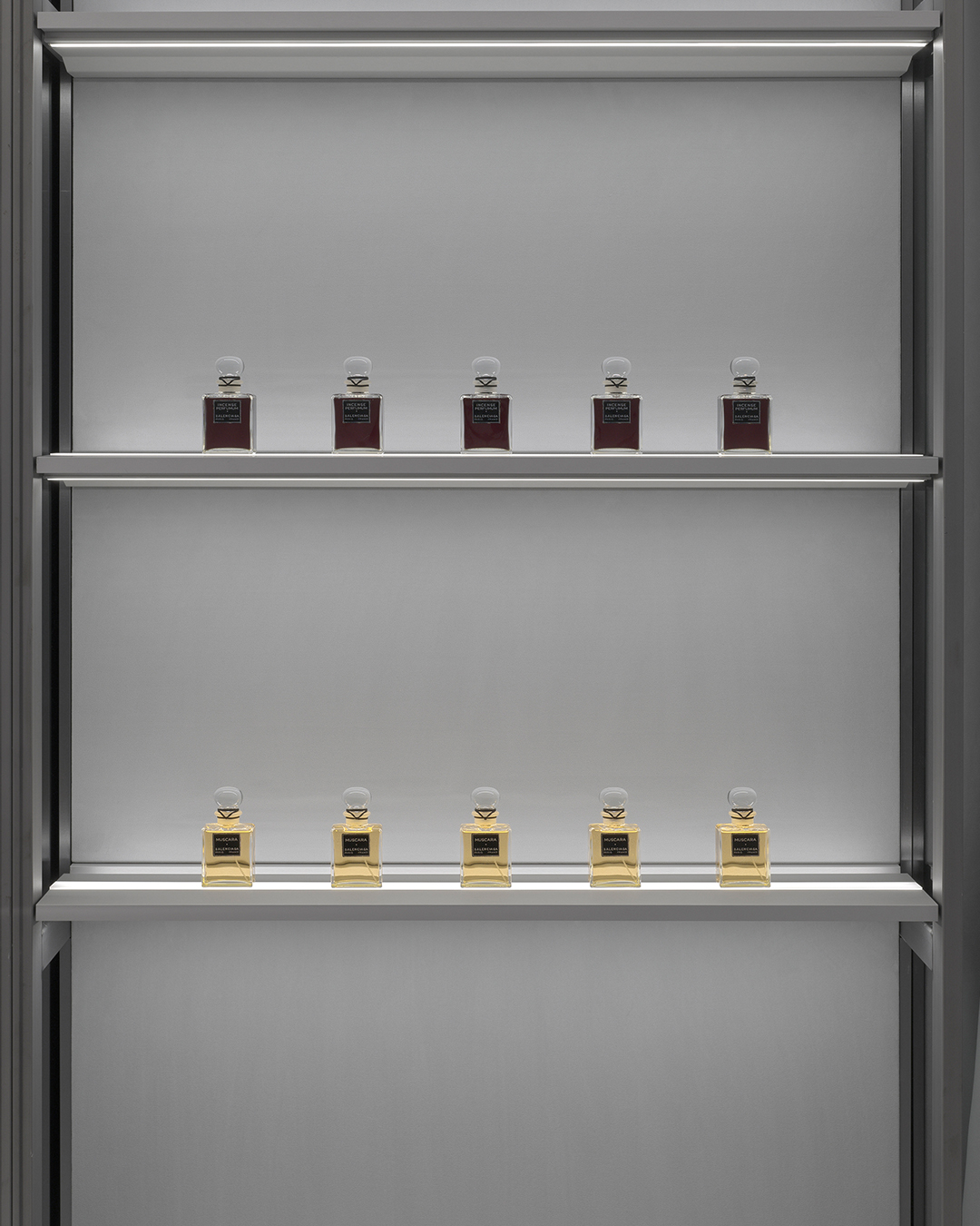 وتحيط ستائر من المخمل الرمادي الفاتح بالبوتيك، لتوحد المساحة العطرية بأكملها في بيئة غامرة واحدة، تعزز تجربة الشم والاستكشاف. وتتيح كراسي من الألمنيوم والجلد، بتصميم مبسط، تجربة استرخاء لاكتشاف مجموعة العطور.