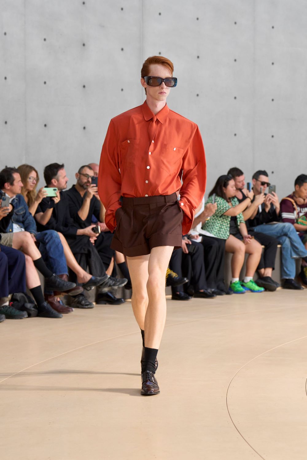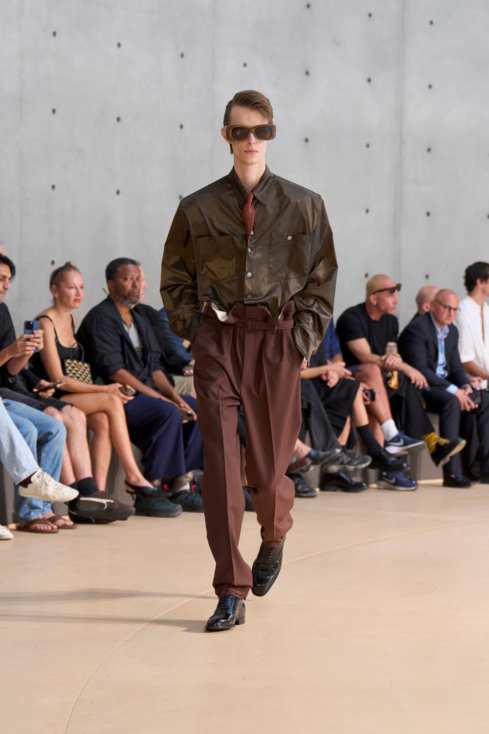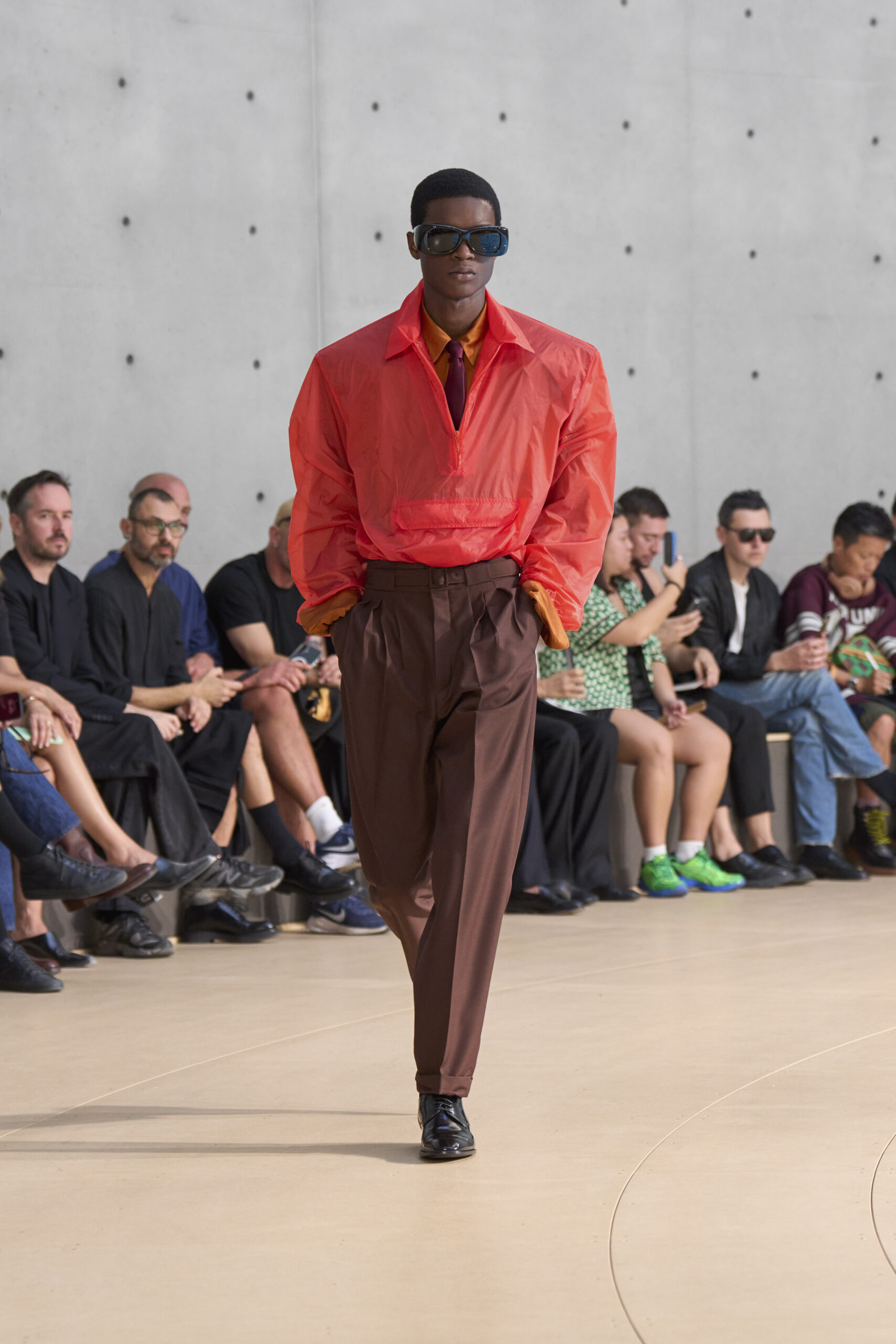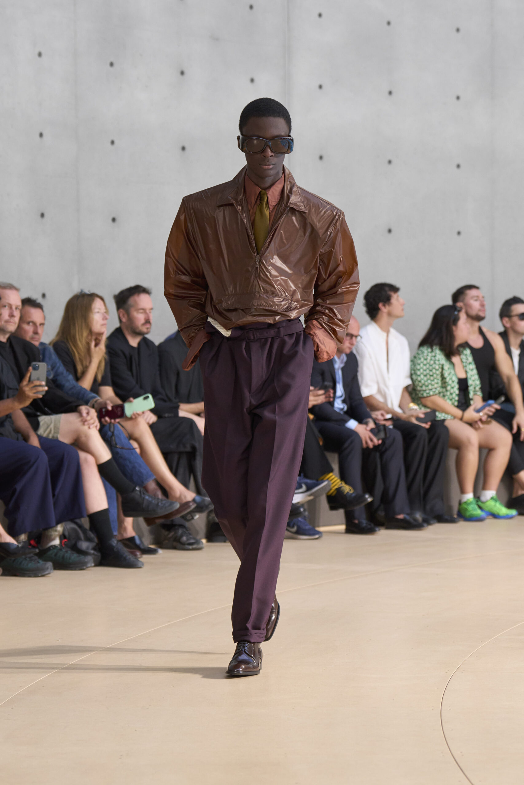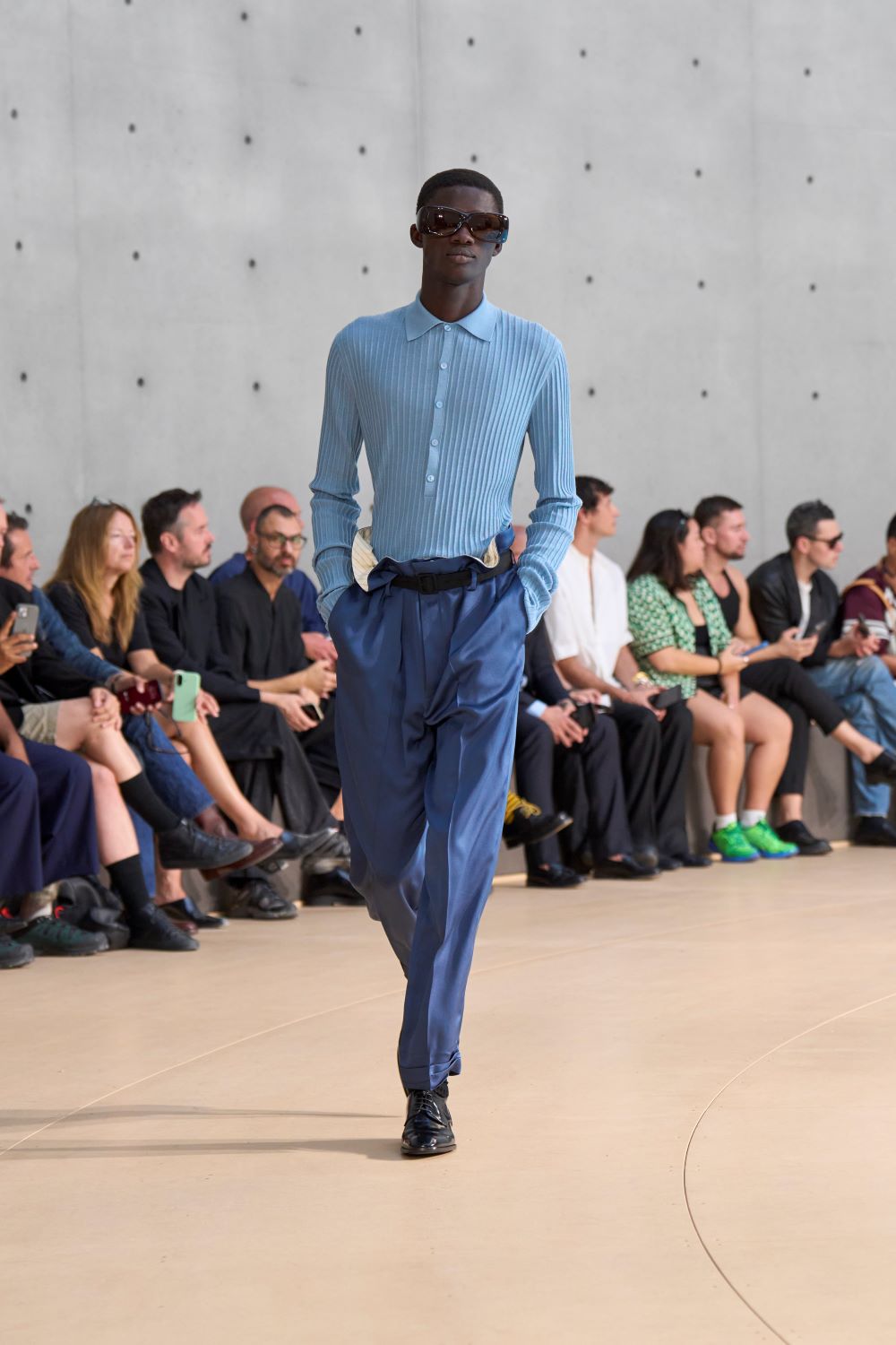 على منصة مستوحاة من العمل التركيبي “Clinamen” للفنانة سيليست بورسييه-موجينو، حيث تصطدم أواني البورسلين داخل حوض دائري وتخلق صدىً من دون تنسيق، ظهرت التصاميم وكأنها تسبح في الجو: أكتاف ممتدة، خصر مشدود، وخامات خفيفة من الحرير والنايلون تنساب على الجسد دون أن تقيّده.