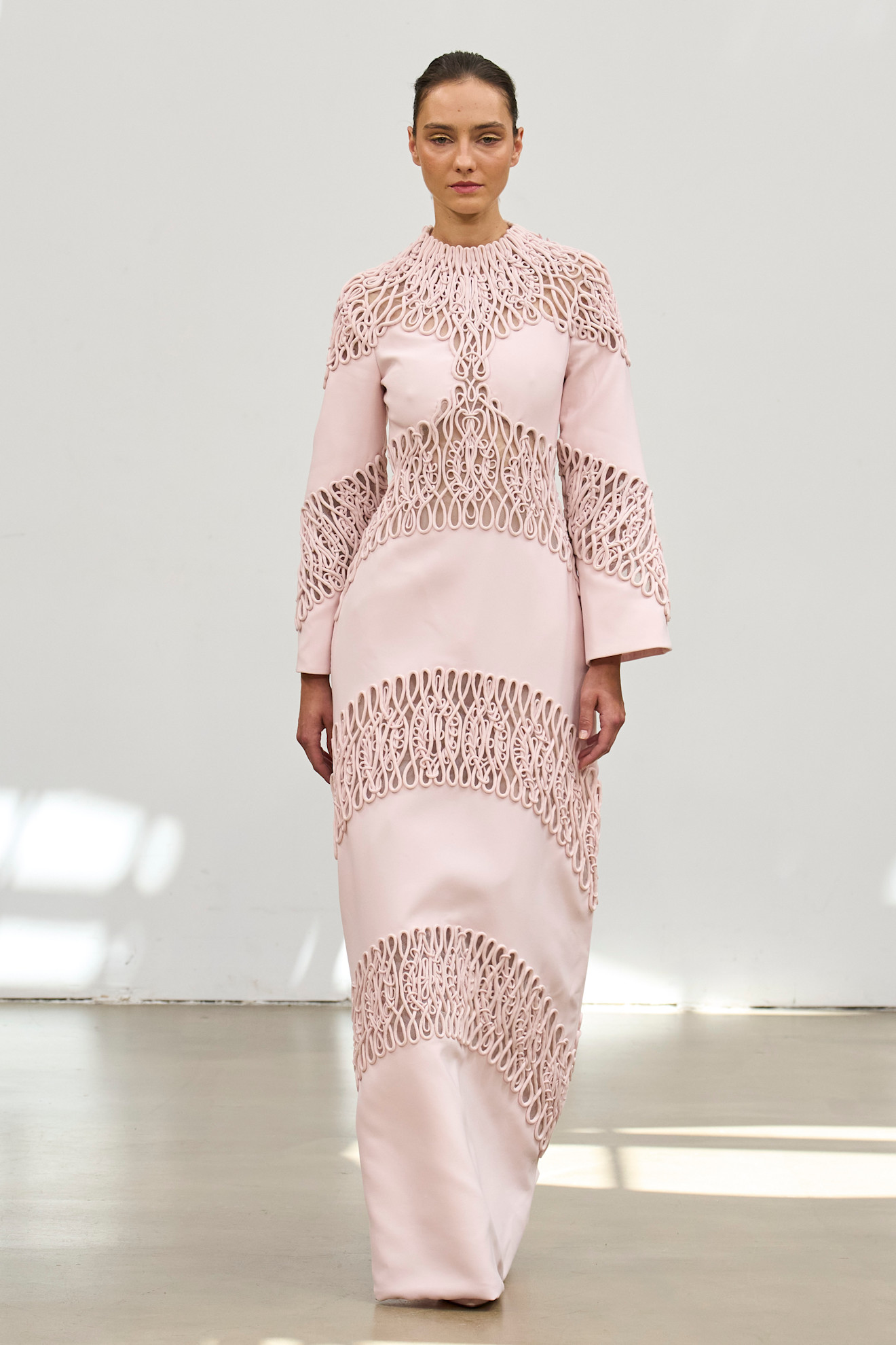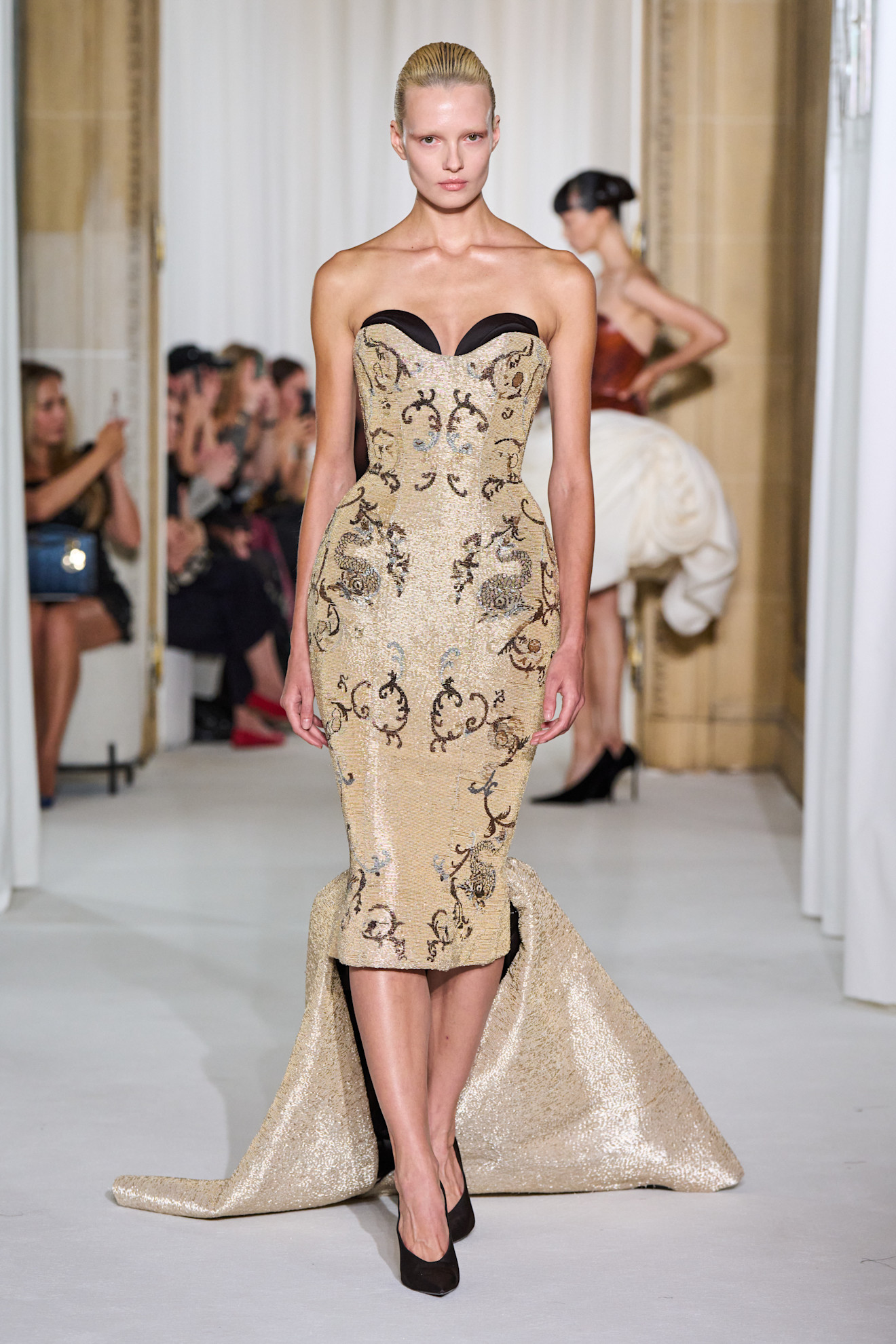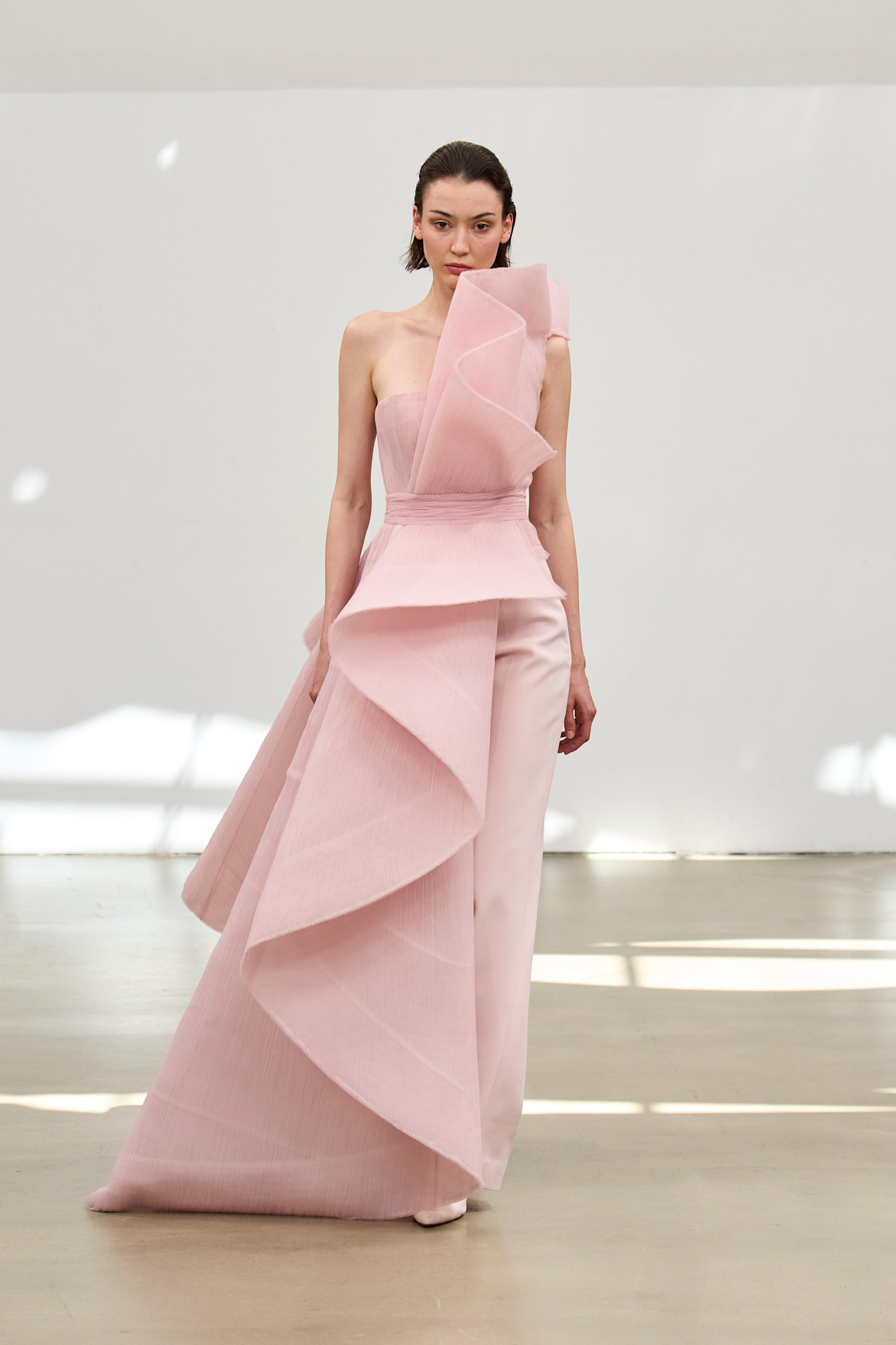 يُجسّد ستيفان رولان التكرار الآسر لموسيقى رافيل في ملابس تتميز بوضوح ميكانيكي. خياطته تُعبّر عن نفسها ببلاغة – بدلات توكسيدو ذات ياقات مبالغ فيها، وفساتين مكشوفة الظهر تُحدّدها ياقات منحوتة، وجمبسوت نصف دائريّ يمشي كالمنحوتات الحركية. كل شيء يتحرك بدقة ، ومع ذلك ينبض بروح الباروك.