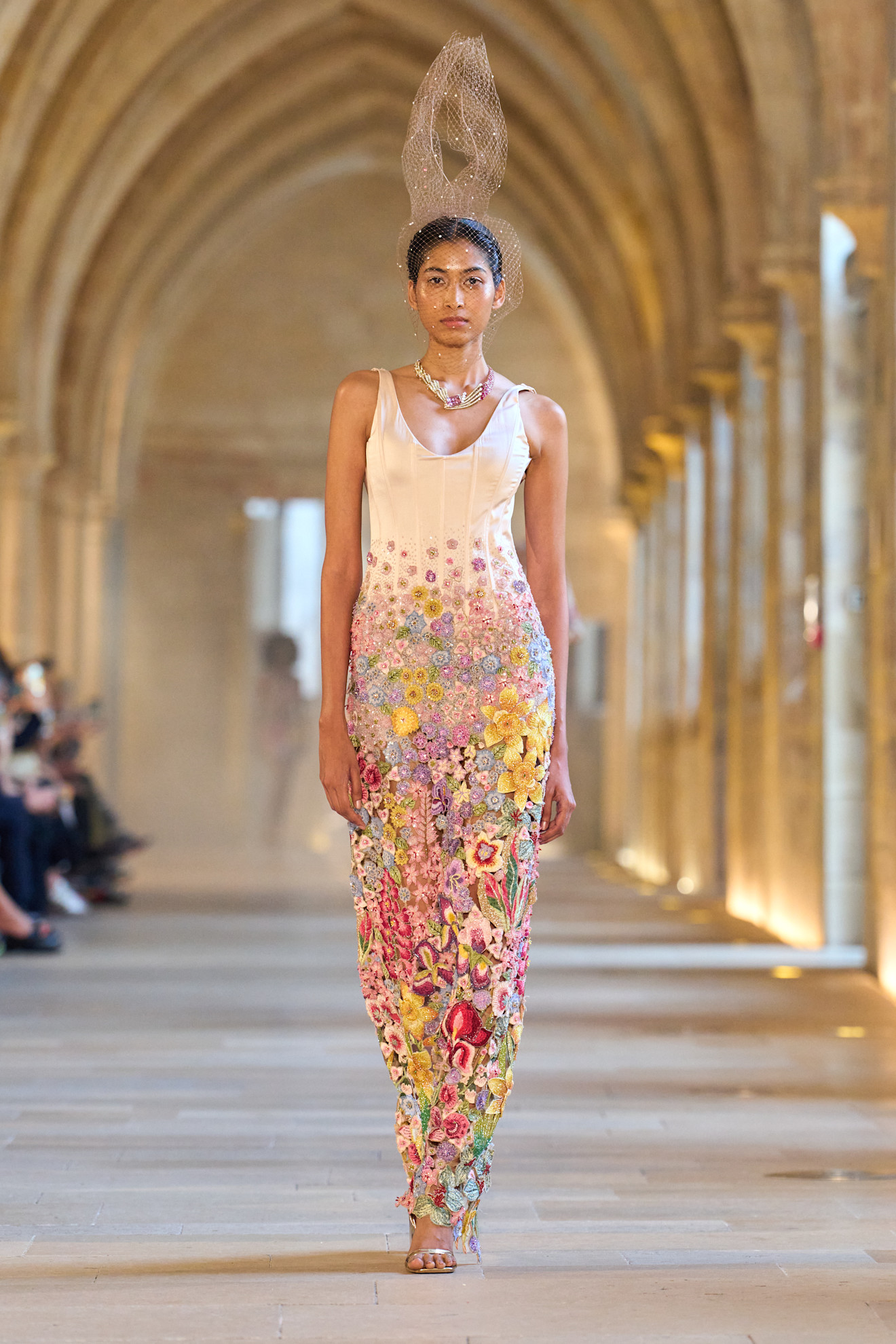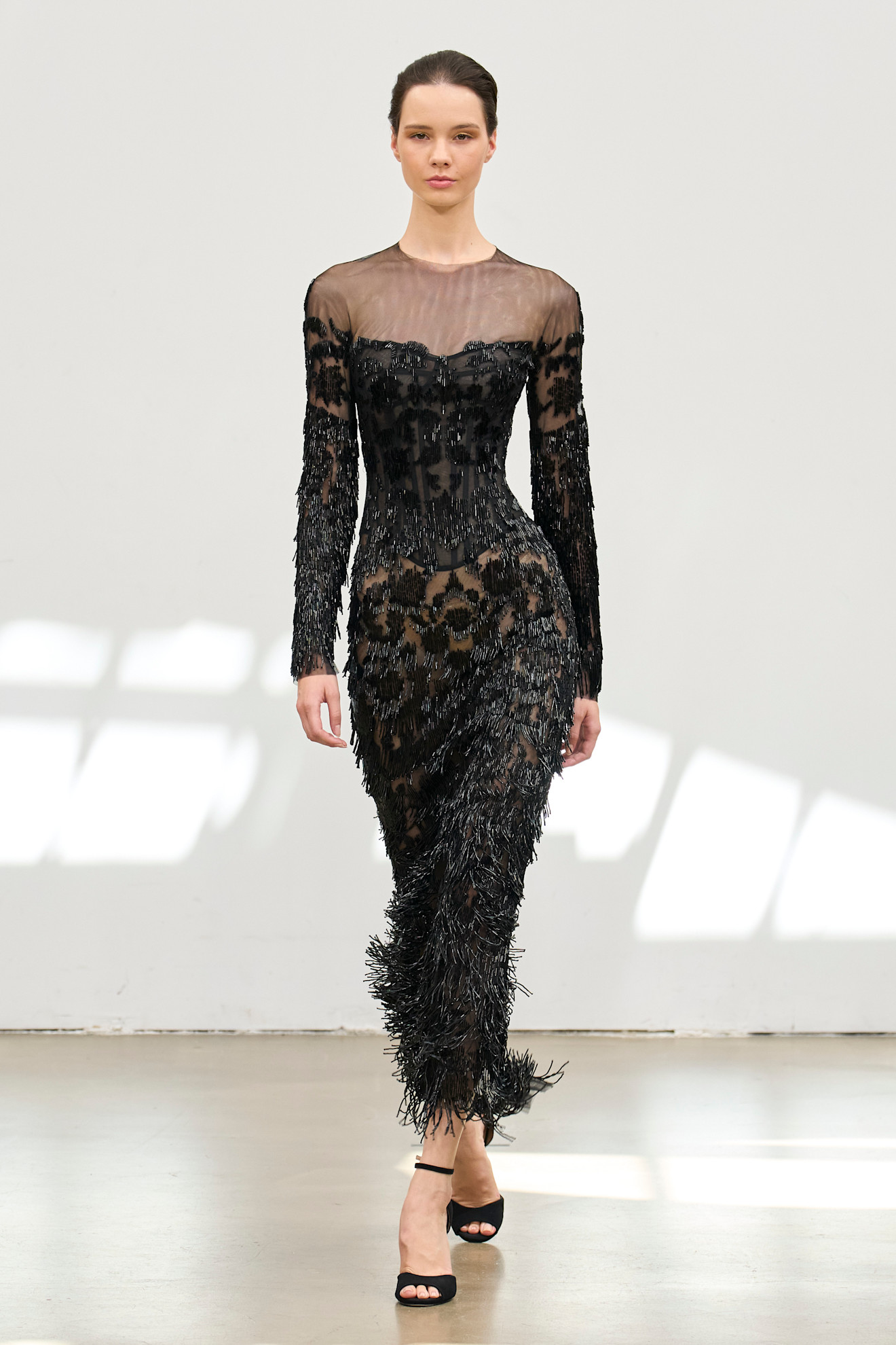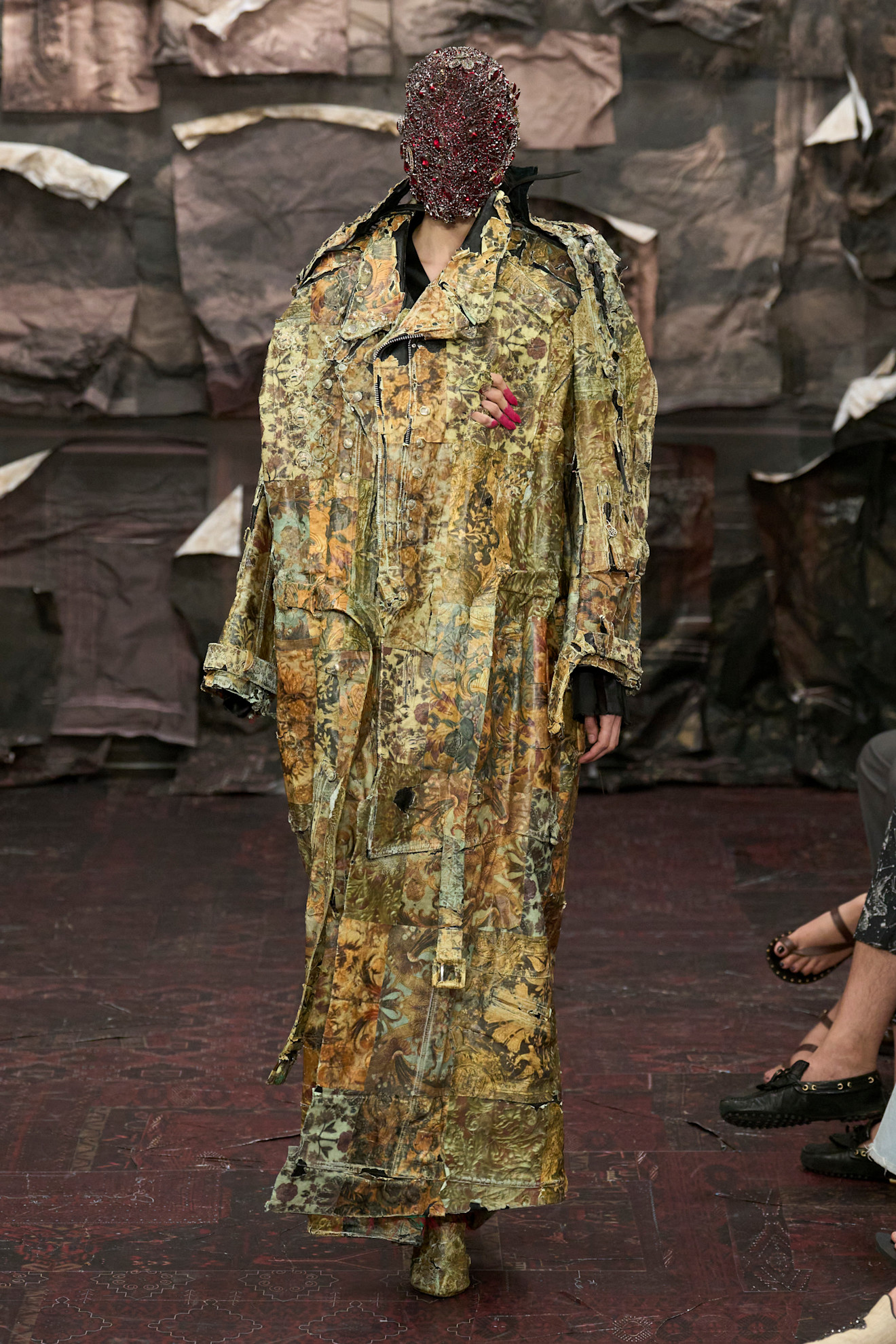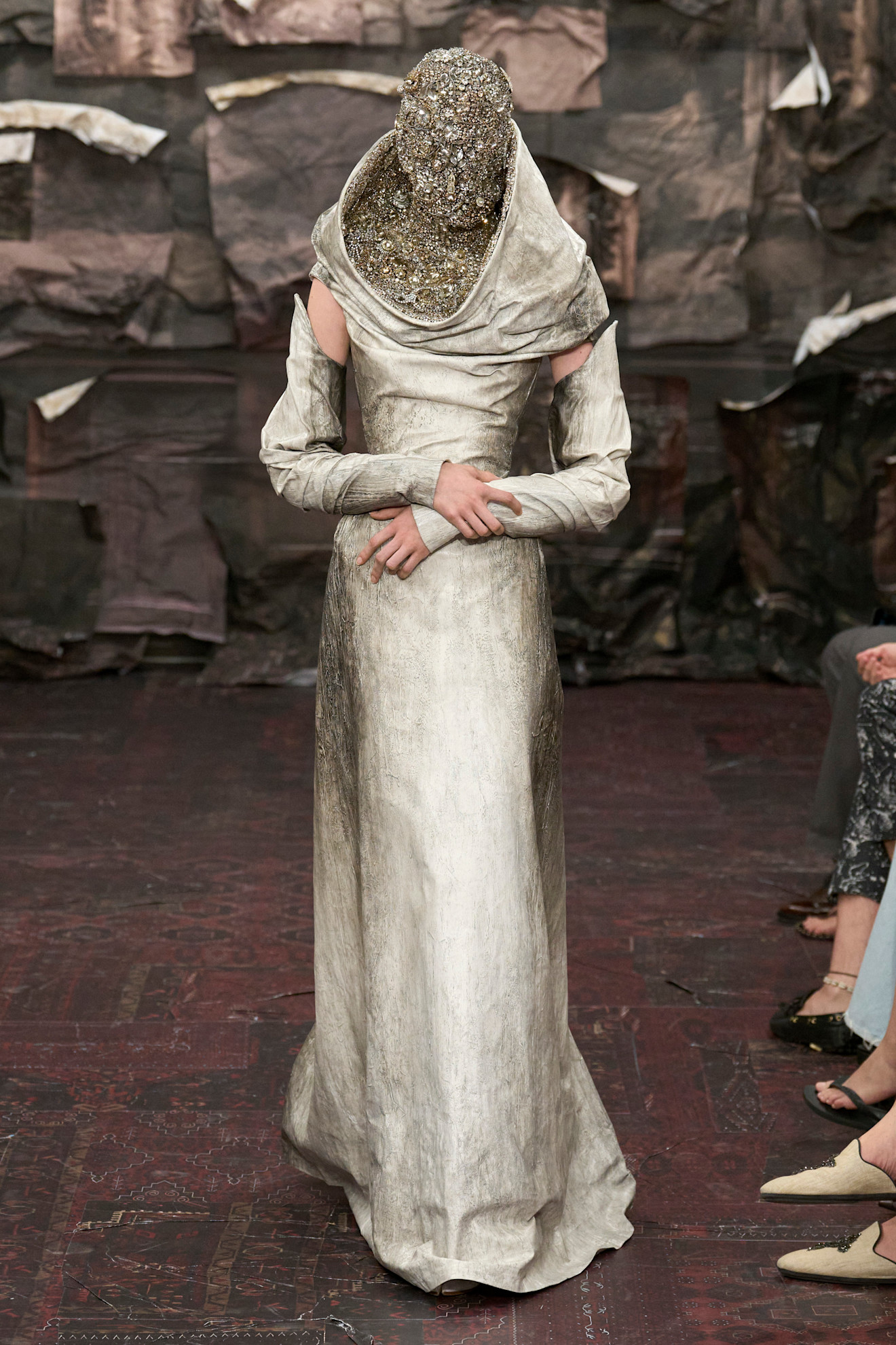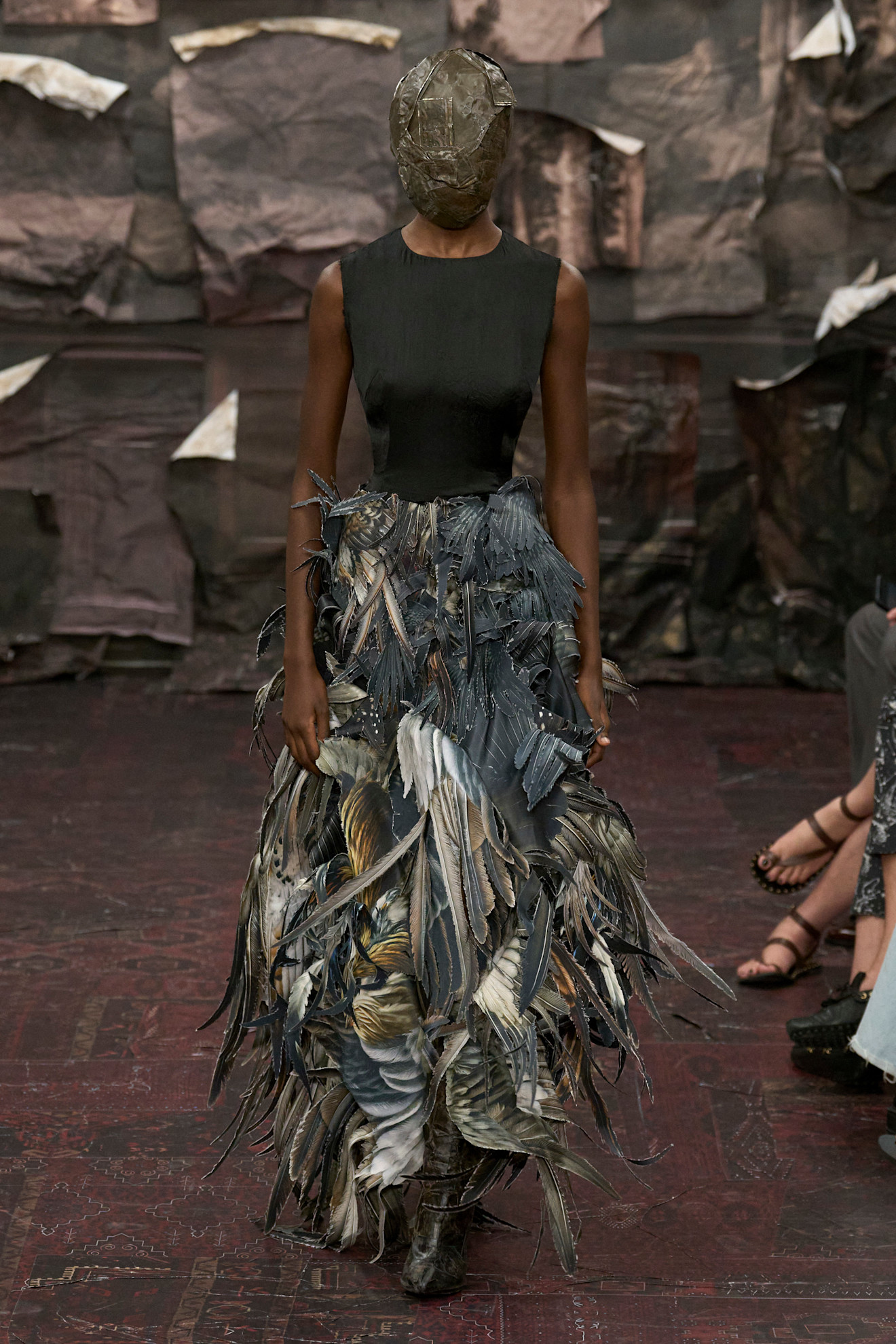 خرجت العارضات من مدخل مزخرف، متألقات بفساتين طويلة التنانير من قماش التويد الناعم، مع لمسات من البريق وخصلات من الريش. ووضعن كعكات شعر مشدودة وأحذية طويلة، تركت آثارًا على شكل حرف U في الكعب على السجادة الفخمة.