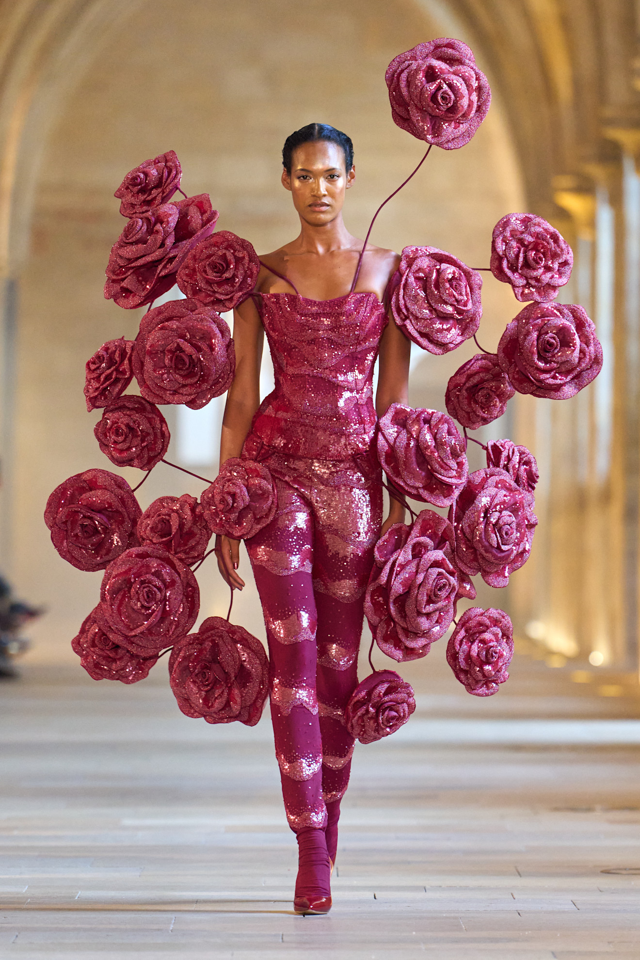 تكمن براعة رولان في قدرته على موازنة التوتر مع الزخرفة. تُصمّم تصاميمه كالآلات، لكنها تُنجز بإتقانٍ كالأحلام. تتفتح أزهار عملاقة من الخصر، وتمتد خيوط حريرية كحركات راقصة مُصممة، وتضفي الإكسسوارات – دبابيس الماس، والميداليات الذهبية، والسترات الاحتفالية – إشراقة على المشهد.