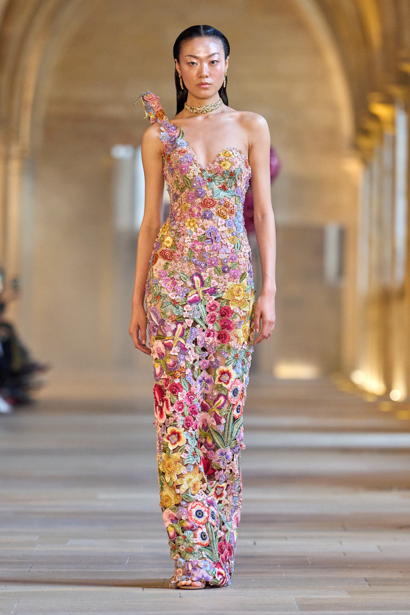 بدت التصاميم التي استوحاها محمد آشي من الثقافات القديمة وأعمال المصوّرين المبدعين في باريس، وكأنها تحتفي بالإغراء المقنّع والبذخ المتحفّظ من خلال مزيجٍ آسر من الكورسيهات الدقيقة التي تنحت القوام بأسلوب أنثوي جذاب مقرونة بتنانير غير متماثلة الطول، تبرز فيها تفاصيل كبيرة إما على شكل قطارٍ طويل منفوخ من الخلف أو مزيّن بأشكال فنيّة مبتكرة أو طبقات من الكشاكش.