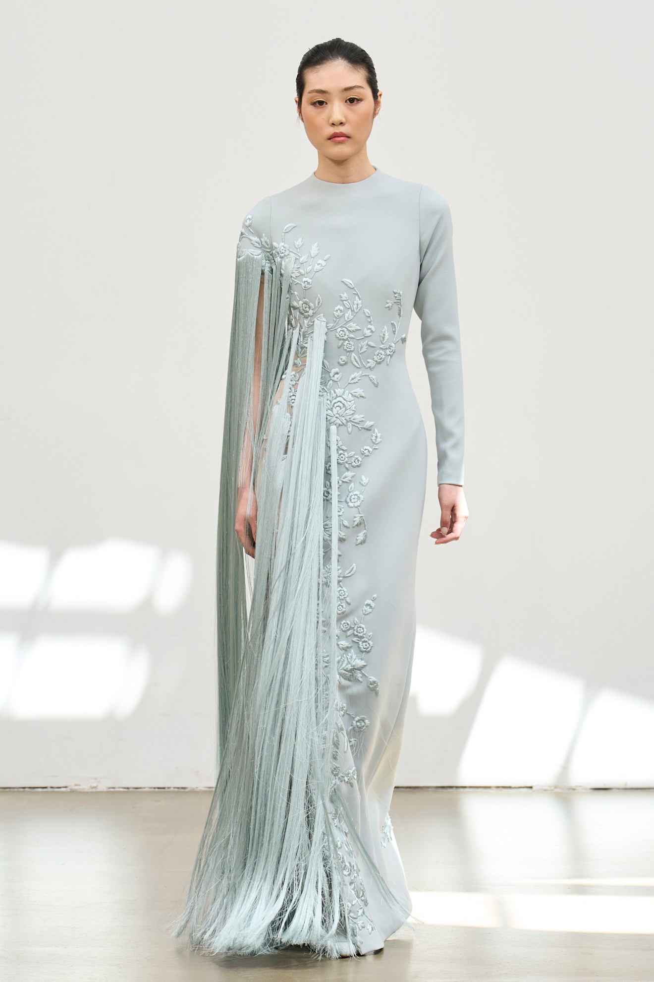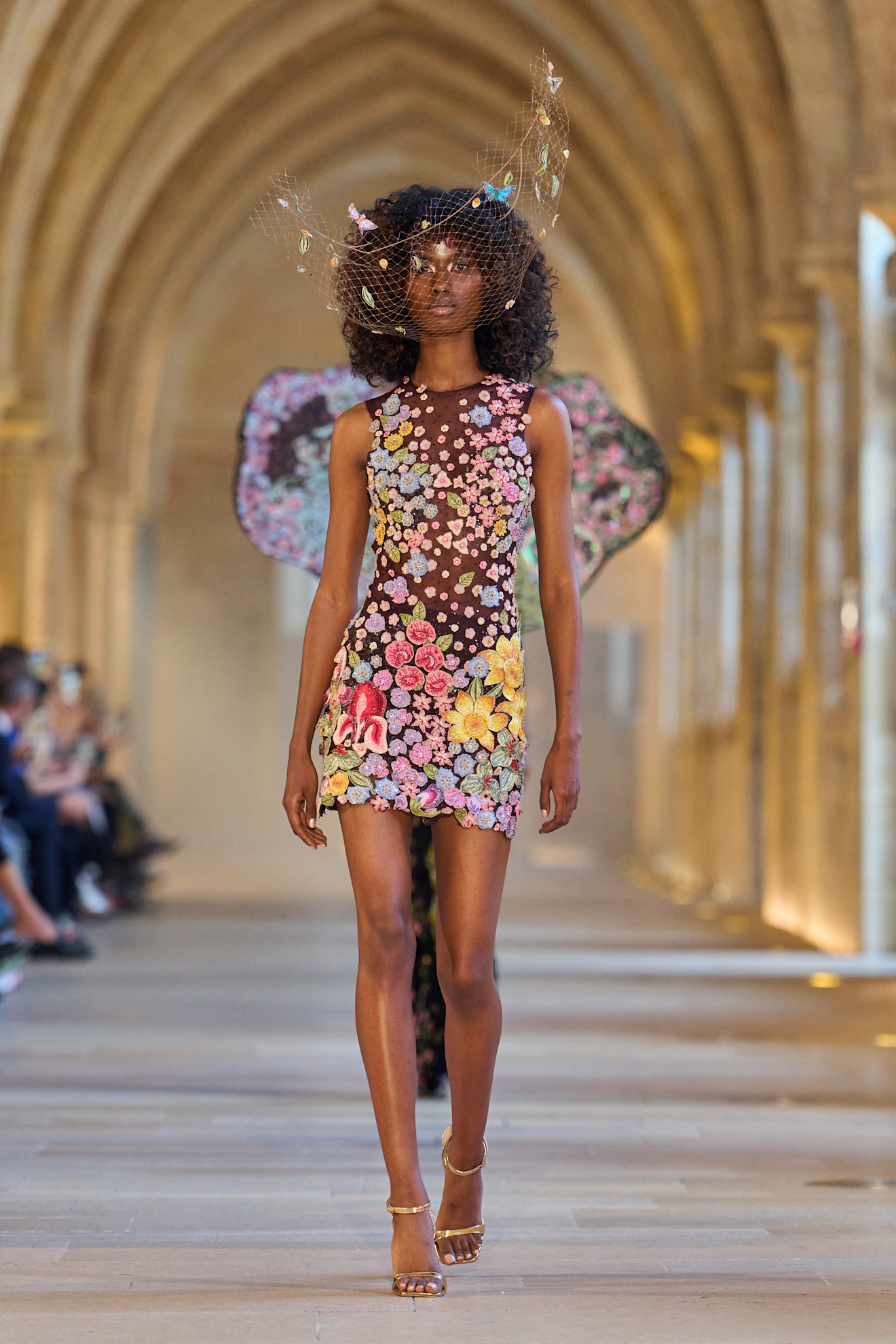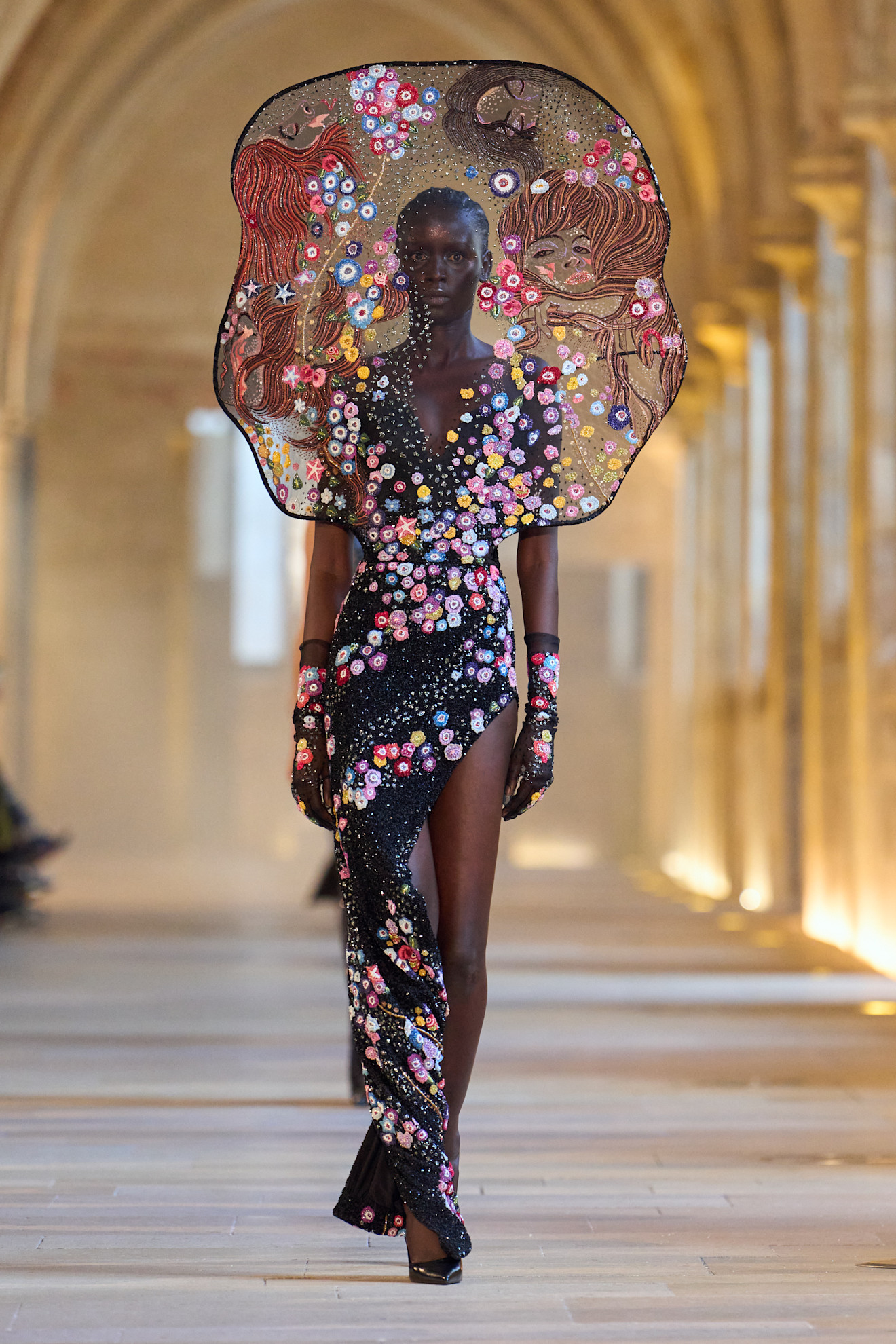 الأسود، هو النغمة السائدة في المجموعة، كذلك تألق اللون الأحمر على منصة العرض بنفحات زاهية، في إشادة متناغمة بشغف إسبانيا ونبض بوليرو الناري. تتباهى المعاطف المستوحاة من مصارع الثيران بتطريزات مزخرفة، بينما تُزيّن الفساتين بالمرجان والكريستال التي تتلألأ كفولكلور إسباني. تُضفي عباءات الساموراي – المُرصّعة بالترتر الأسود والشفاف – لمسةً يابانية، مُعززةً حوار الشرق والغرب، والماضي والمستقبل الذي يُغذّي طاقة المجموعة الآسرة.