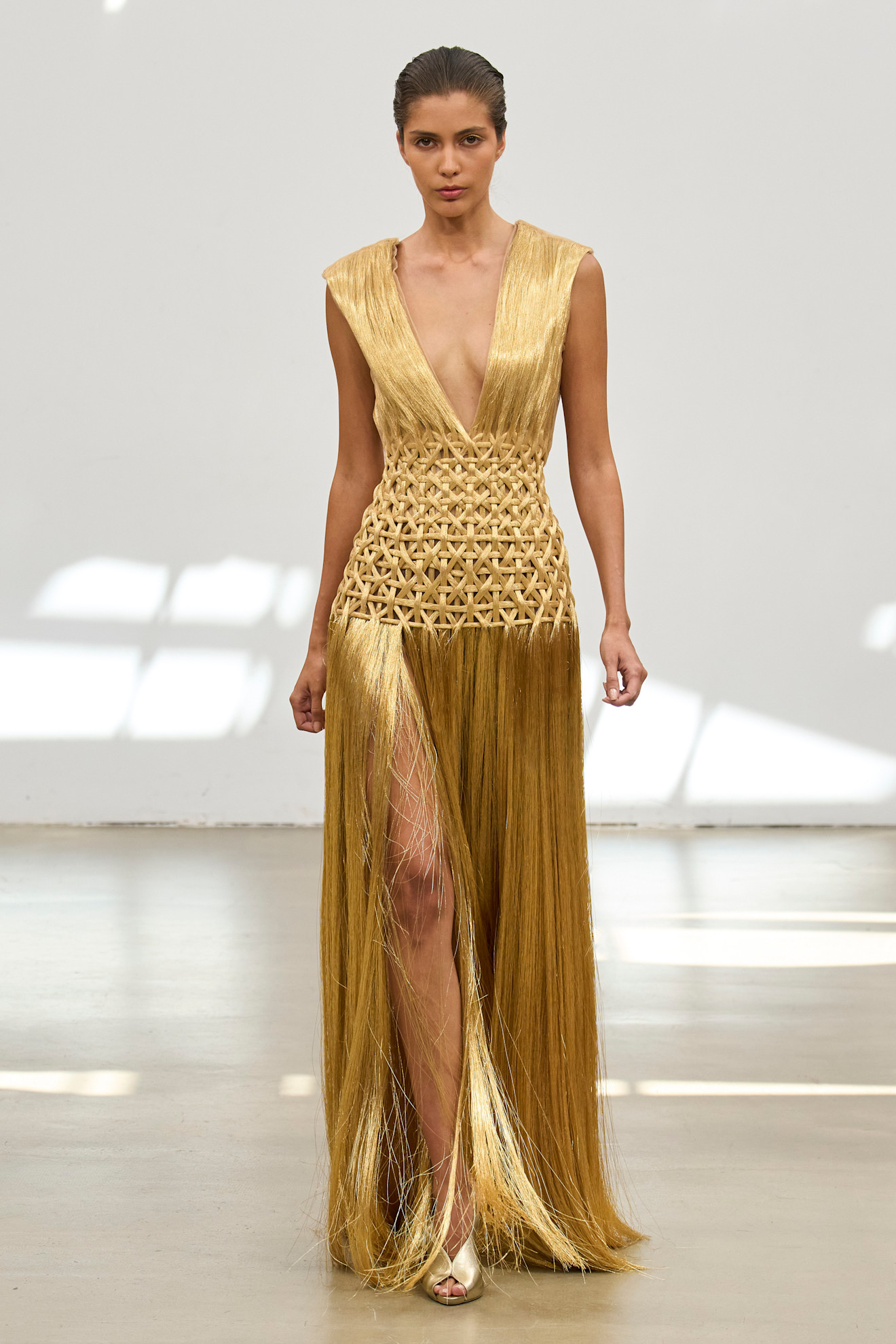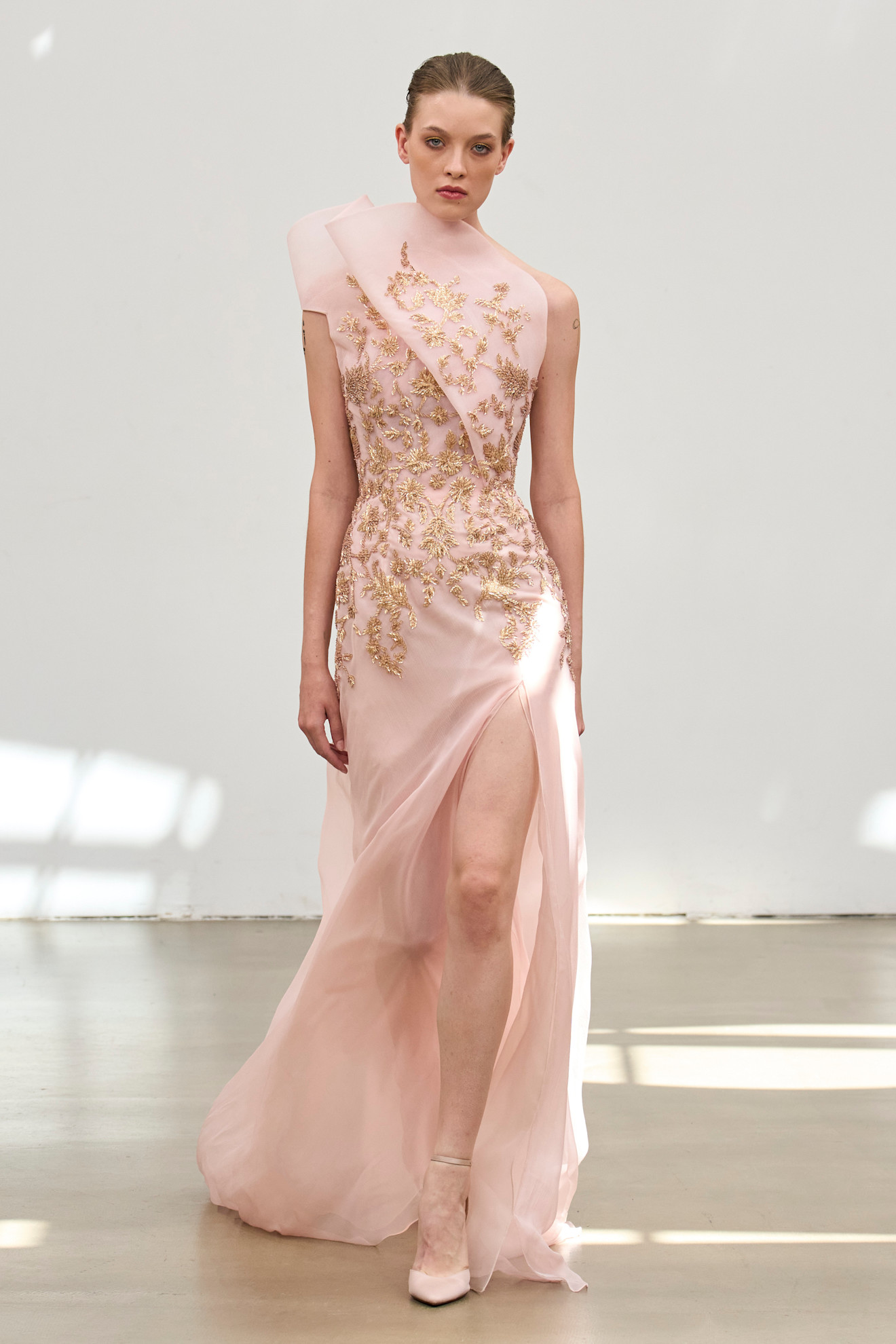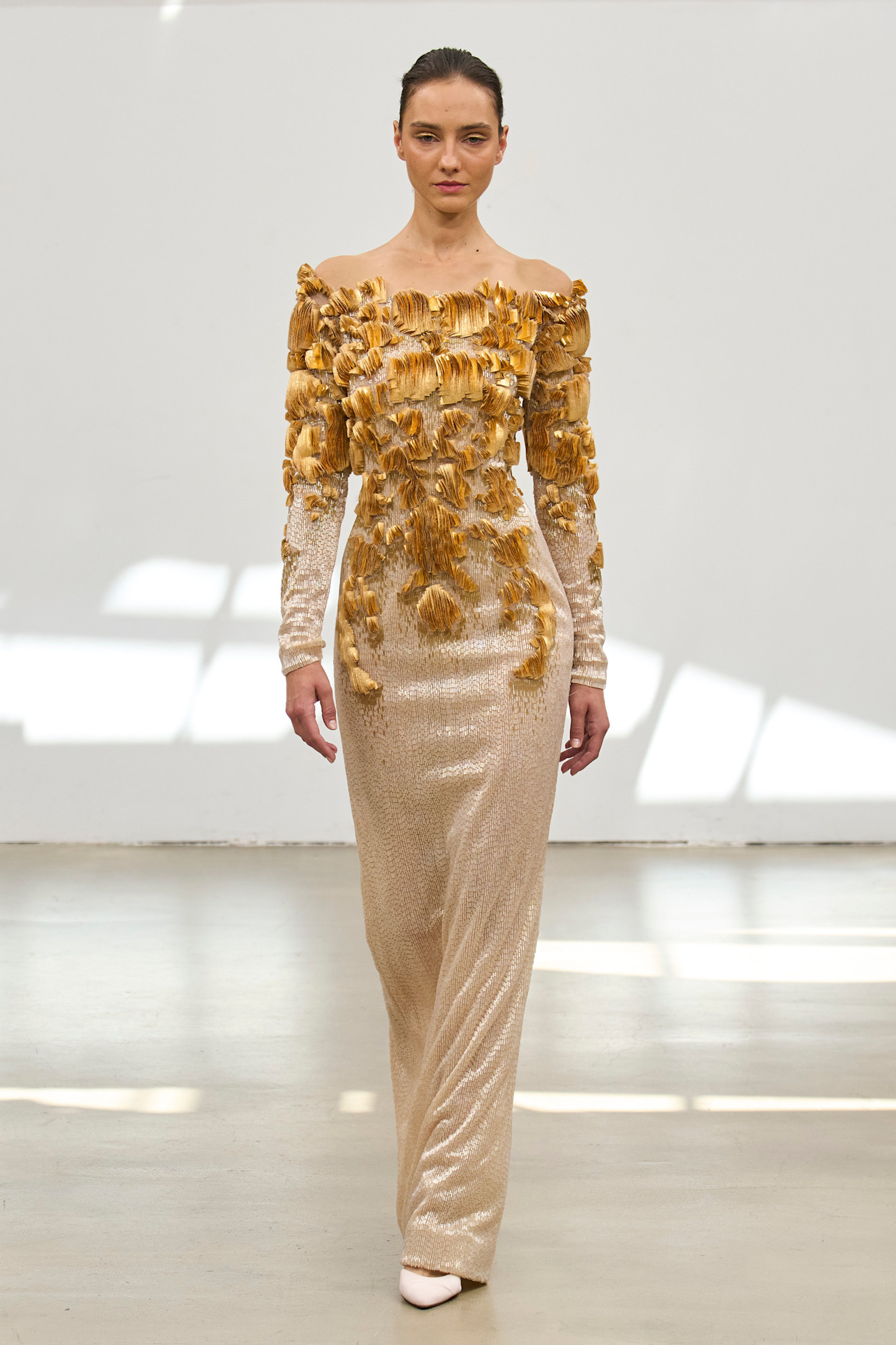 افتتح العرض بفستان على هيئة قلب ذهبي مجوّف يحيط بالجذع، بدا وكأنه درعٌ رقيق أو سجن من الحنين. هذه الإطلالة كانت بمثابة بيان افتتاحي قوي عن الموضوع المحوري للمجموعة، الحب بجنونه، وهشاشته، ودراميّته.