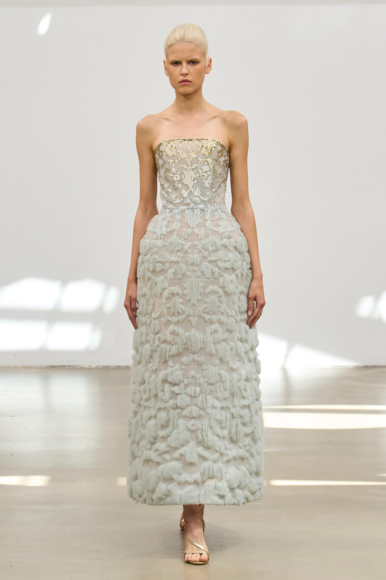 وفي الفساتين التالية، تحولت العواطف إلى فسيفساء لونية تتراقص على أقمشة حالمة، كانت أنماط التكرار والتراكم تُحاكي تصاعد المشاعر، فالهوس كان يُجسّد في زخارف مذهّبة تتكاثف حتى تخنق حدود الفستان، وكأن الحب ذاته يفيض عن الجسد ولا يُحتمل.