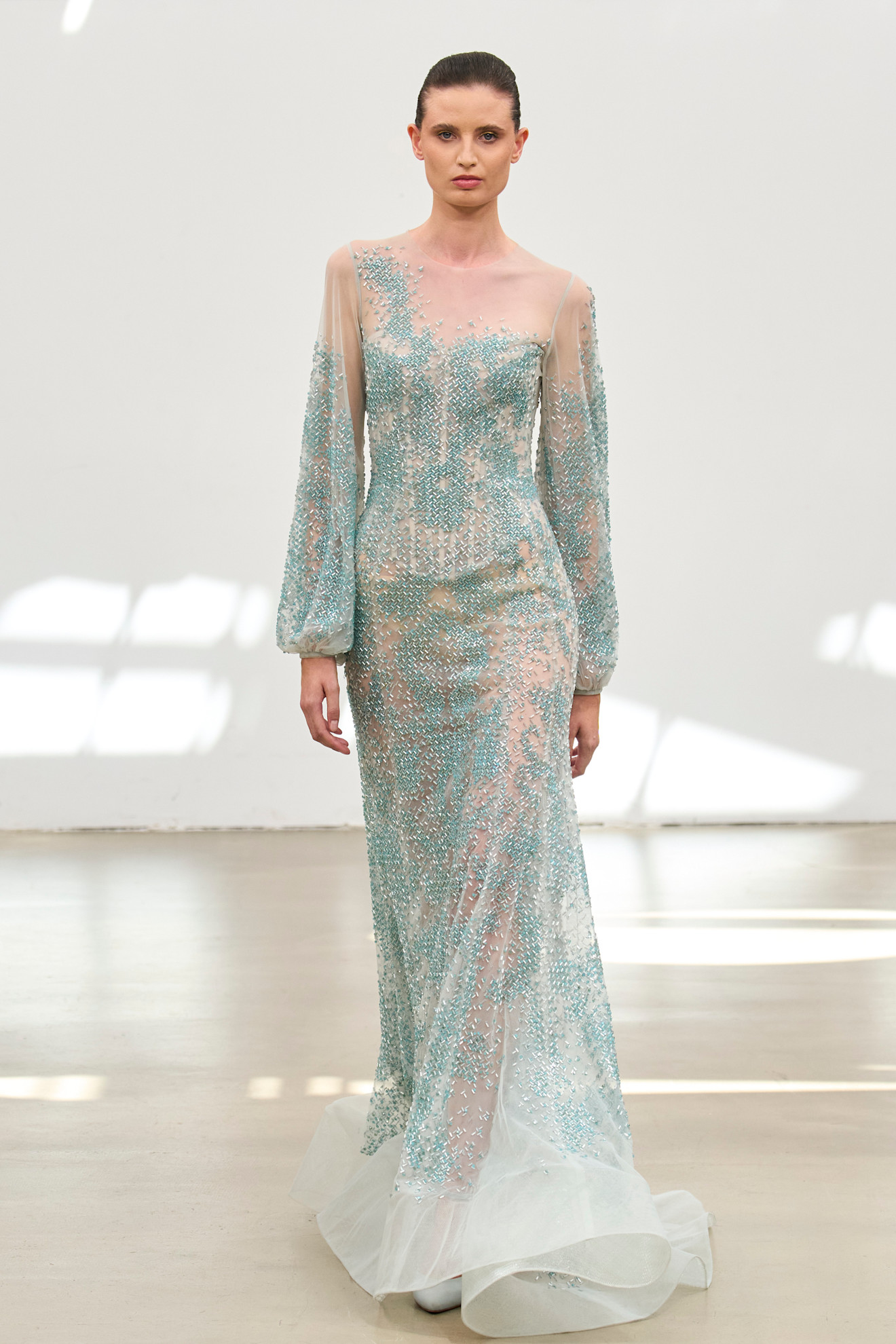 سيطرت على المجموعة ثنائية الأبيض والأسود، كخيار جمالي واعٍ يعكس الرغبة في تجريد التصاميم من الزمن، والسماح لها بالتحدث بلغة المفهوم. اختفى اللون، لتحل محله التفاصيل المعمارية، والأقمشة الفاخرة مثل التول الشفاف، الكريب، الساتان، والفراء، إضافة إلى الزينة المعقدة من اللؤلؤ والخرز والمرايا. كما برزت بعض الإطلالات الجريئة باللون الأحمر لتكسر الكلاسيكية.