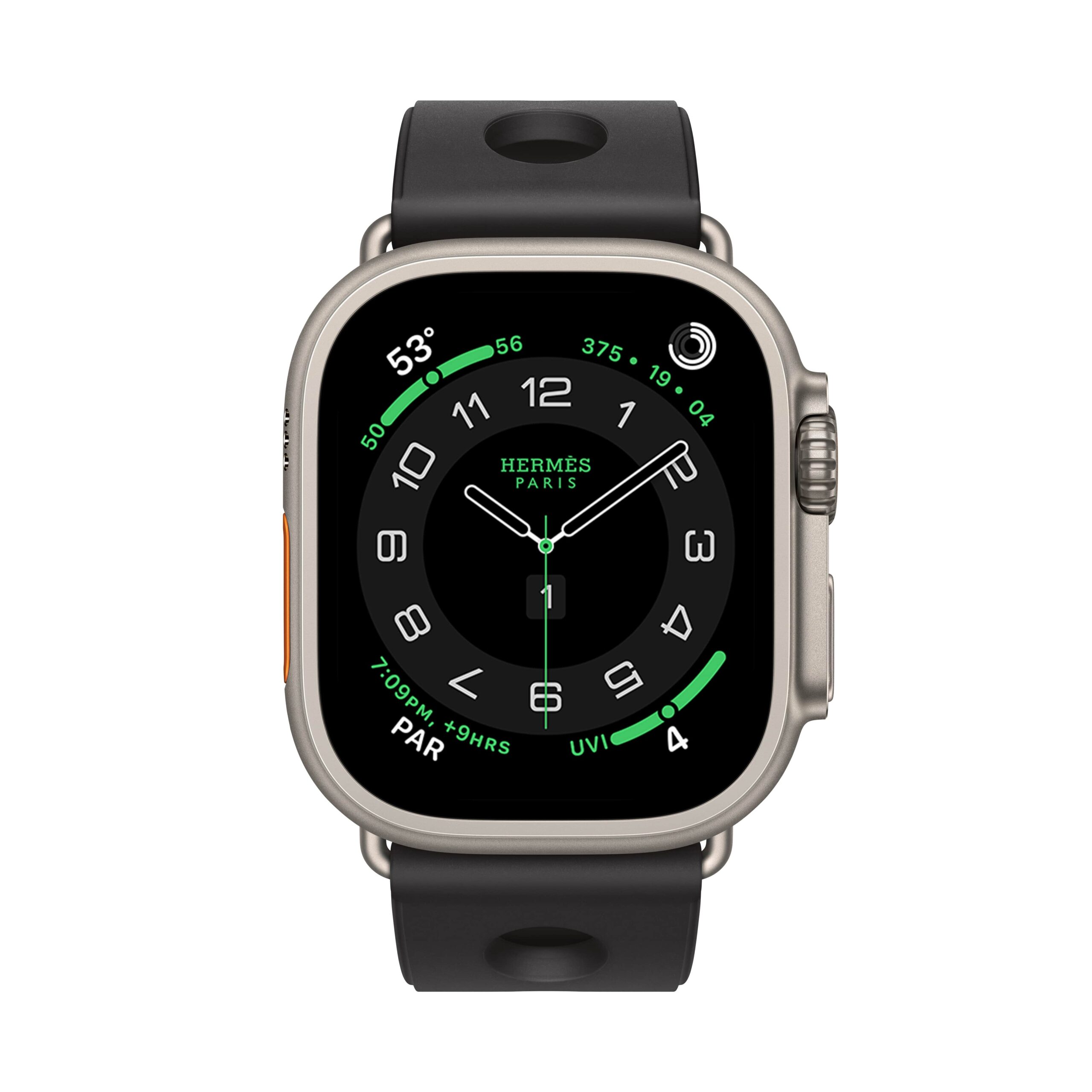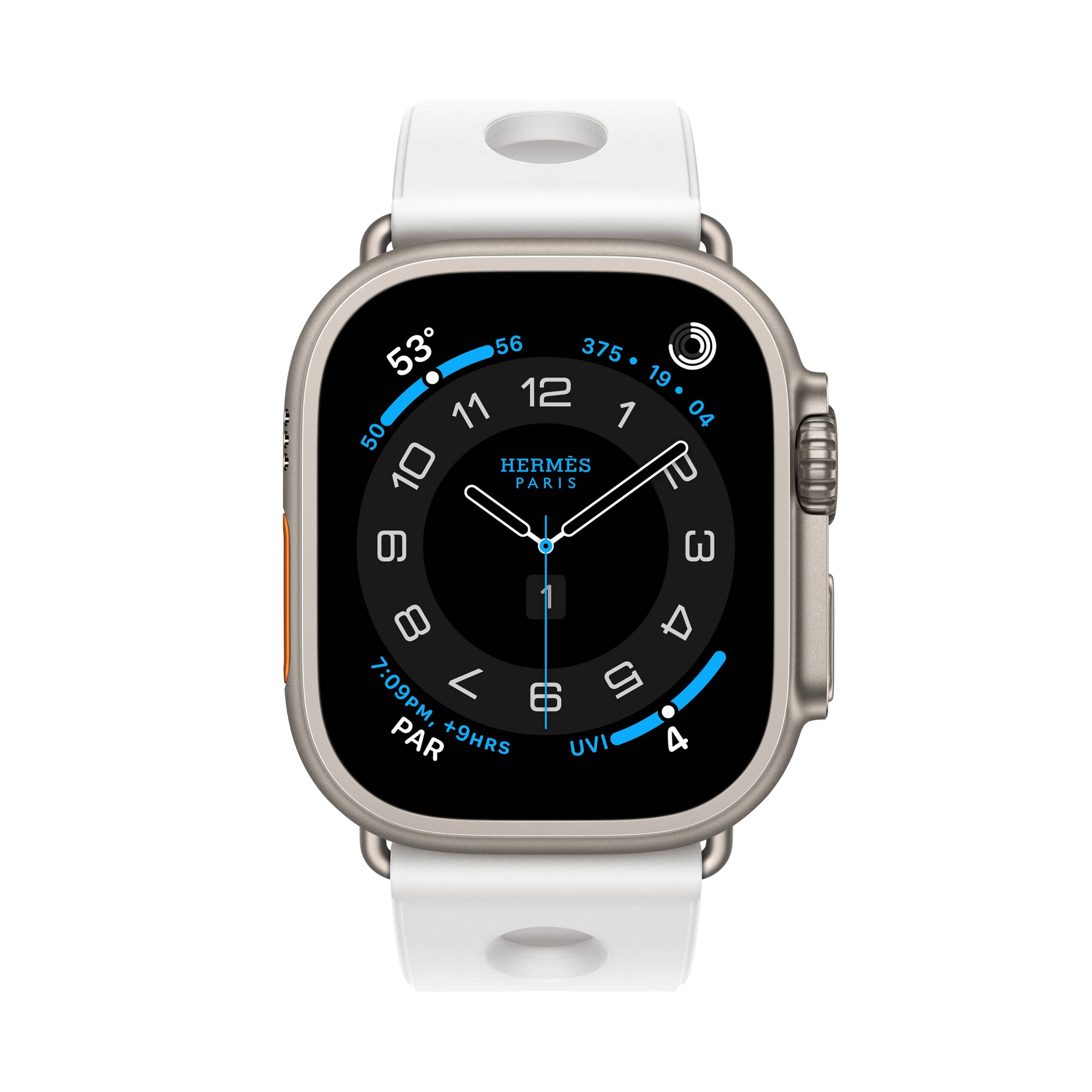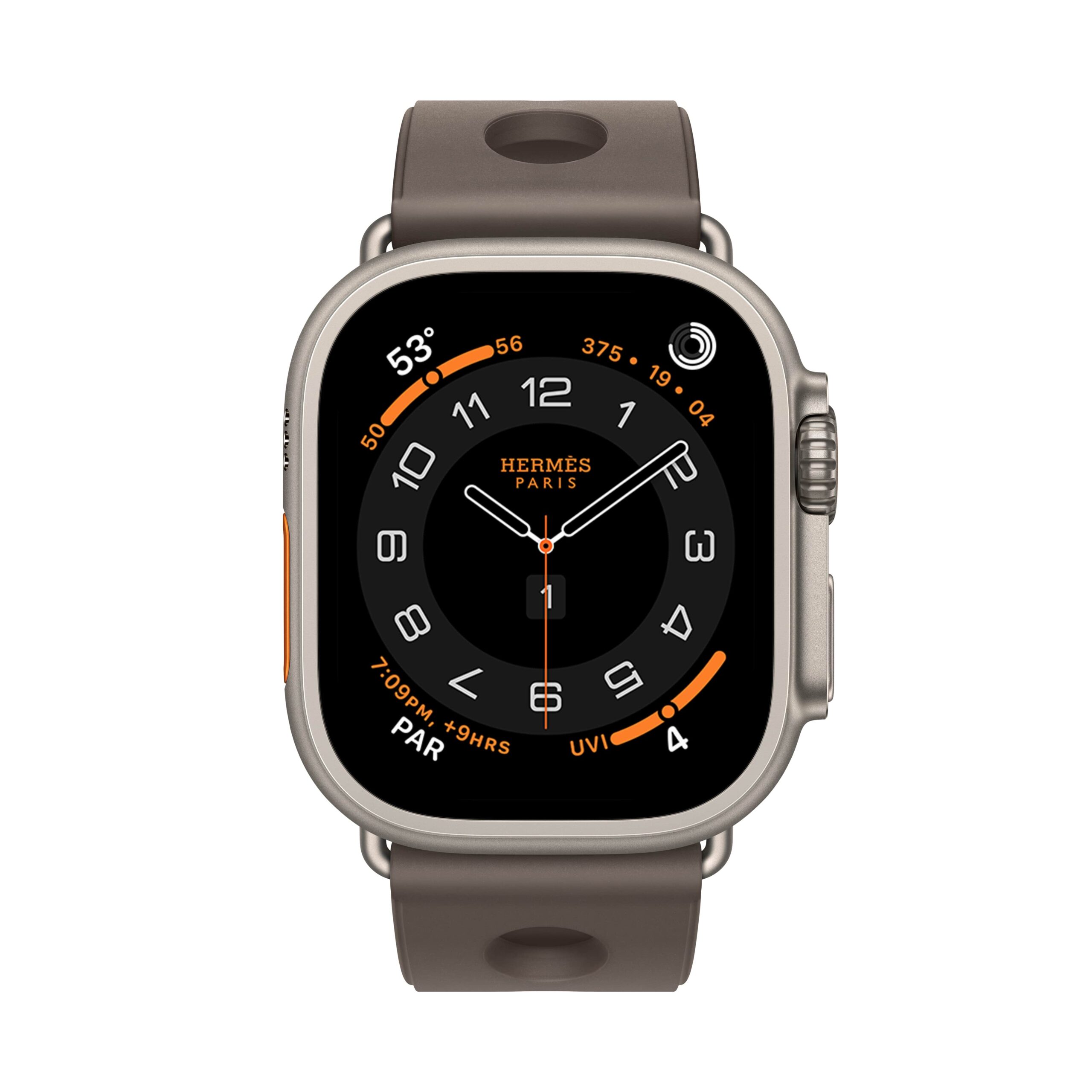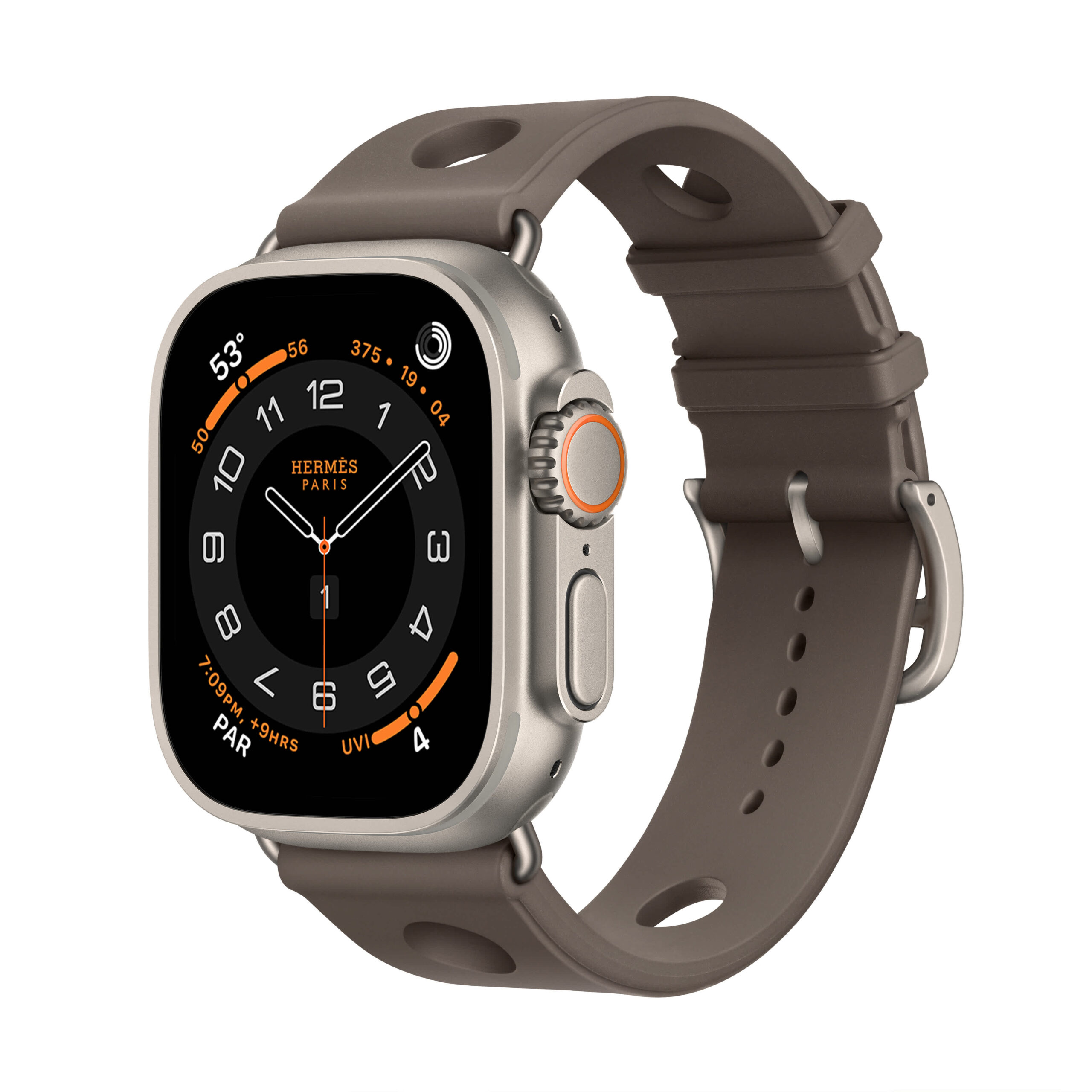 من أجل المغامرين، يأتي إصدار Apple Watch Hermès Ultra بسوار جديد من المطاط ذي ثقوب دائرية مستوحاة من الروح البحرية. يتميّز بخفة فائقة على المعصم وبمشبك من التيتانيوم، ما يجعله الرفيق المثالي لعشاق الغوص والمغامرات البحرية.