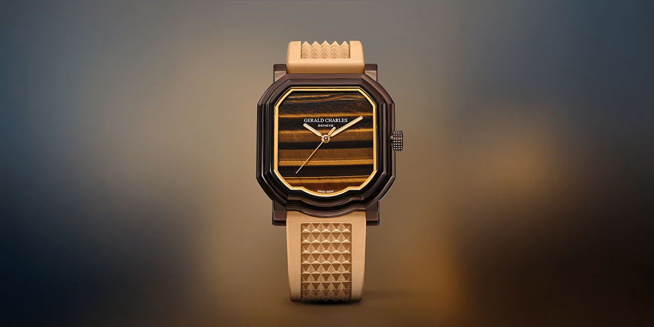 يُؤطَر حجر عين النمر داخل علبة Maestro الأيقونية، المشهورة بخطوطها المعمارية الانسيابية. في هذا الإصدار، تقدم جيرالد تشارلز لأول مرة تشطيب Colormix على العلبة، يمنحها لونًا برونزيًا معدنيًا داكنًا جرى تطويره من خلال مزيج خاص من المعالجات الكيميائية والفيزيائية. على الرغم من أنّ هذا التشطيب استُخدم سابقًا على المكونات الداخلية فقط، فقد جرى تعزيز متانته خصيصًا للاستخدام الخارجي، مما أضفى على العلبة دفئًا مميزًا ومقاومة عالية للخدش. يكتمل التصميم مع إبزيم باللون البني الداكن يتناغم مع سوار مطاطي مفلكن بلون الرمال بملمس مطفأ خفيف، يستحضر سحر المناظر الصحراوية الذهبية في دولة الإمارات العربية المتحدة. ليشكّل الميناء والعلبة والسوار معًا رواية بصرية متكاملة تمزج بين التراث والحداثة، وبين الحرفية والجمال الطبيعي.