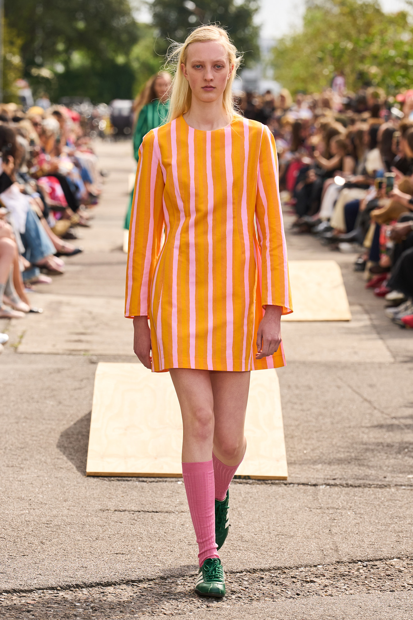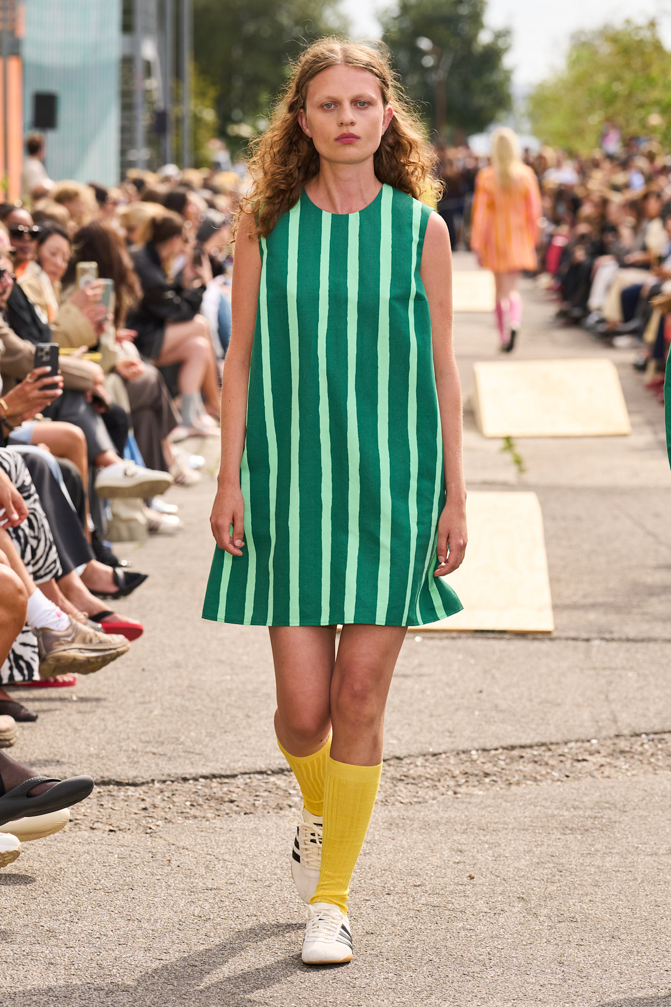 أما علامة Marimekko فعادت هذا الموسم بعنوان عمليّ واضح عن الطباعة: Art of Pattern — حيث كرّرت ومَزَجت طبعاتها الغرافيكية الشهيرة مع مقاييس متغيّرة تجمع الأحجام الصغيرة مقابل الكبيرة، التصاميم القصيرة مقابل الماكسي لتؤكد أنّ الطباعة ليست مجرد زخرفة بل لغة تصميمية قائمة بذاتها. العروض ركّزت على الحِرفية في إعداد المطبوعات وتفكيك العلاقة بين اللون والشكل كعنصر أساسي للهوية.