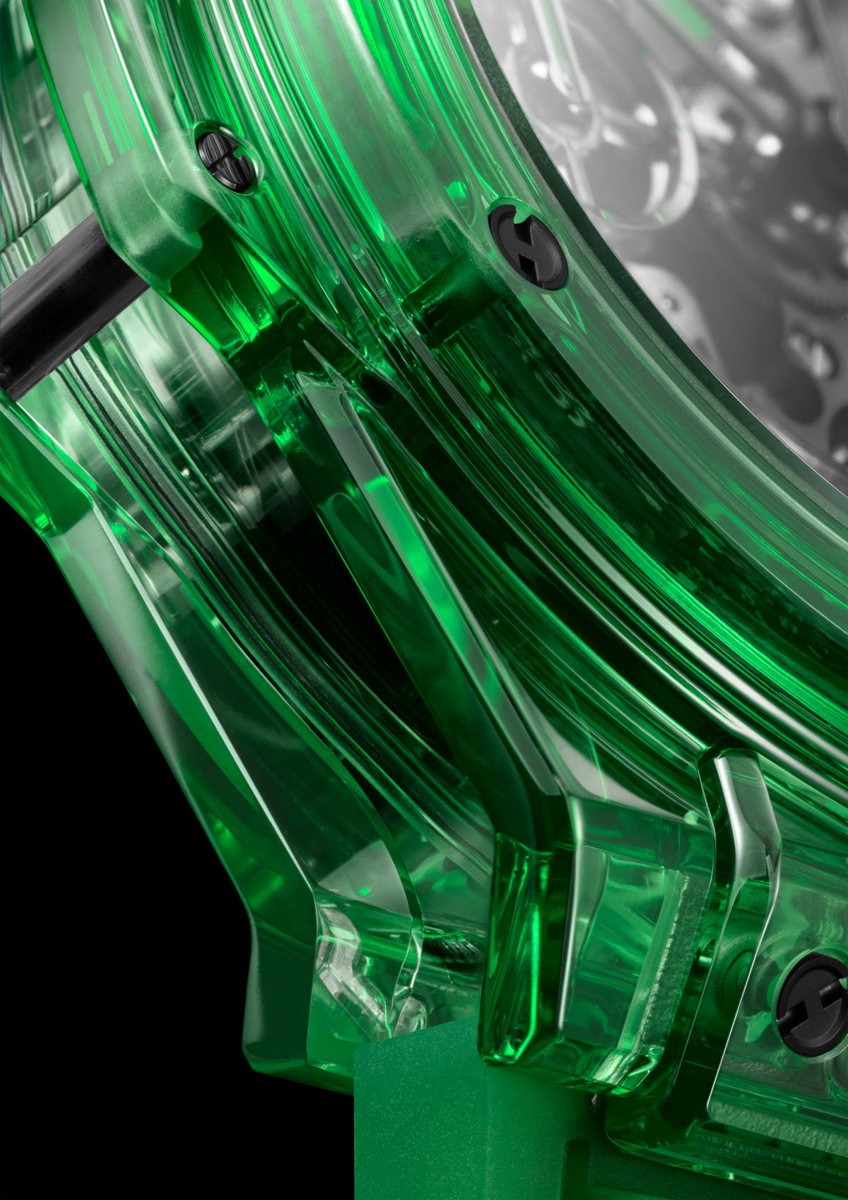 لا يختلف اثنان على أنّ ابتكار لون غير مسبوق من مادة SAXEM كان تحدياً كبيراً بكلّ معنى الكلمة، إذ دأبت هوبلو على تطوير لون جديد من هذه المادة منذ العام 2019 ، حين طرحتها للمرة الأولى في ساعة Big Bang MP-11 ، ومنذ ذلك الحين، طوّر المصنع لونين منها هما الأصفر والزمردي. صحيحٌ أنّ هذه المادة تضاهي الصفير من حيث قدرة المقاومة، غير أنّها تختلف عنه من حيث اللمعان إذ تفوقه لمعاناً وإشراقاً. كما أنّ قوامها تتخلّله نسبة أقلّ من الخطوط، ما يجعلها أكثر تجانساً ونعومةً. بذلك، ترسم هوبلو مستقبل الساعات مع مادة SAXEM التي تكشف عن منظور فني وجمالي جديد. إنّ مادة SAXEM الخضراء في ساعة Big Bang UNICO  الجديدة تلقي الضوء على عددٍ من هذه الابتكارات، أولها العلبة بقطر 42 ملم التي تمتاز بقوام صلبٍ، وتكتنز قوة SAXEM الكاملة في قطر سميك ومضغوط. لا تمتصّ هذه المادة الضوء، إنما توهم الناظر إليها بأن النور ينبثق منها. وتستقرّ مادة SAXEM الخضراء في أصغر خطوط العلبة والإطار، المثبتين بستة من براغي هوبلو الشهيرة المصنوعة من التيتانيوم على شكل حرف “H”. وقد زُوّد الحزامان بنظام التبديل السريع “وان كليك” الحائز على براءة اختراع الذي يقع عند المؤشرين 12 و6.