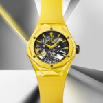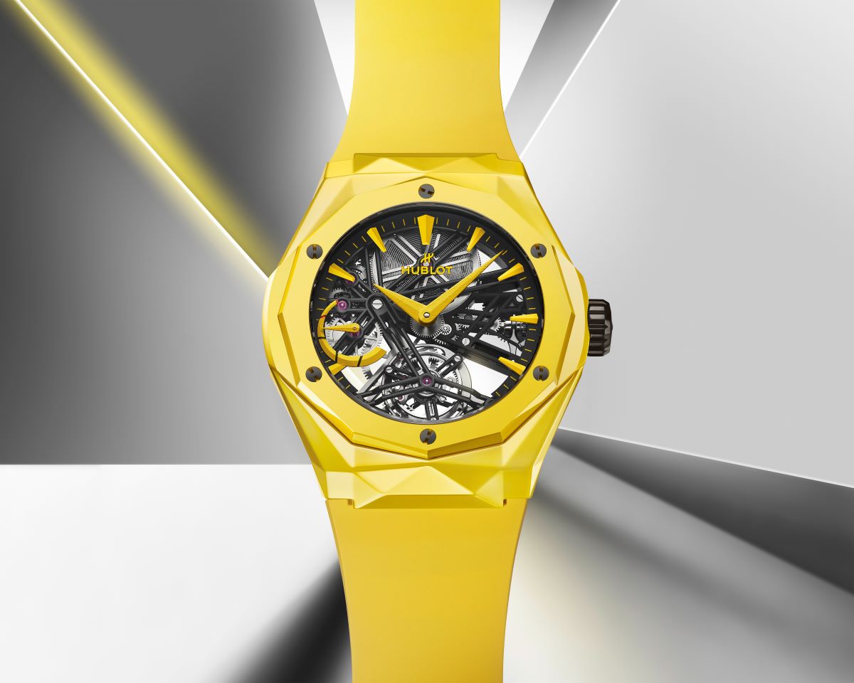 تطلّ هذه الساعة الجديدة بلونَين خارجَين عن المألوف، الأصفر المشرق والأزرق السماوي، وهما أشبه بوجهين لعملة واحدة، حيث يبرزان إمكانية ابتكار ساعة راقية وفاخرة لهواة الجمع البعيدين عن التكلّف. يأتي الإصدار الأوّل من الساعة بلونٍ أصفر مشرق، فيما تصطبغ علبتها وحزامها وإطارها وعقاربها ومؤشراتها جميعها بلونٍ أصفر نابض بالحياة. وبالنسبة إلى القلب النابض للساعة، فلا يزال يتمثل في معايرة HUB6021 يدوية التعبئة المفضّلة لدى خبراء العلامة. أمّا أجزاؤها، بما فيها التاج والبراغي الستّة المصمّمة على شكل حرف “H” المتوزّعة حول الإطار، فتبدو وكأنّها معلّقة بجسور هيكلية سوداء اللون معالجة باستخدام تقنية الترسيب الفيزيائي للبخار. يتمركز بين مؤشّرَي الساعة 8 و9 مؤشّر احتياطي الطاقة الذي يبيّن احتياطي طاقة يدوم لخمسة أيام، بينما تتربّع حركة التوربيون عند مؤشّر الساعة 6. وتزدان الساعة بكريستال الصفير في الجانبَين الأمامي والخلفي منها، فتعكس الضوء وتتلألأ بريقاً وجاذبية.