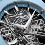 مع هذا الإصدار الثاني، تراهن علامة هوبلو مع الفنّان ريشار أورلينسكي على تحقيق نجاح باهر، فيطلّ الإصدار الأوّل بلونه الأصفر المشرق ليمهّد الطريق للإصدار الثاني بلونه الأزرق السماوي. وطُليت جسور الساعة بطبقة من الروديوم الفضي، ما يبرز التأثير المصقول اللامع والزخارف النافرة التي يزدان بها كلّ جزء من أجزائها. أمّا التباين، فيتوارى وراء التناغم اللوني، ففي مقابل الإصدار الأصفر المشرق من ساعة Classic Fusion Tourbillon Orlinski، يطلّ الإصدار الثاني بلونه الأزرق السماوي ليكمّلا بعضهما مثلما تتناغم الشمس الصفراء الساطعة مع السماء الزرقاء. وفي هذا التناغم يُترجم “فنّ الانصهار”، فبالرغم من الاختلاف الكبير الكامن ما بين هذين اللونين، إلا أنهما مرتبطان ببعضهما البعض ارتباطاً دائماً، إذ يرمز الأوّل إلى السماء الصافية زرقاء اللون، بينما يمثّل الثاني الشمس بخيوطها الذهبية. ولك حرية الاختيار! لكن ما عليك معرفته أنّه سيتم إنتاج 30 قطعة فقط من كل إصدار!