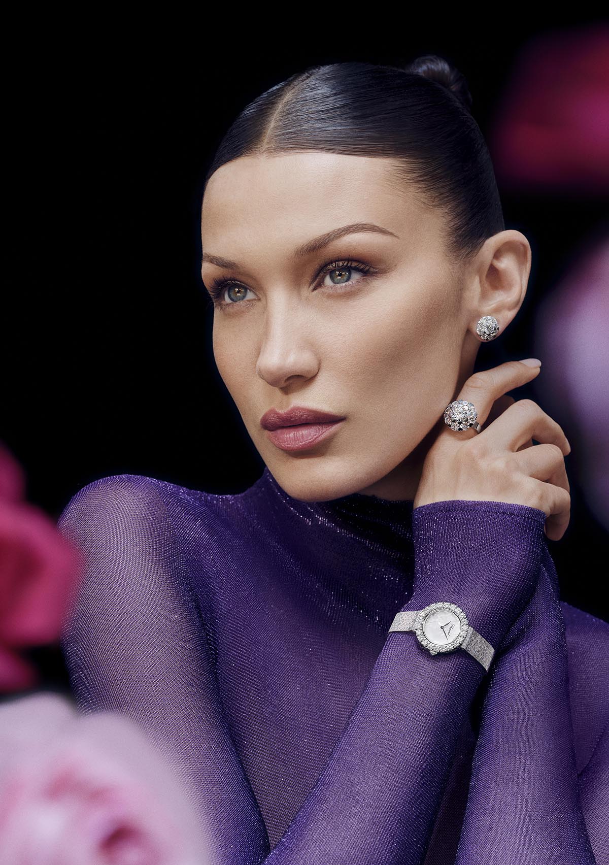 كوجه عالمي للحملة، تجسّد بيلا حديد روح المجموعة في صور تتأرجح بين الجرأة والأنوثة، بعدسة إيثان جيمس غرين، محاطة بالزهور كرمز للبهجة والحياة، تماماً مثل ساعات L’Heure du Diamant.