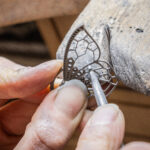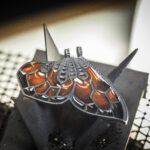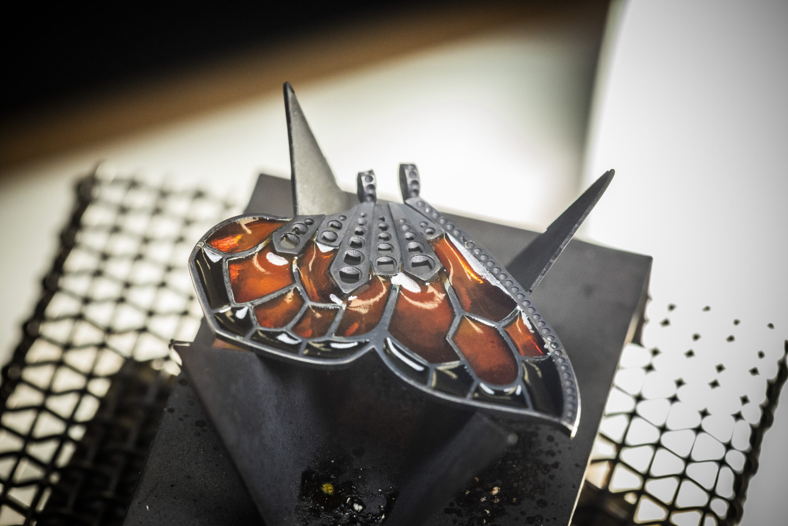 تقنية مينا بليك أجور: تسمح هذه التقنية بمرور الضوء عبر أجنحة الفراشة، كما لو كانت نافذة زجاجية ملونة. يتم تصميم النقش باستخدام هيكل مفرّغ من الذهب الأبيض، ثم تُملأ الفتحات بطبقات رقيقة من المينا الشفافة. تُسخّن كل طبقة في الفرن بعد كل مرحلة، لتكشف عن كثافة الألوان وعمقها، مانحةً تأثيرًا شفافًا يتباين مع عناصر المينا السوداء المعتمة، ومُضفية على الفراشة ملامح واقعية تخطف الأنفاس.