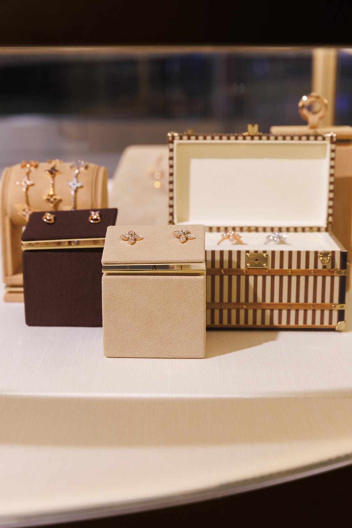 تم تصميم هيكل نافذة المجوهرات الموقتة بأسلوب عصري للغاية، ويتميّز بتصميم متراكب من المعدن المصقول باللونين الذهبي والفضي، ليأخذ شكل زهرة Monogram الأيقونية الخاصة بدار لويس فويتون. لا يقتصر الأمر على العرض، بل يمتد ليشمل تجربة تفاعلية؛ حيث سيدعو المعرض العملاء لاكتشاف تشكيلة من المجوهرات وقطع الأمتعة الصلبة المنتقاة بعناية.