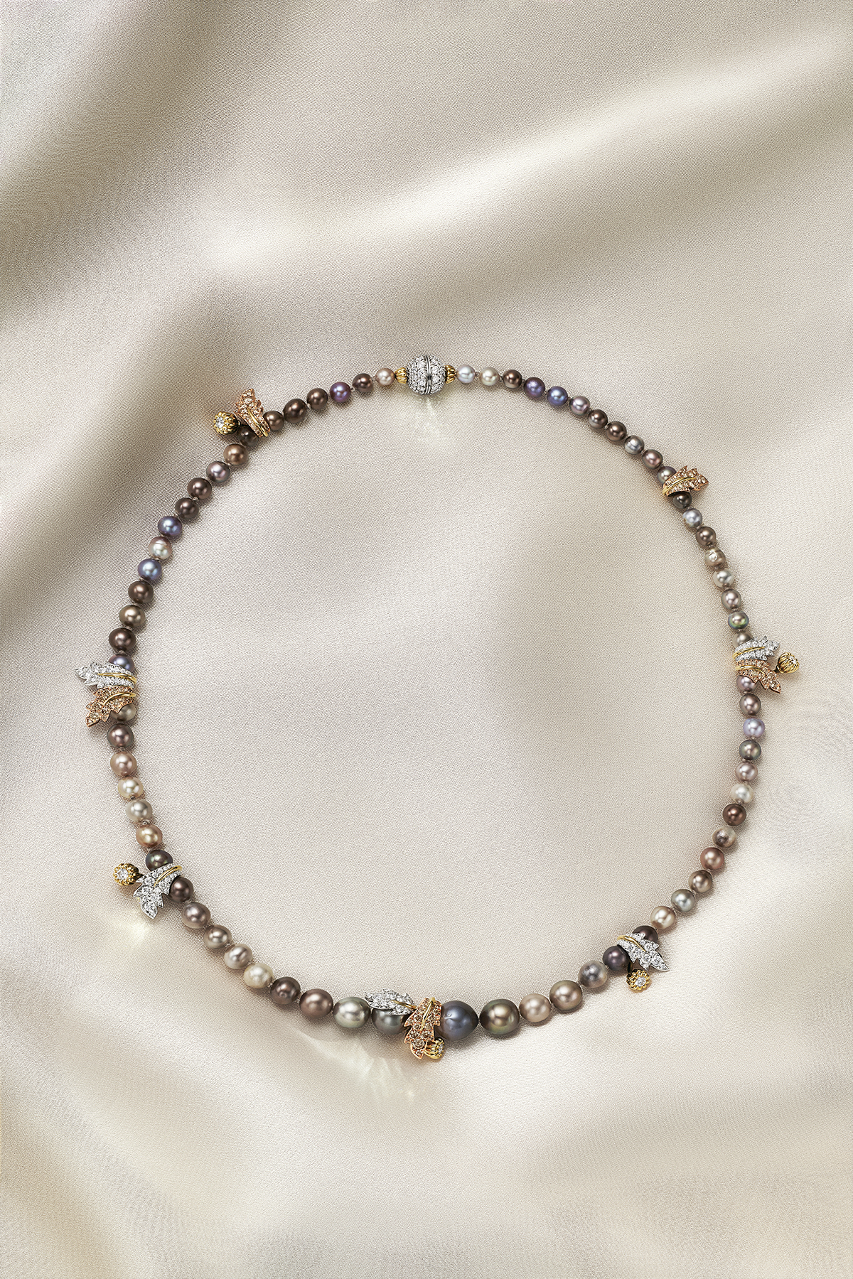إلى جانب القطع الفردية المذهلة، تشمل مجموعة «بيرد أون أ بيرل» لعام 2025 عقدًا فاخرًا من نوع «سوتوار» Sautoir، يتميّز بتدرجات رائعة من اللآلئ الطبيعية المستخرجة من المياه المالحة، تتراوح بين الأصفر الدافئ والأبيض النقي، بإجمالي وزن يتجاوز 113 قيراطًا. تبُرز جاذبيته الاستثنائية من خلال ألماس الكونياك والألماس الأبيض، ما يمنحه لمسة من الإشراق والفخامة الراقية.