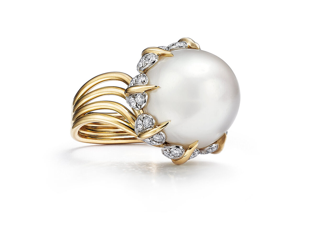 يتميّز خاتم «إنڤيرتد بيتالز» بحلقة مصمّمة بطابع شلومبرجيه الكلاسيكي، حيث تنساب الخطوط الذهبية بسلاسة طبيعية مذهلة. تتألّق الأوراق المصنوعة من الألماس، بينما تتوسطها لؤلؤة بيضاء مستديرة مستخرجة من المياه المالحة تزن أكثر من 18 قيراطًا، ما يبتكر نقطة تركيز آسرة.